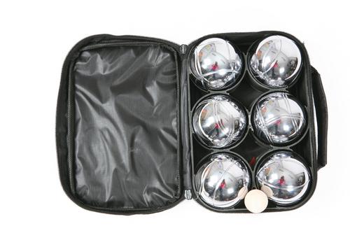 6 PETANQUEBALLEN VERCHROOMD STAAL 74 MM 720 GR. IN ETUI, MET MEETLINT