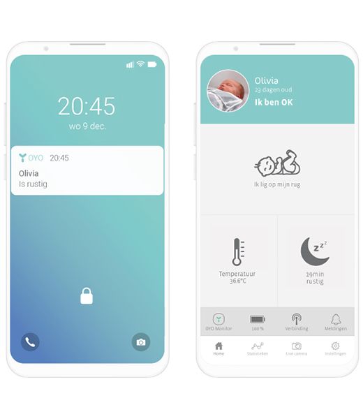 Alle metingen komen netjes in de overzichtelijke OYO app. Ontvang een melding, ook als je smartphone op stil staat, wanneer je kindje jou nodig heeft. Zo profiteer je zelf van wat meer me-time. Ontdek ook elke ochtend hoe je kindje sliep dankzij de OYO statistieken.