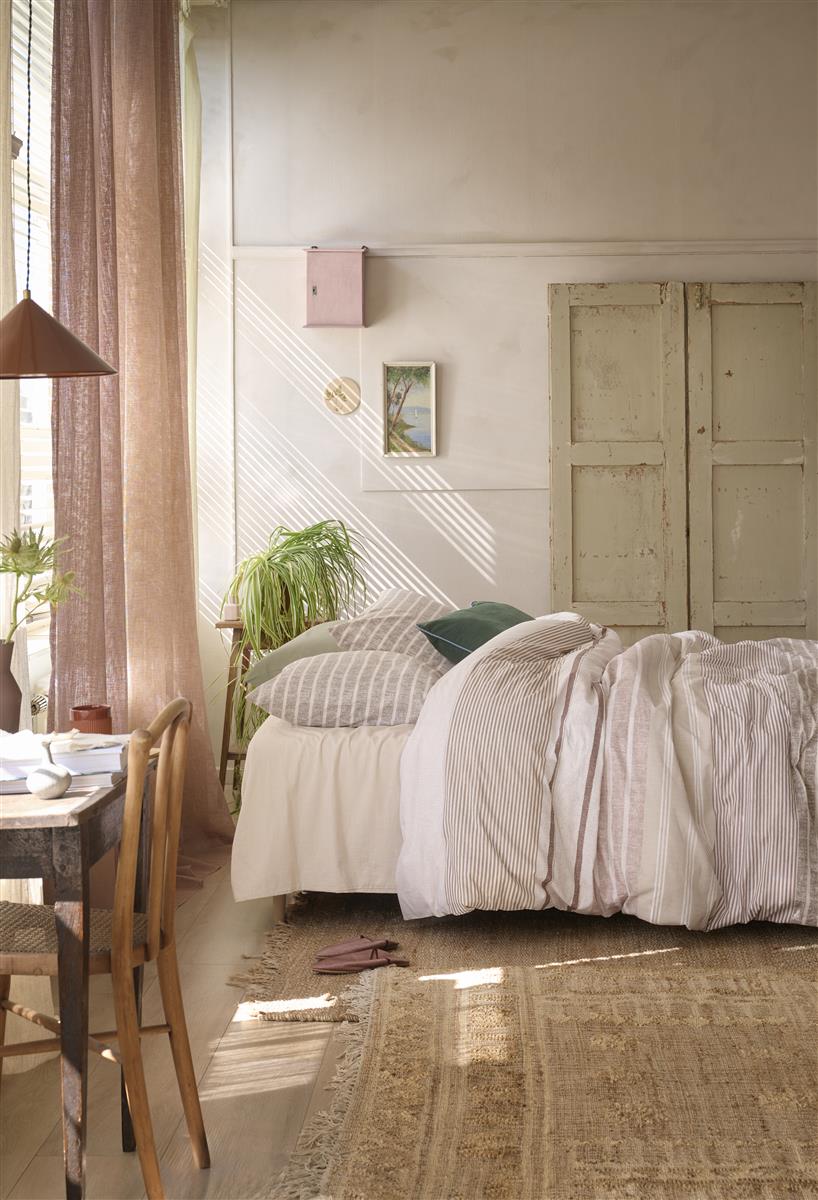 speelse print van banen en strepen. De zachte, landelijke kleuren zoals