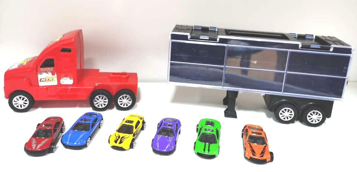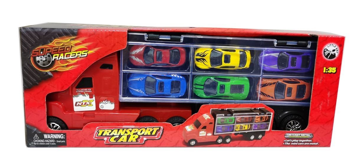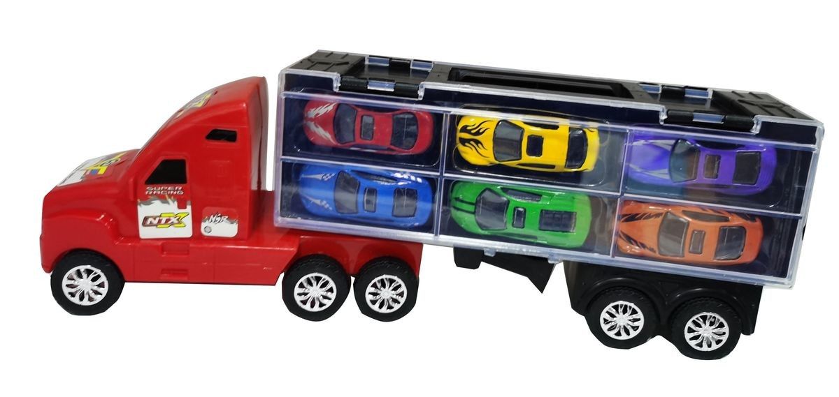 Autotransporter met 6 metalen auto's 37 cm