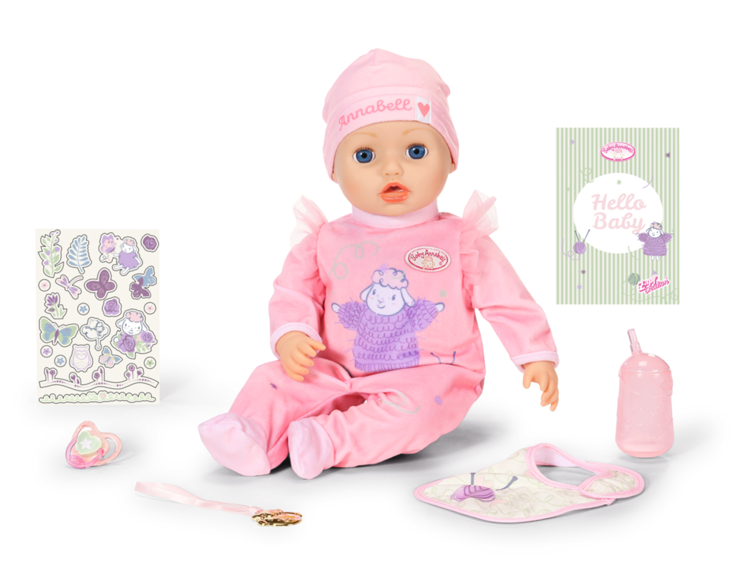 Baby Annabell Interactive Annabell (43 cm) met speelpakje en muts. Inclusief slabbetje, fles, speen, ketting en babyalbum met stickervel.