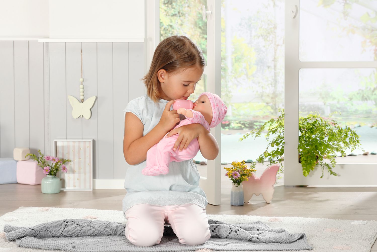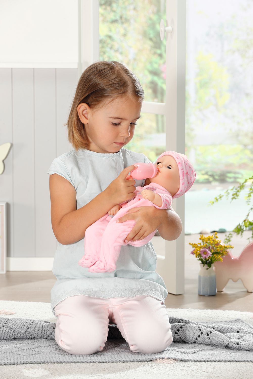 De kleine pop met het zachte, stoffen lichaam is inclusief flesje om een eerste rollenspel te stimuleren.