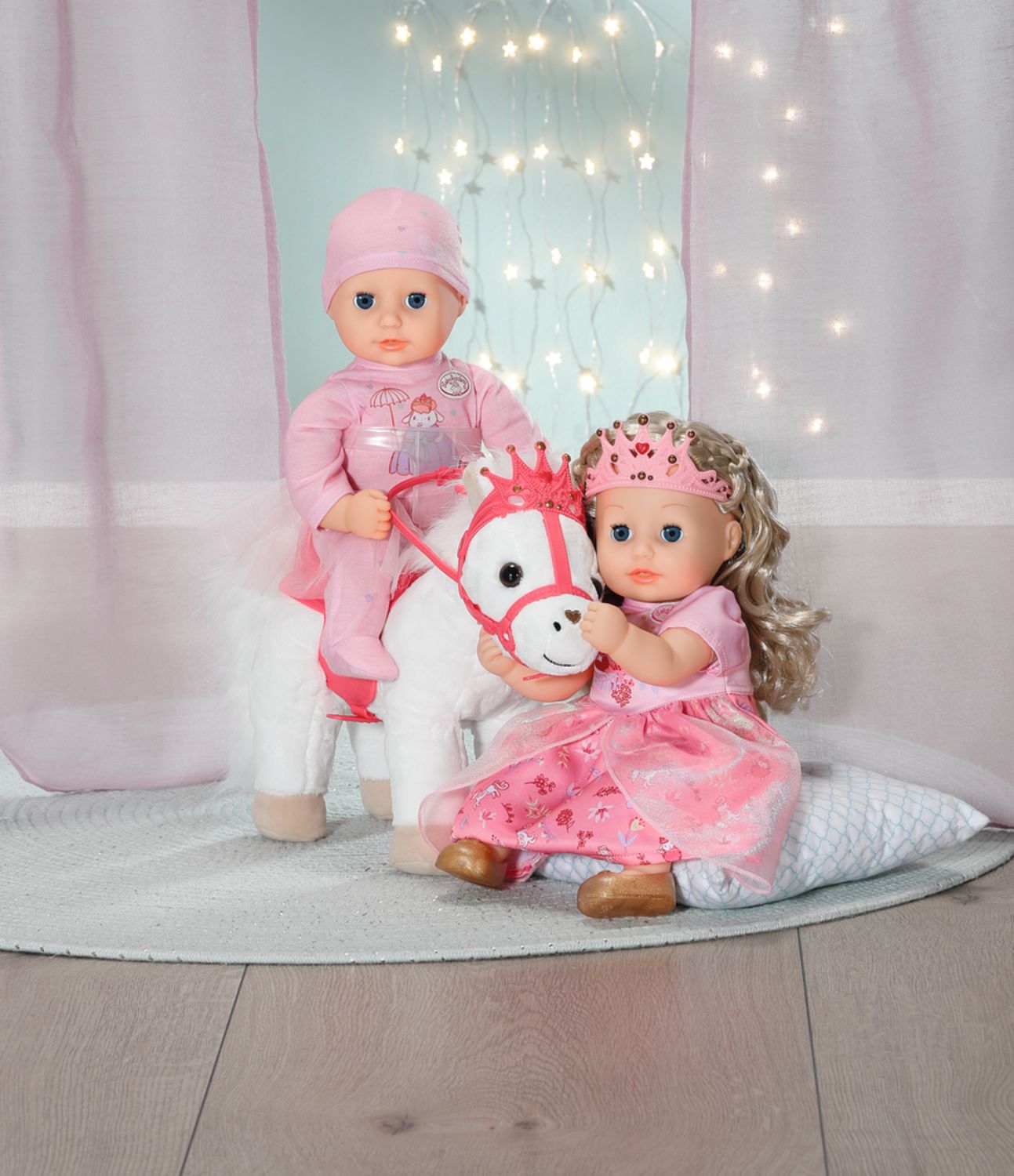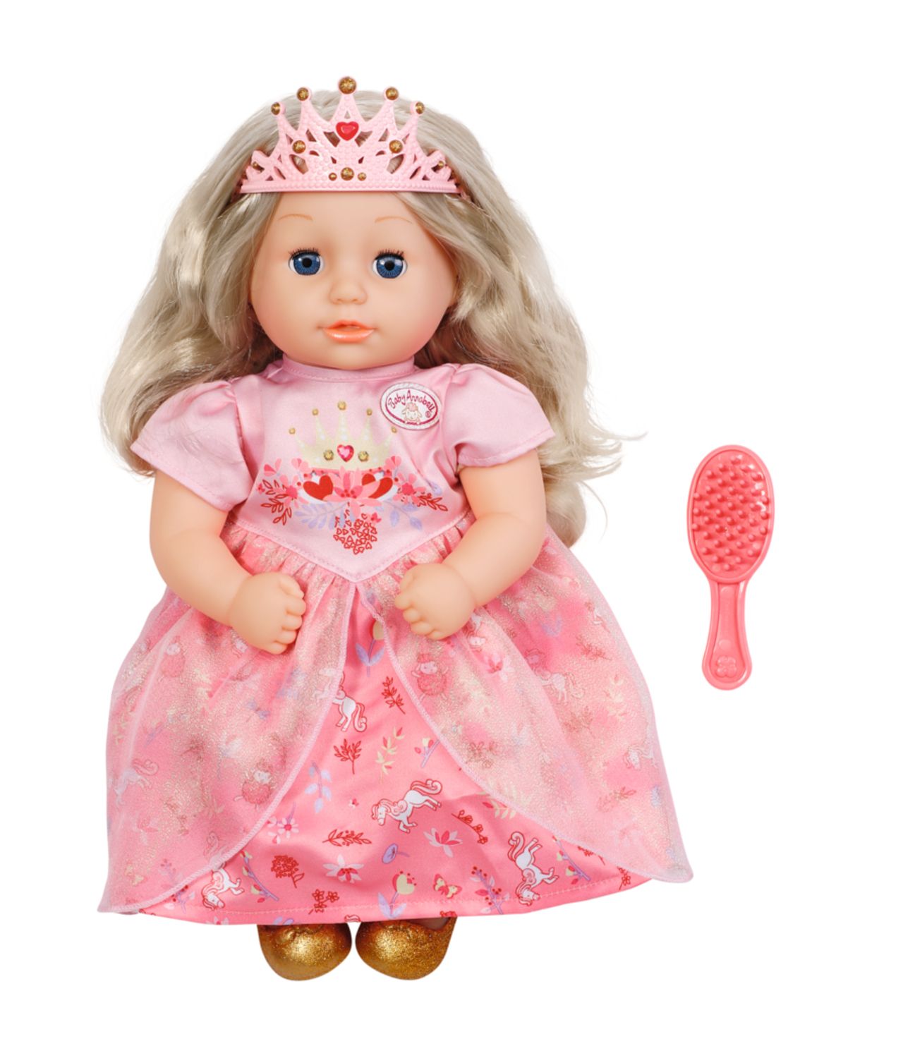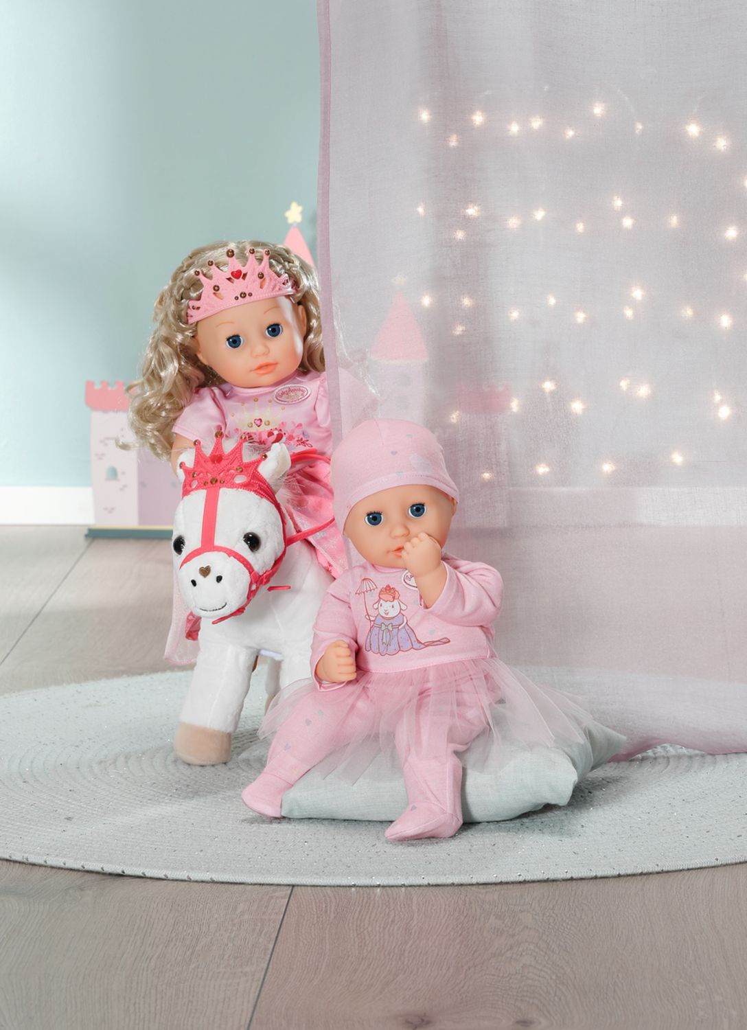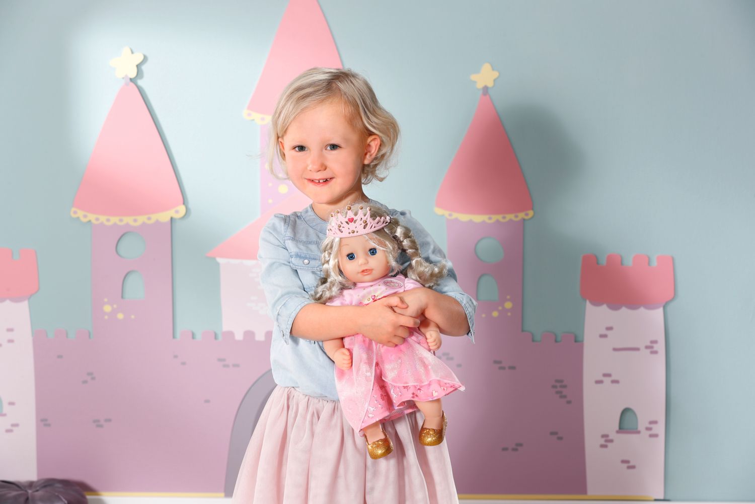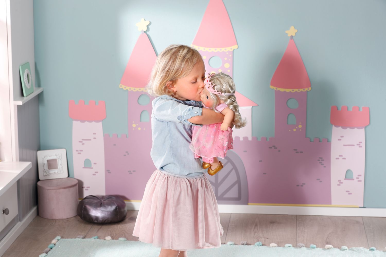 Deze pop van 30 cm heeft een lichaam met zachte vulling en haar van hoge kwaliteit. Ze heeft haar eigen haarborstel bij zich, zodat jij mooie prinsessenkapsels kunt creëren. Om het af te maken, kun je haar de tiara met glinsterende edelstenen opzetten. Haar glanzende, gouden ballerina's piepen onder haar magische, roze jurk met een overrok van tule uit. De japon is zo ontworpen dat zelfs de kleinste handen hem met gemak aan en uit kunnen trekken.