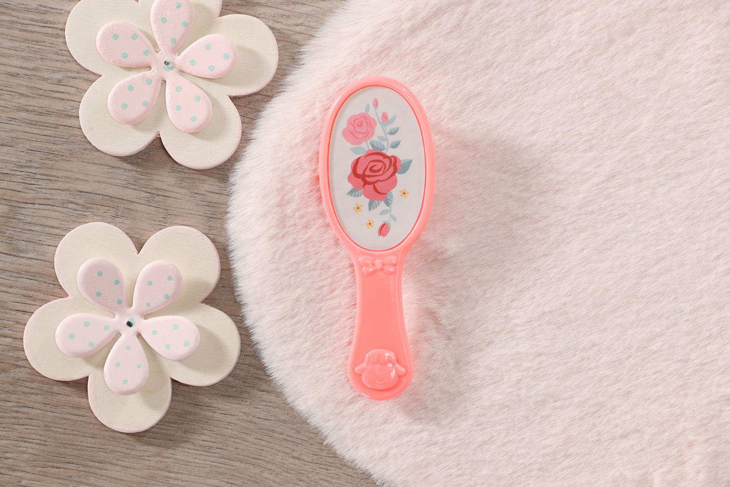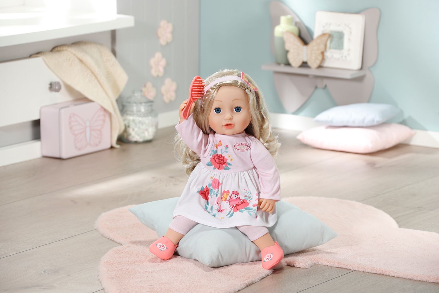 "Niet bewegen, Sophia, er zit een vlinder in je haar!" O wacht, het is maar de vlinder van haar haarband. Je kunt haar haar van hoge kwaliteit steeds weer opnieuw stylen en borstelen met de roze haarborstel. Deze kleine fan van rozen houdt het meest van los haar in combinatie met haar roze haarband met de vlinderdecoratie. Haar favoriete bloemen staan op haar schoenen en jurk afgebeeld. De jurk bestaat uit een top in het zachtroze en een witte rok. De kleur van de legging komt overeen met die van haar lange mouwen.
