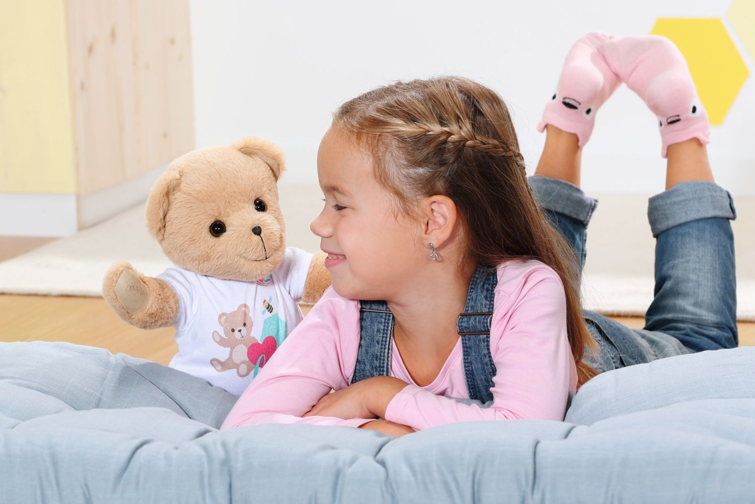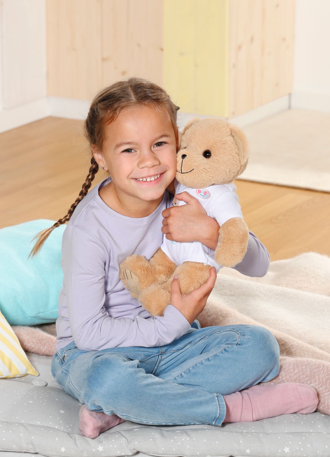 Een nieuw vriendje voor BABY born en alle BABY born-fans. Of is het misschien een vriendin? Het maakt ook niet uit, deze beer kan alles zijn: meisje, jongen, baby, knuffelbeer, speelkameraadje, trooster, prinses of brandweerman - vanaf de allereerste dagen tot de kindertijd een verre herinnering is geworden. De kleine beer met de lieve glimlach heeft een zacht, pluchen lichaam. De eerste outfit is een witte romper. De beer heeft een eigen modecollectie en berenaccessoires, maar kan ook bijna alle kleding van BABY born dragen en haar accessoires gebruiken. Het lichaam is zo ontworpen dat bijna alle kleding voor de BABY born-pop van 43 cm de beer past. Alleen de schoenen passen niet. Maar welke beer heeft er nou schoenen nodig? Doordat de armen en benen flexibel zijn en het hoofd kan draaien, kun je de beer makkelijk aan- en uitkleden. De beweeglijkheid maakt de beer ook perfect voor allerlei spellen en rollenspellen. Wie mag er als eerste iets in het vriendenalbum met het extra stickervel schrijven?
