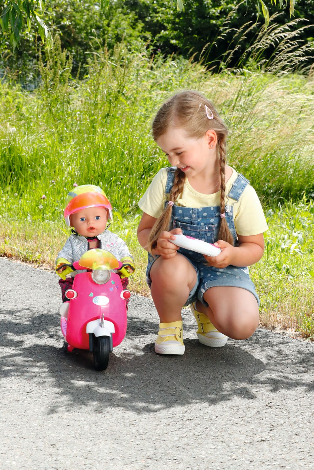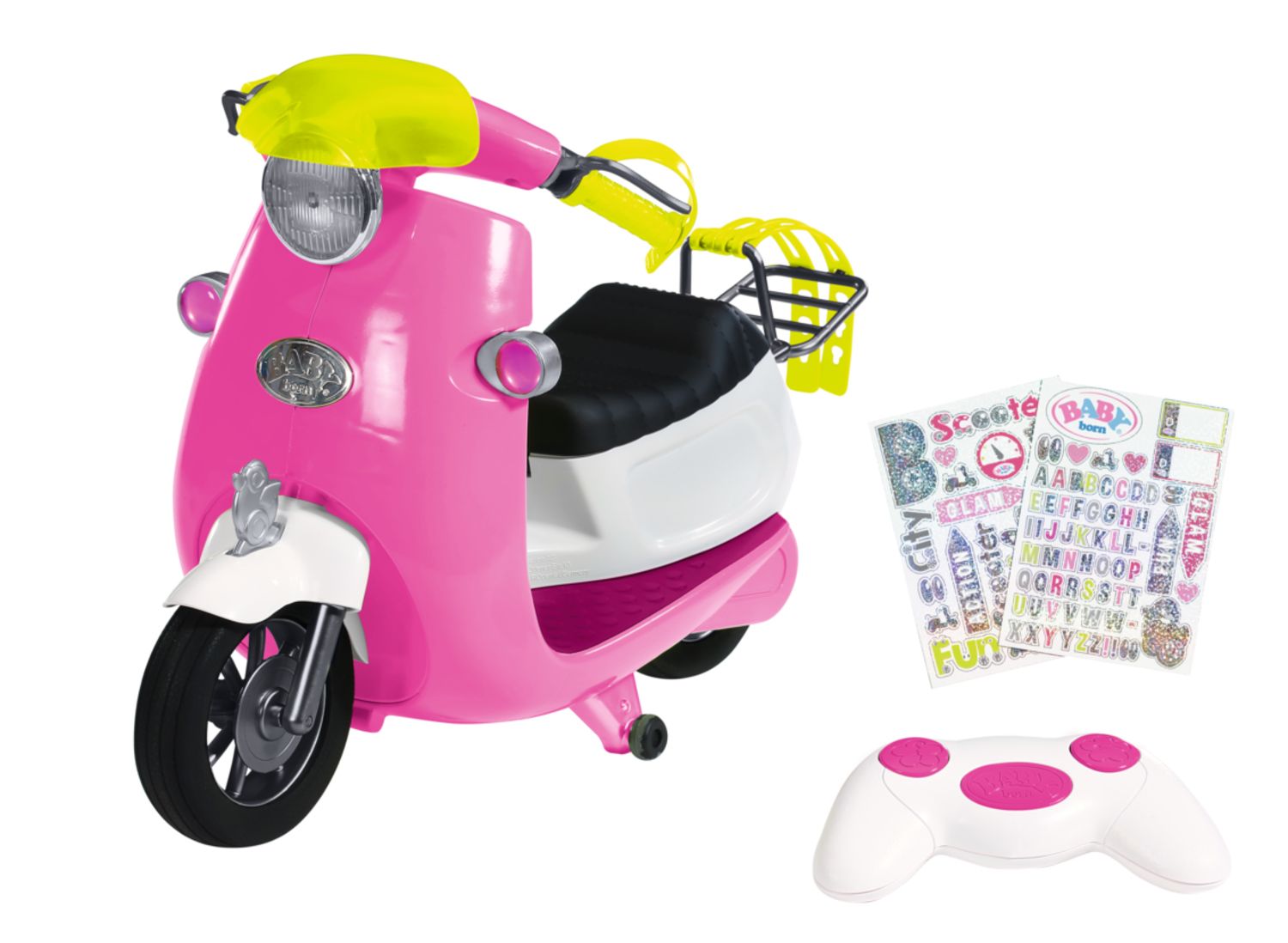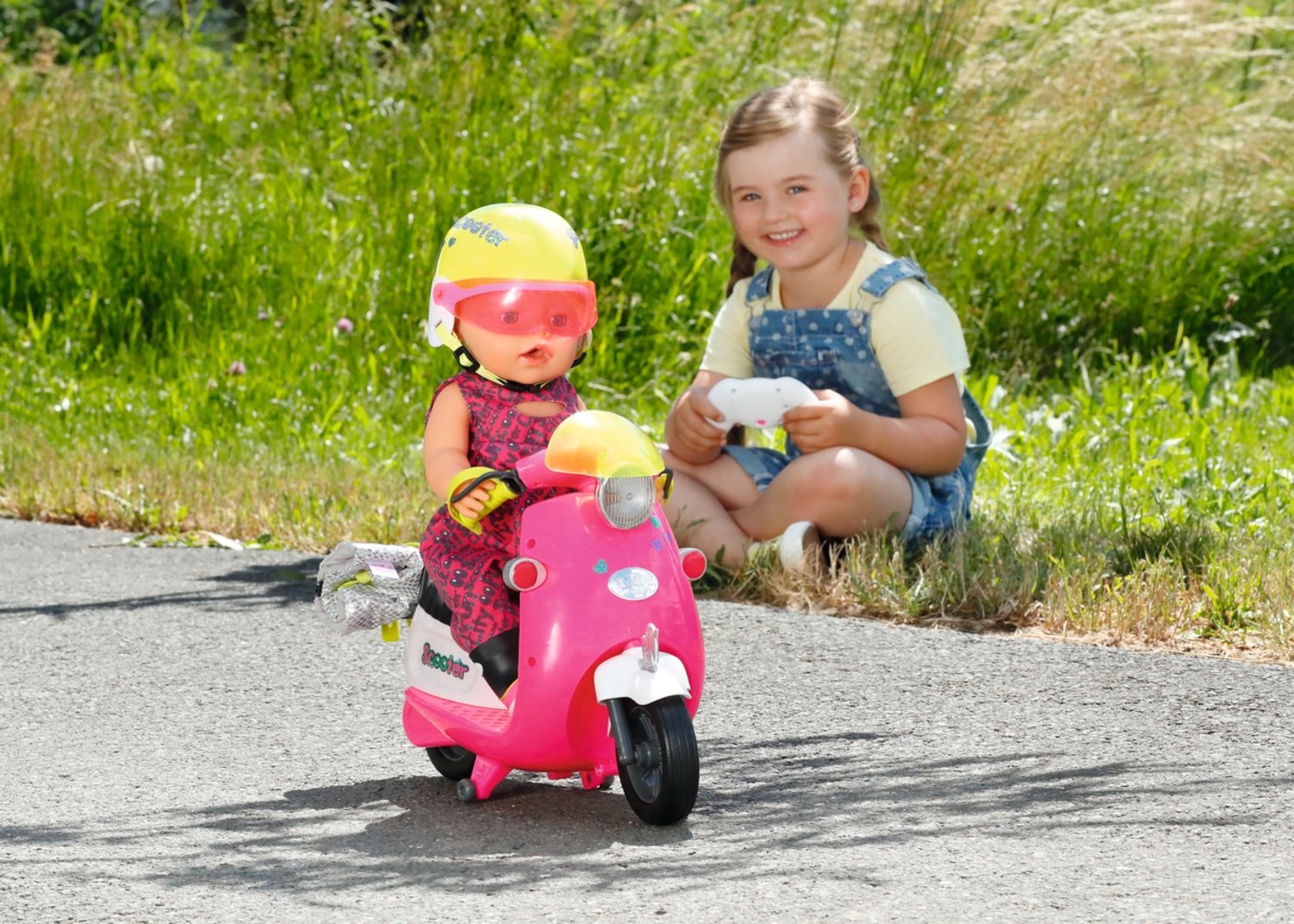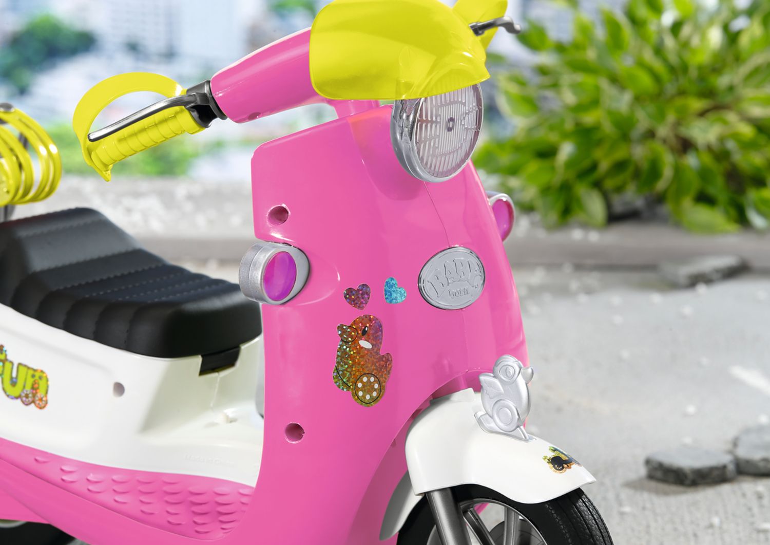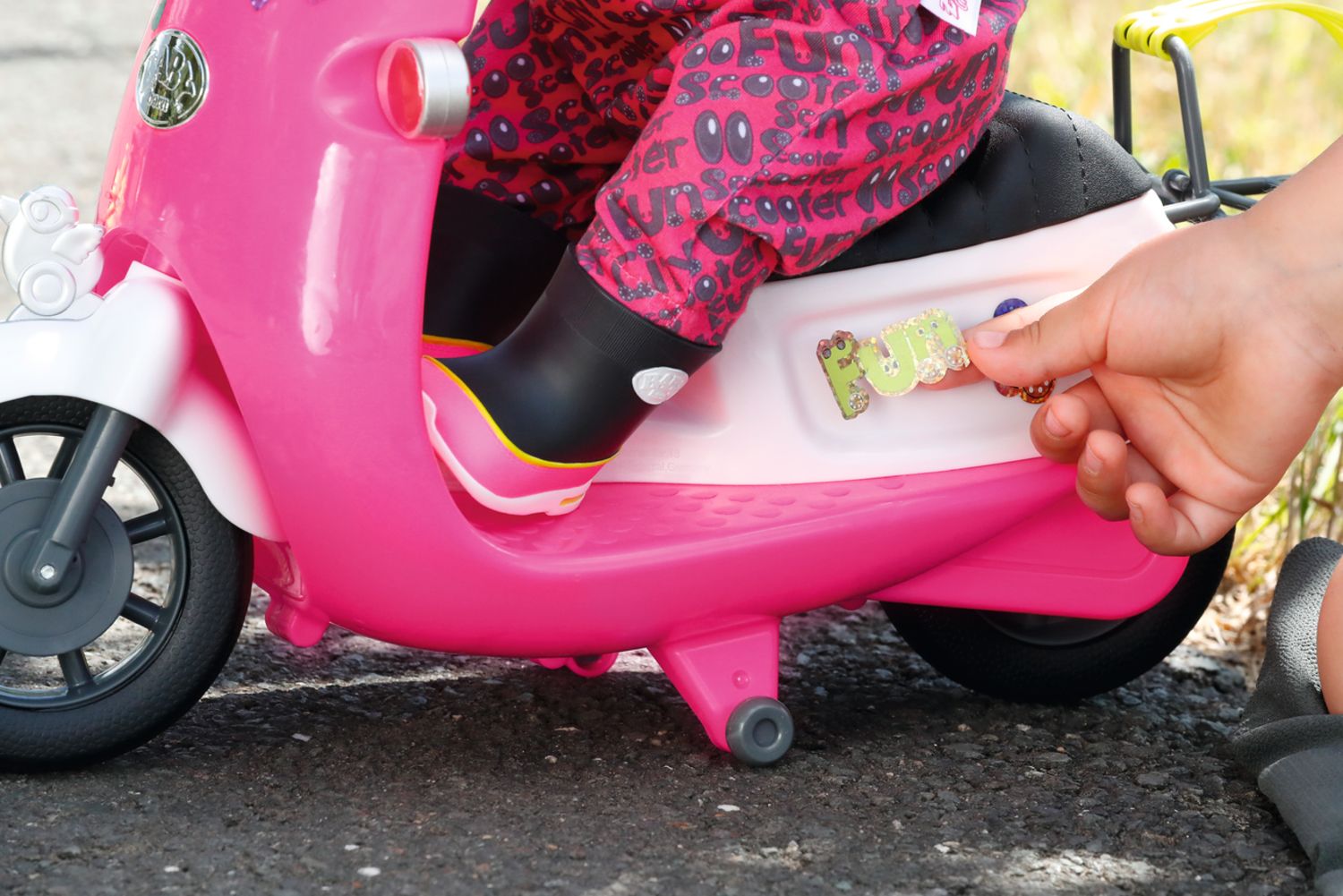 Het roze voertuig heeft een afstandsbediening. De knipperlichten knipperen als je naar links of rechts afslaat. De bandjes op het stuur zorgen ervoor dat BABY born veilig op haar plek blijft op deze tweewieler. Op het bagagerek kun je zelfs boodschappentassen meenemen. En je kunt de scooter pimpen met coole glitterstickers.