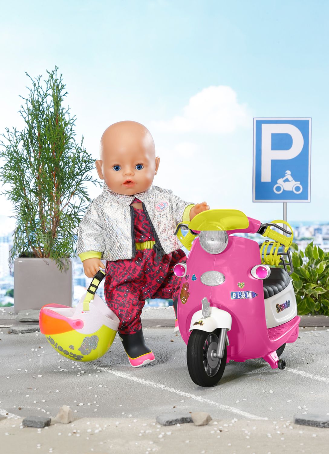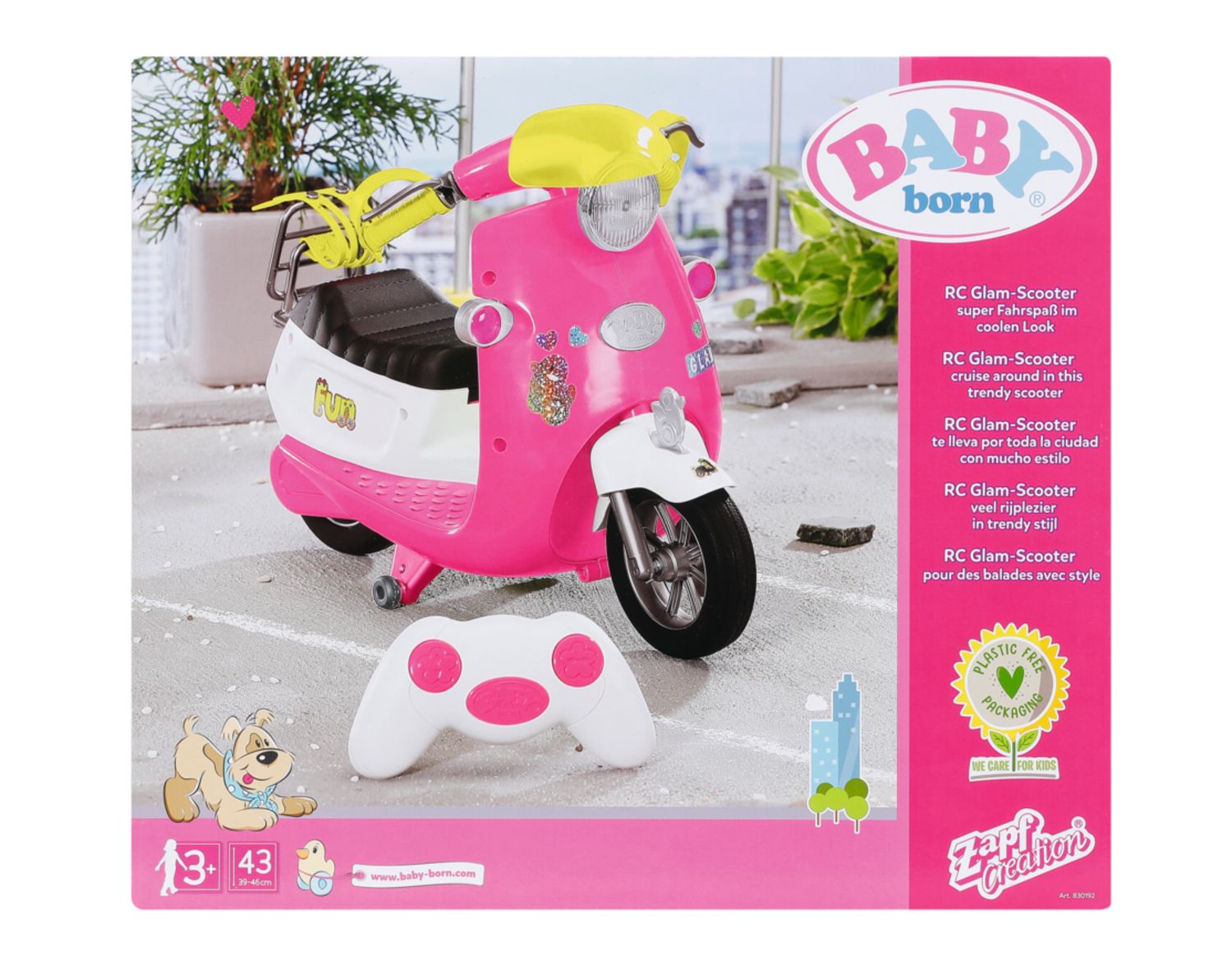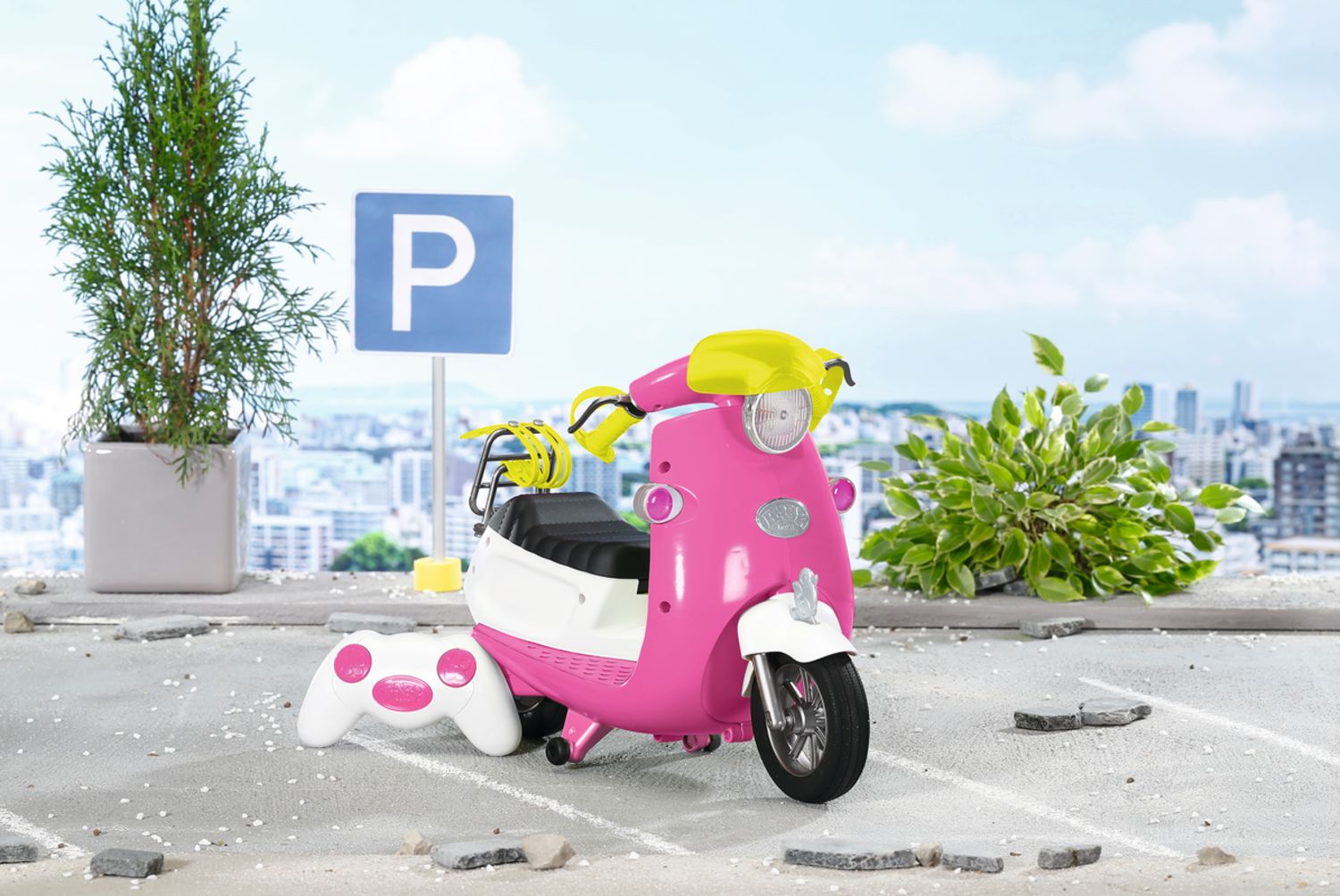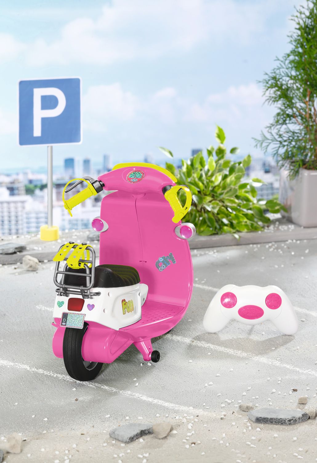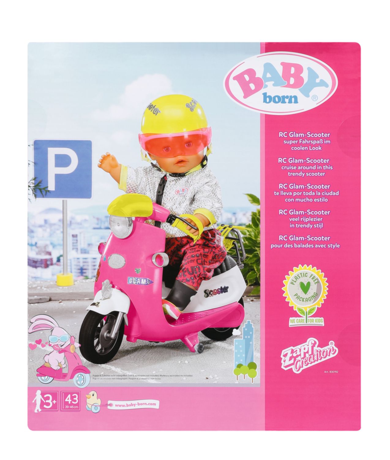 Het roze voertuig heeft een afstandsbediening. De knipperlichten knipperen als je naar links of rechts afslaat. De bandjes op het stuur zorgen ervoor dat BABY born veilig op haar plek blijft op deze tweewieler. Op het bagagerek kun je zelfs boodschappentassen meenemen. En je kunt de scooter pimpen met coole glitterstickers.