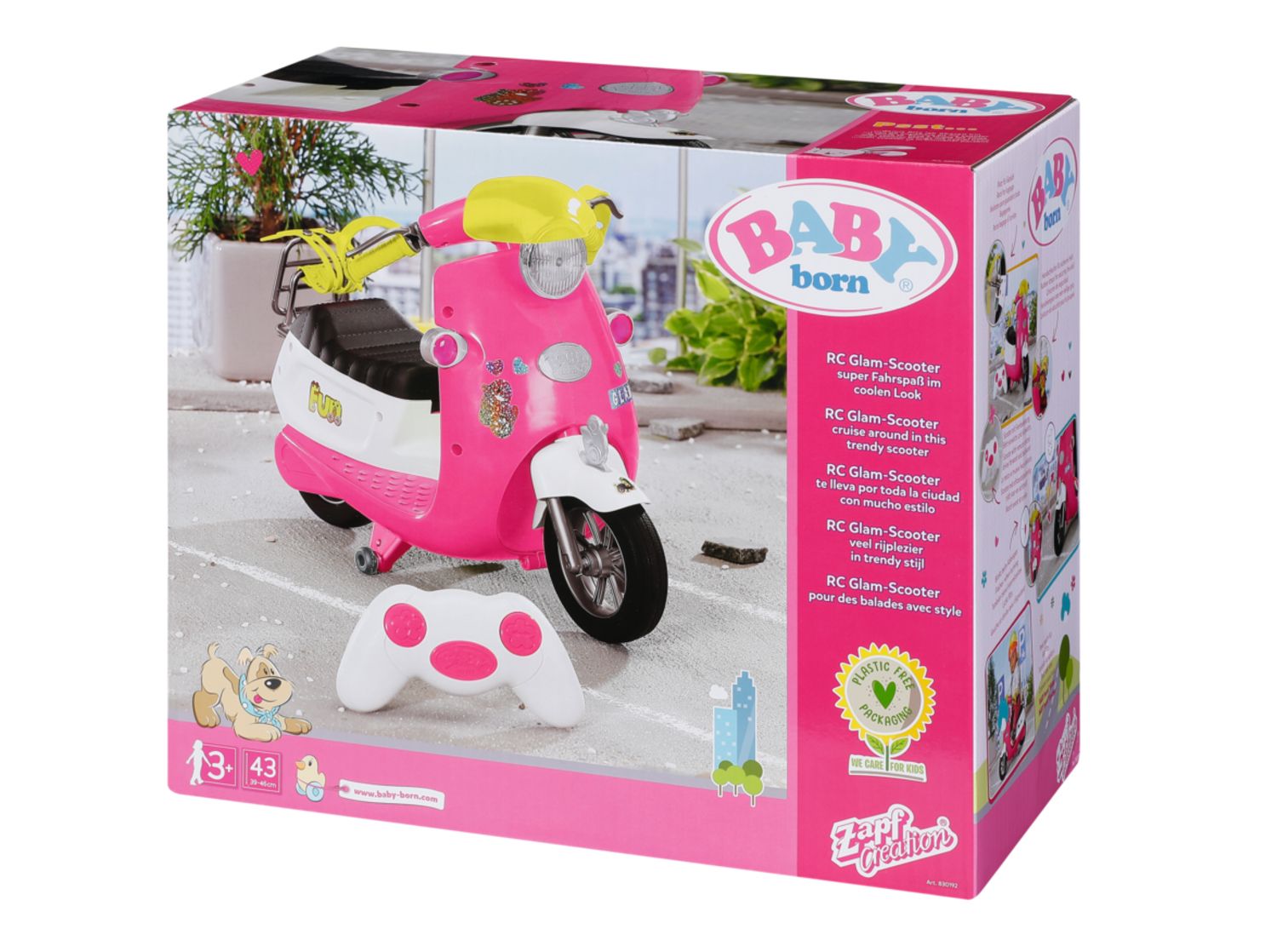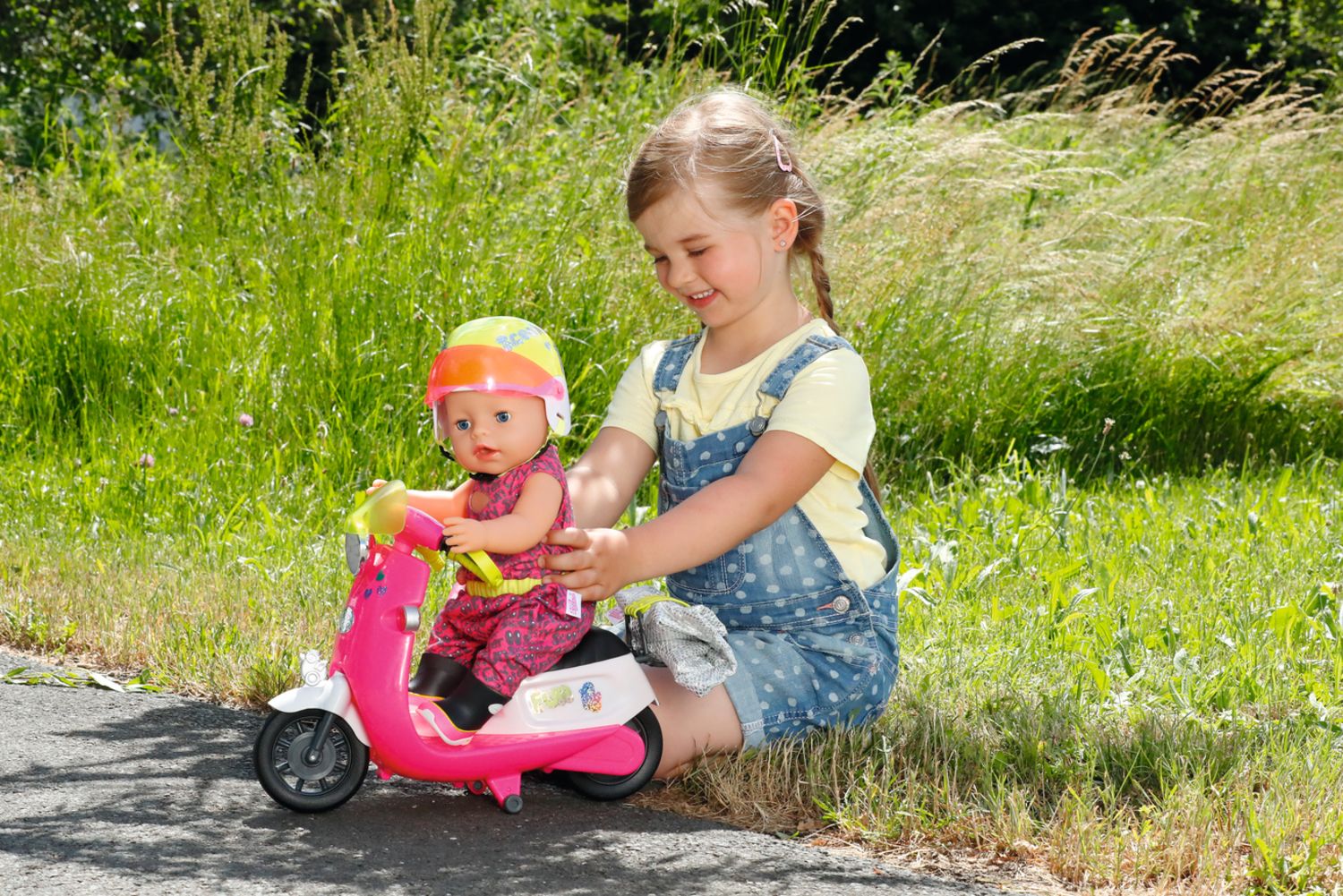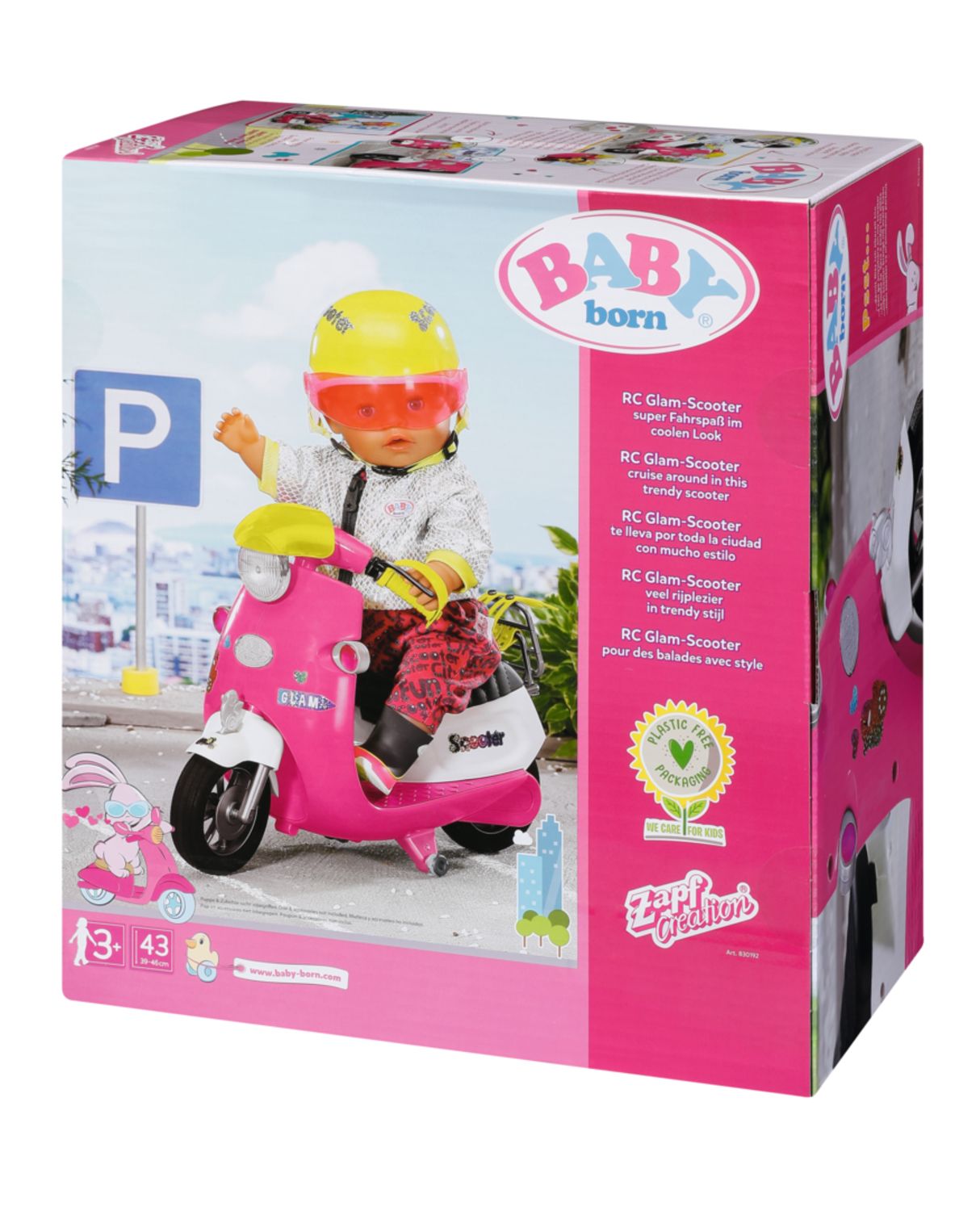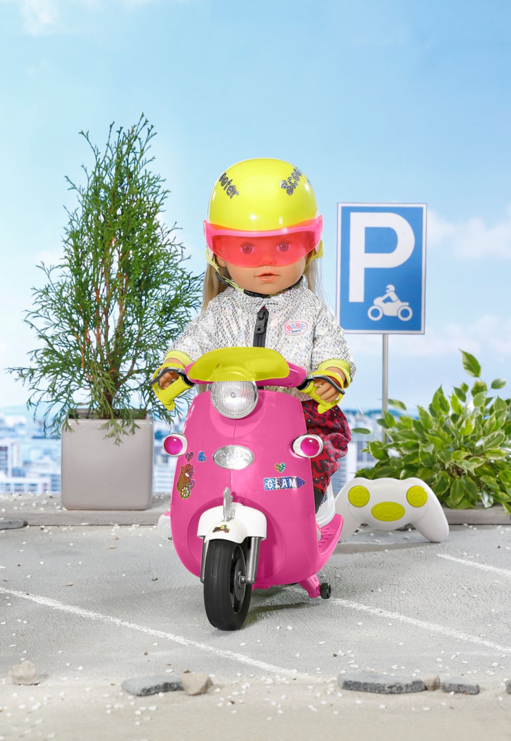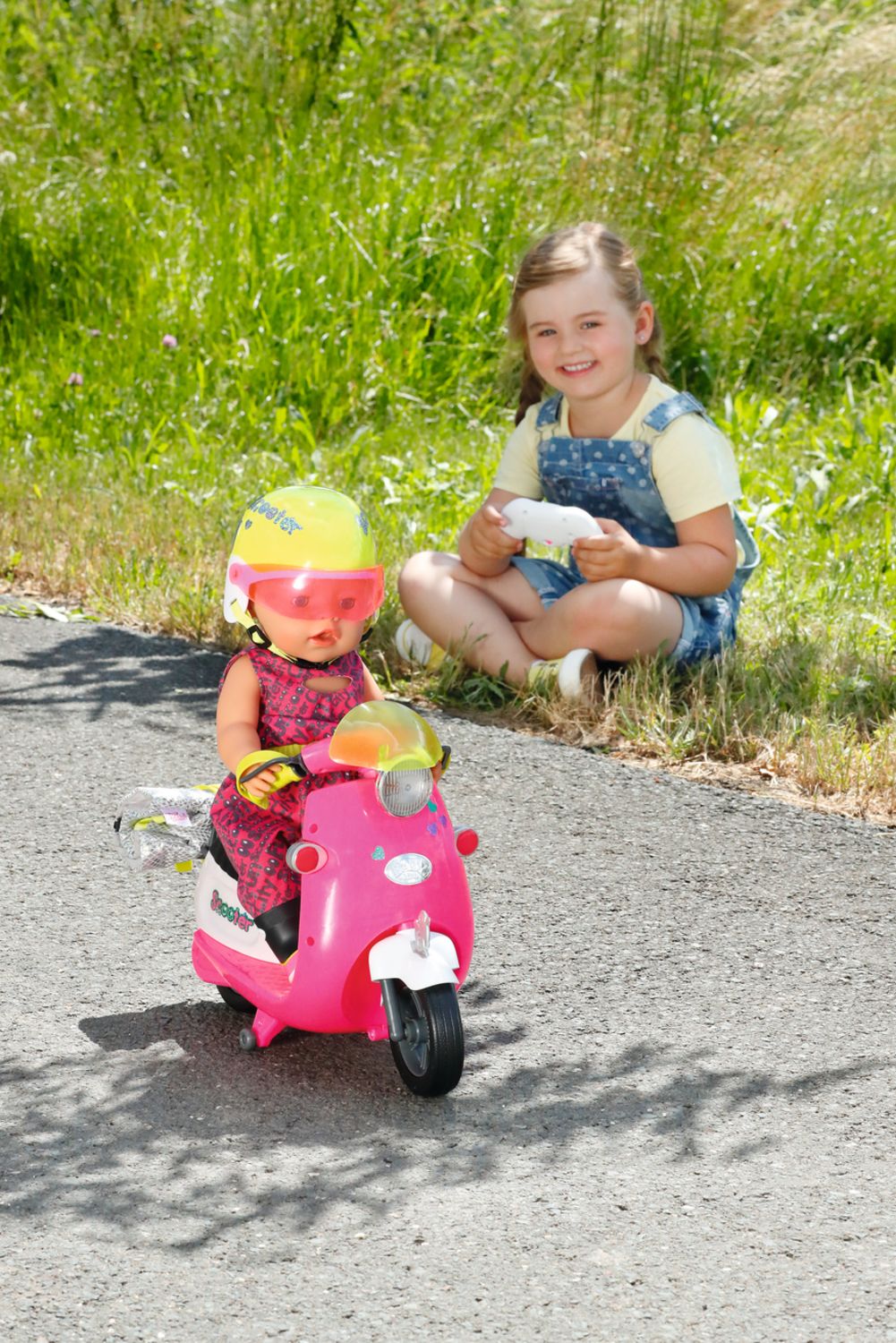 Het roze voertuig heeft een afstandsbediening. De knipperlichten knipperen als je naar links of rechts afslaat. De bandjes op het stuur zorgen ervoor dat BABY born veilig op haar plek blijft op deze tweewieler. Op het bagagerek kun je zelfs boodschappentassen meenemen. En je kunt de scooter pimpen met coole glitterstickers.