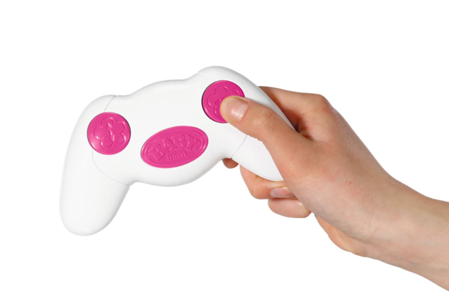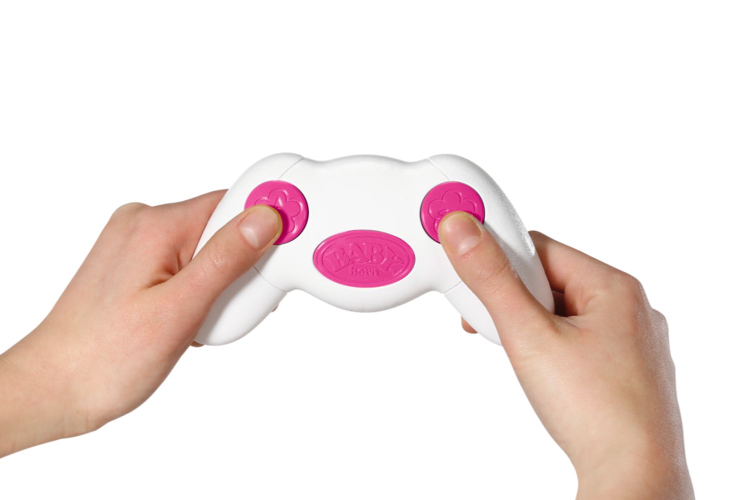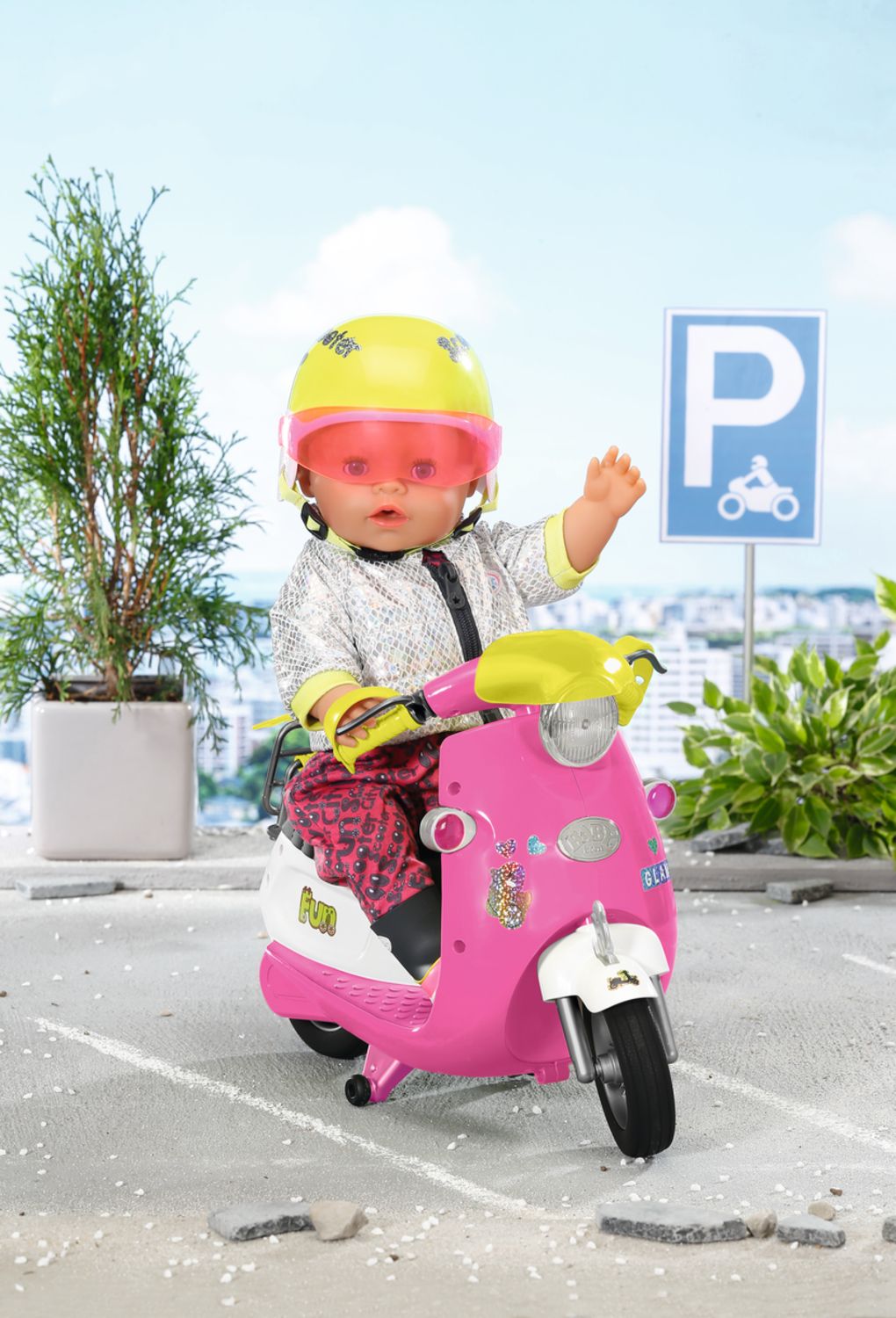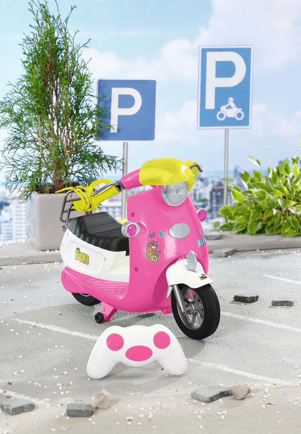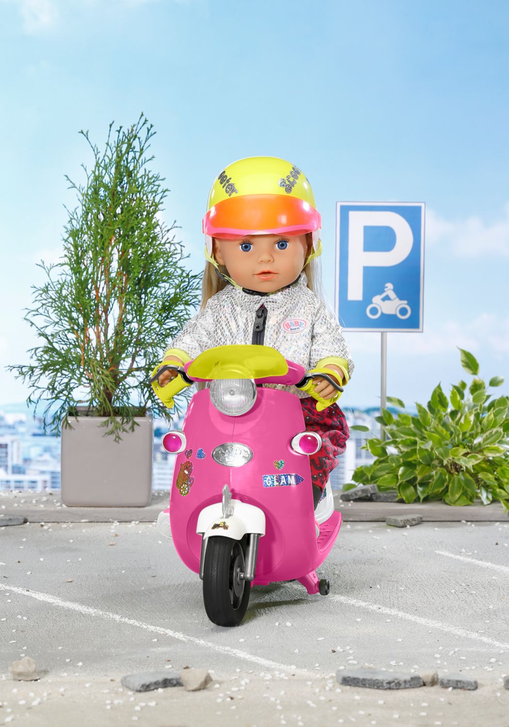 Het roze voertuig heeft een afstandsbediening. De knipperlichten knipperen als je naar links of rechts afslaat. De bandjes op het stuur zorgen ervoor dat BABY born veilig op haar plek blijft op deze tweewieler. Op het bagagerek kun je zelfs boodschappentassen meenemen. En je kunt de scooter pimpen met coole glitterstickers.