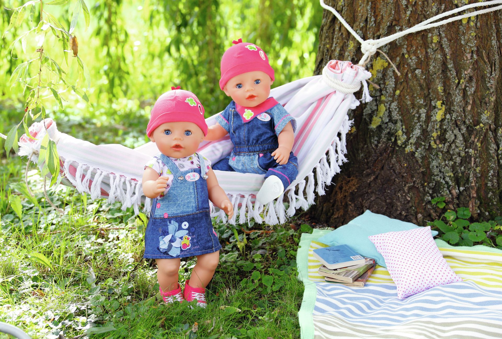 Je slaat de plank nooit mis met jeansstof. Jeansstof is comfortabel en robuust, maar ook de perfecte keus voor elke gelegenheid. Op koelere dagen draagt BABY Born® graag de overall met de geïntegreerde roze sjaal en de bijpassende roze muts met vrolijke dessins, plus de comfortabele limoengroene gympen. Op warmere dagen is de overgooier met lief T-shirt, bijpassende roze muts en de roze gympen super.