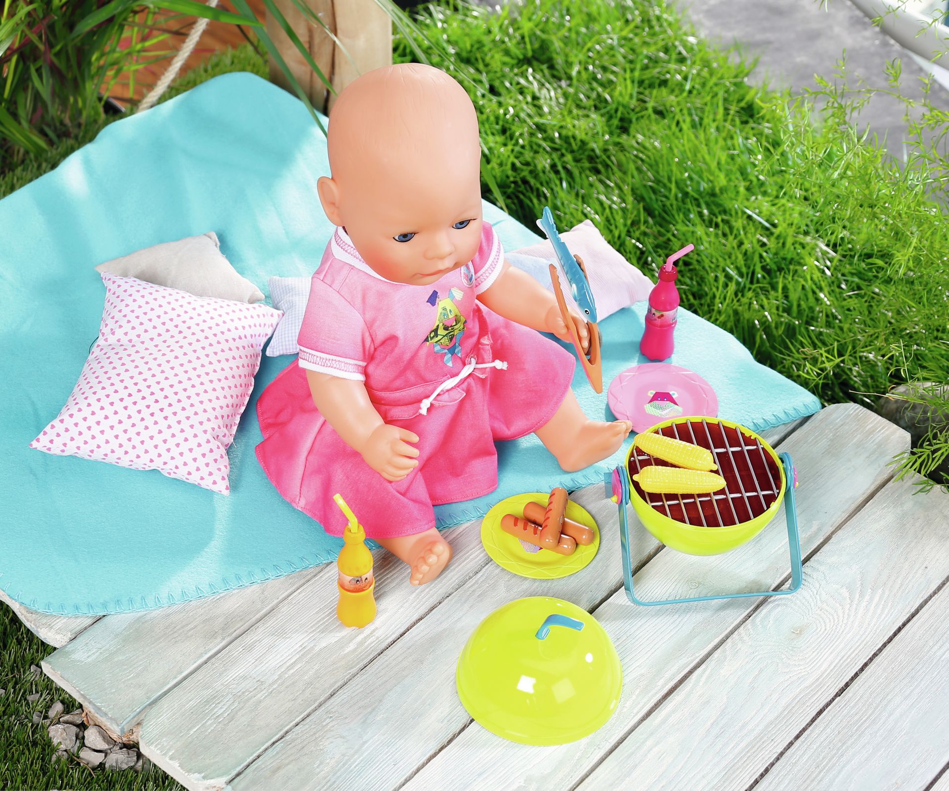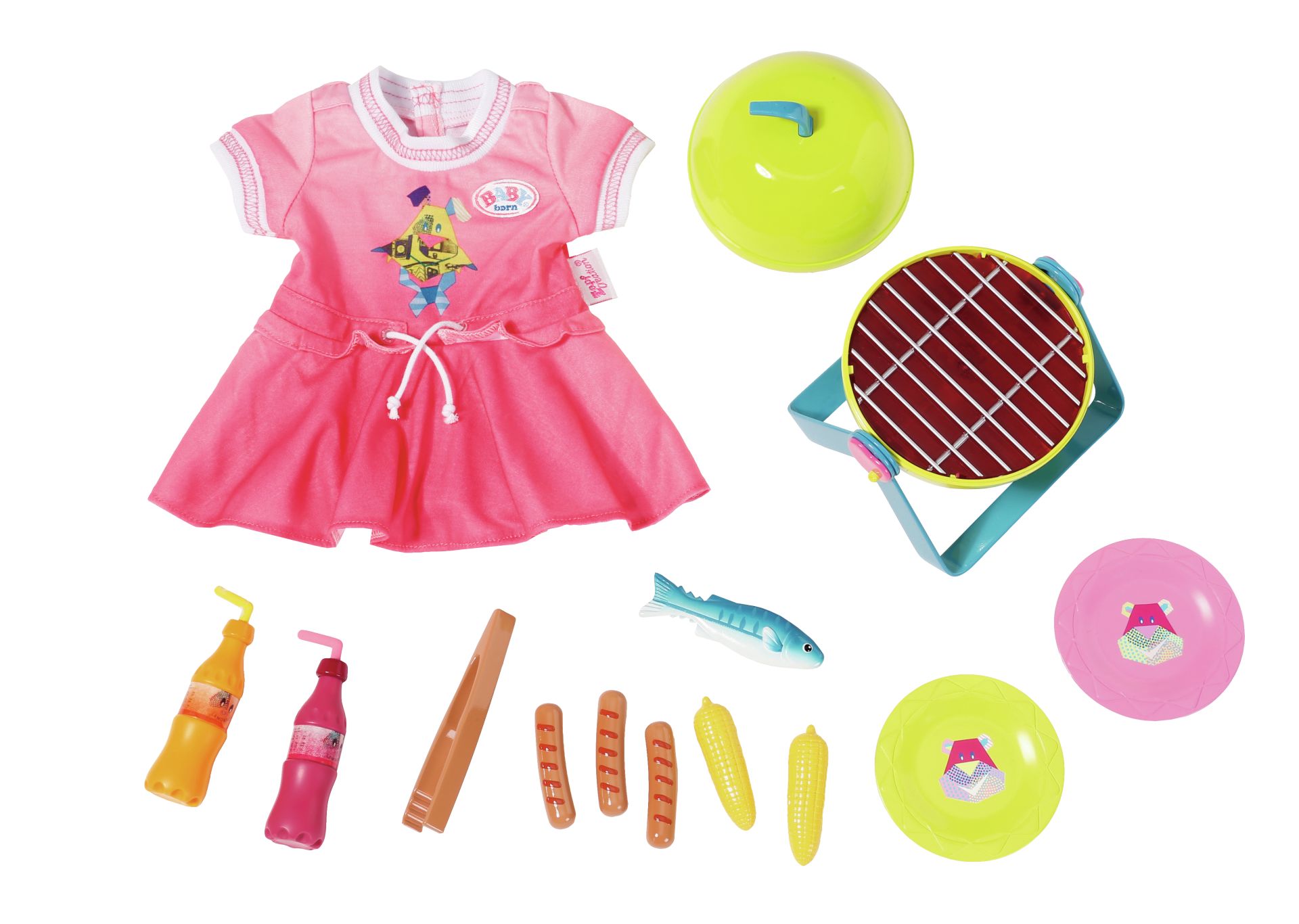 BABY Born Play&Fun Barbecueset met jurk, grill met licht- en geluidseffecten, 3 worstjes, 2 maiskolven, 1 vis, barbecuetang, 2 borden met 2 vorken en 2 flesjes limonade.