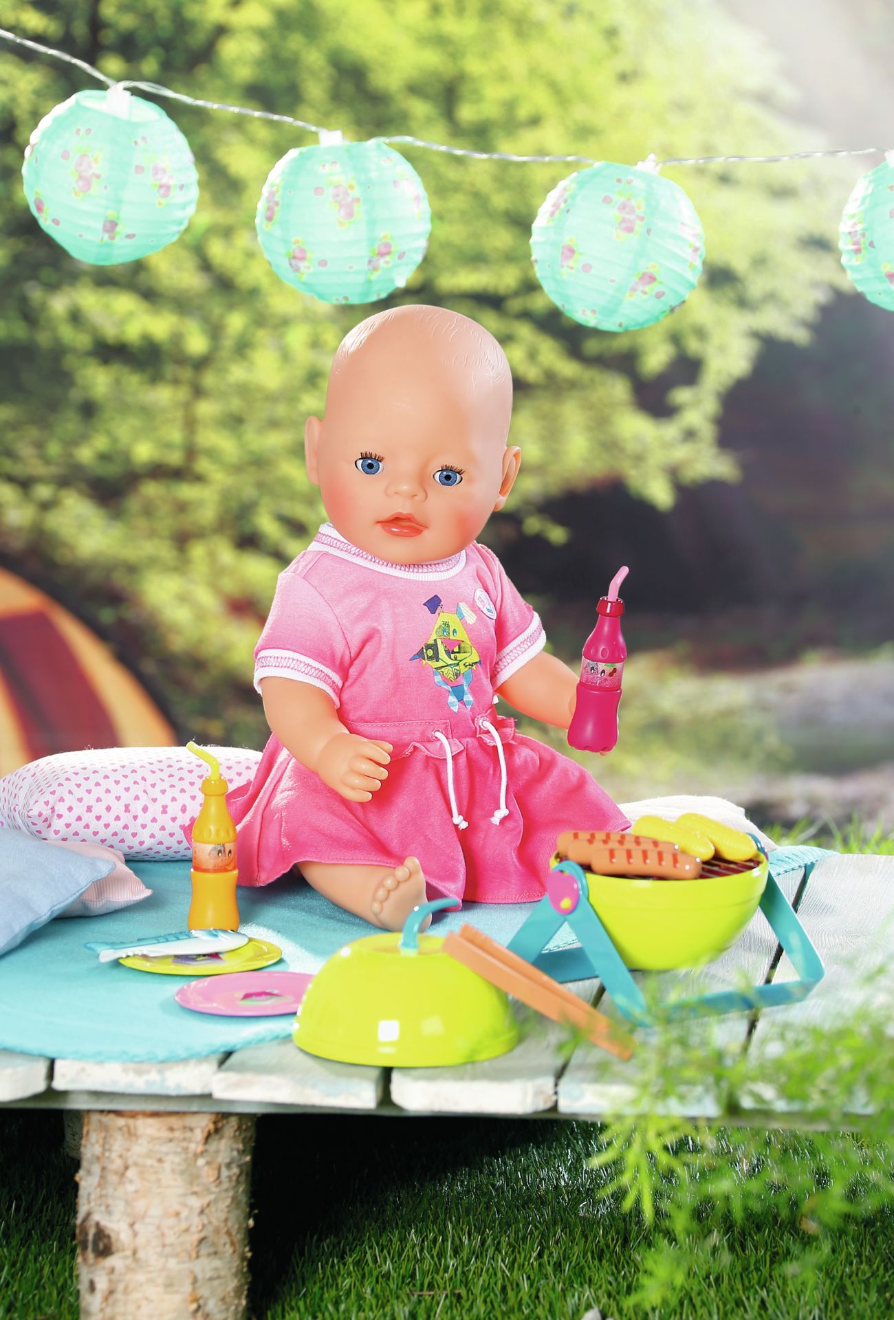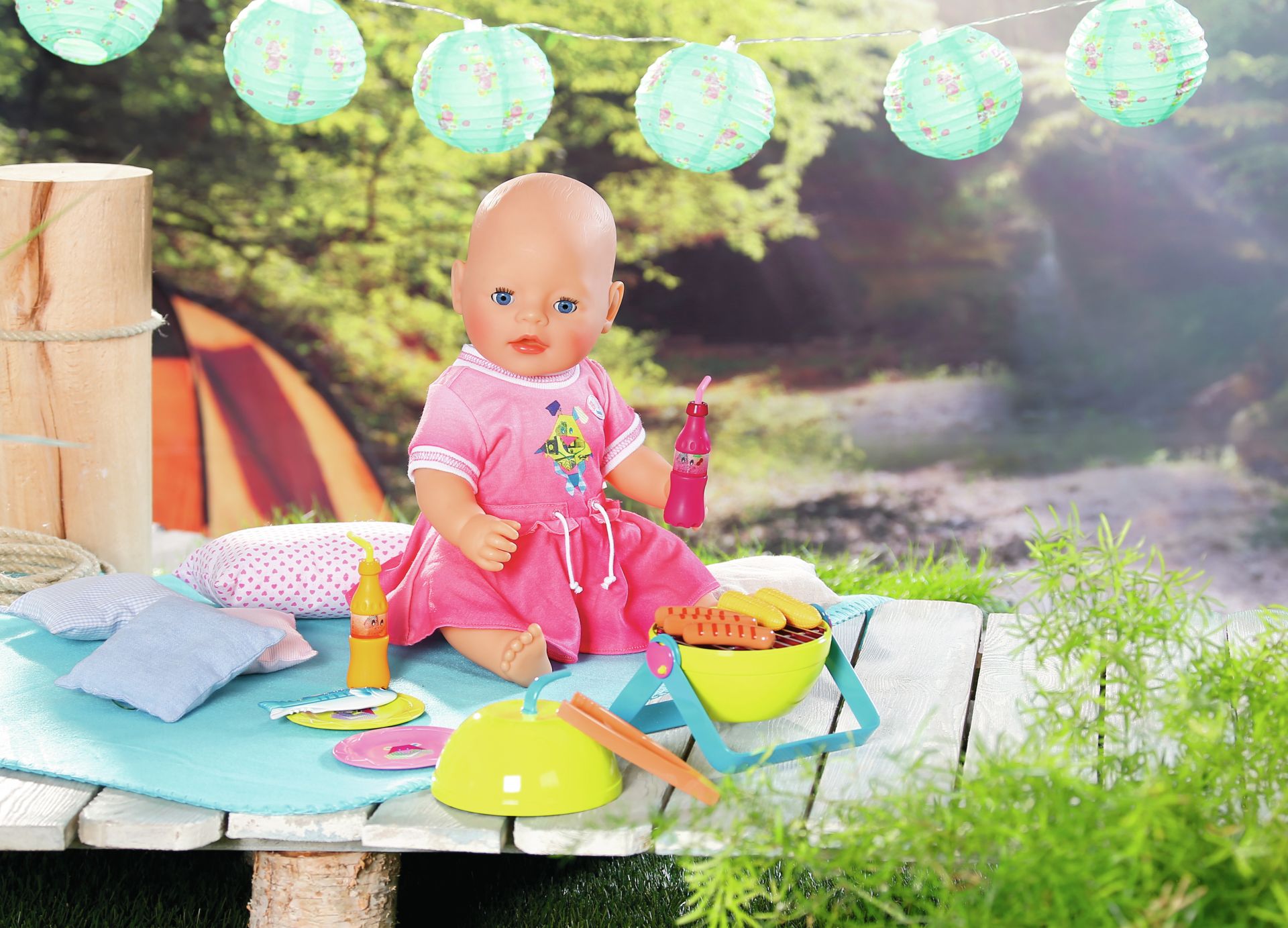 Een schattige roze jurk voor geweldige barbecue-avonden met BABY Born®'s grill met licht- en geluidseffecten, barbecuevoedsel en barbecue-accessoires.