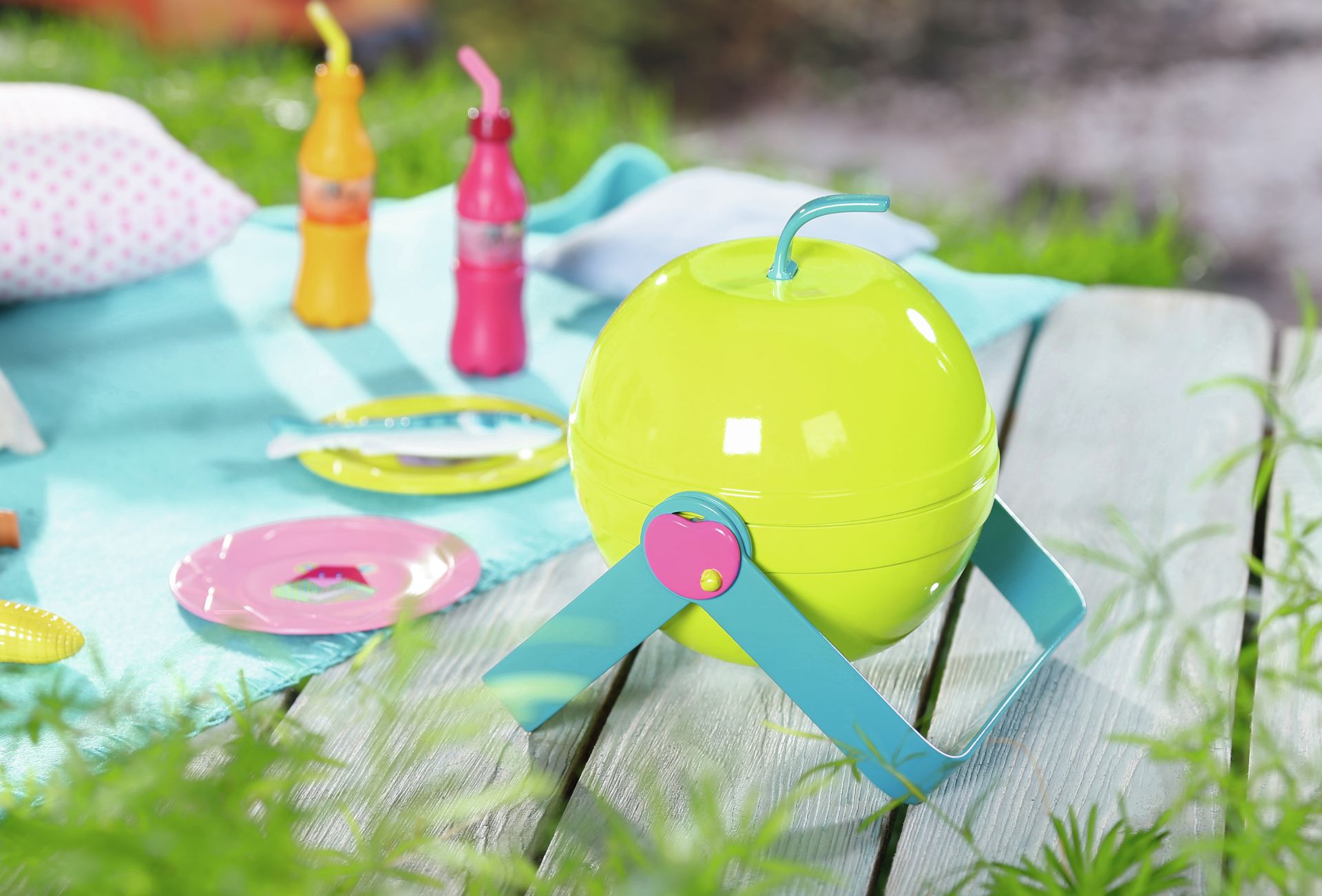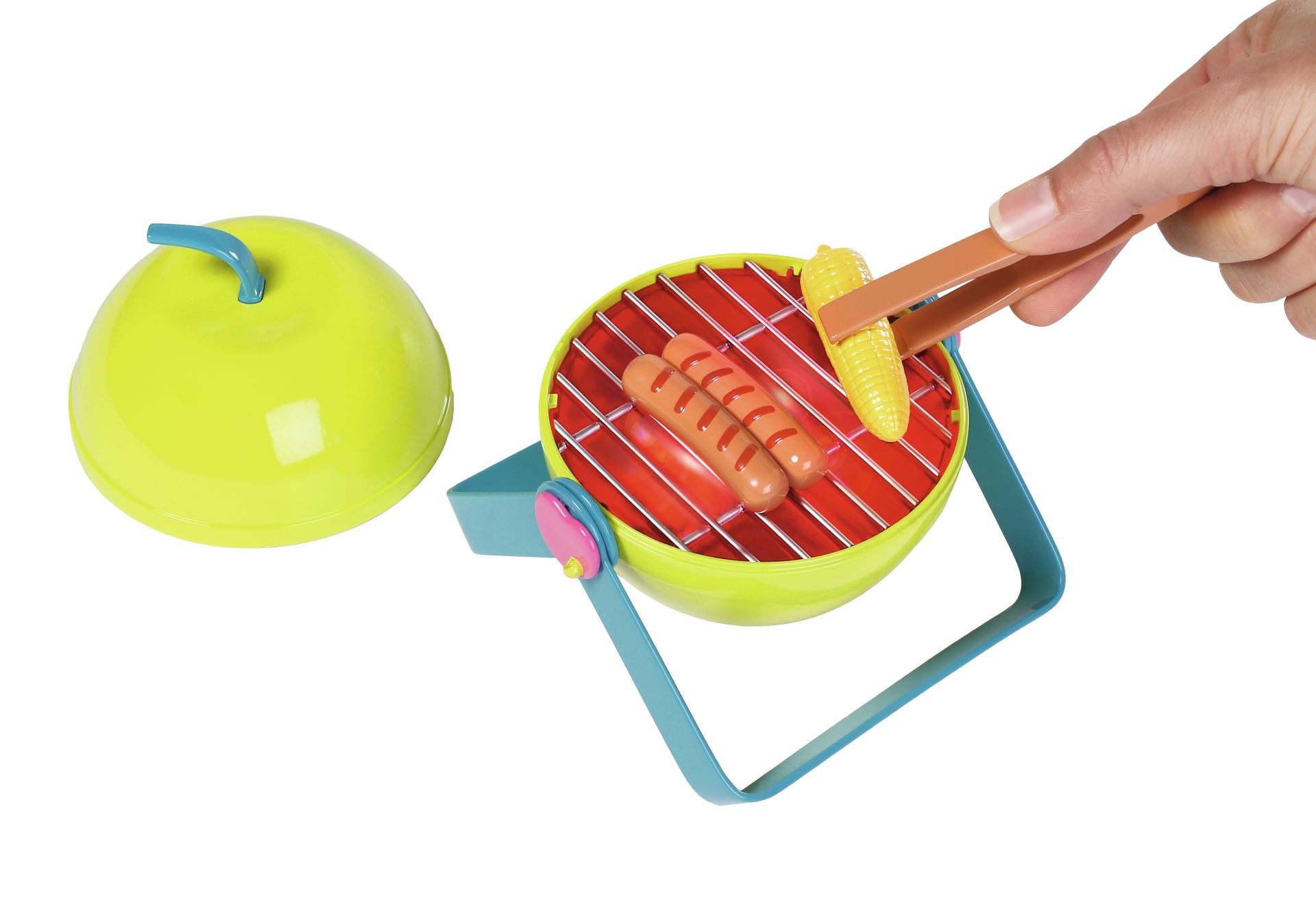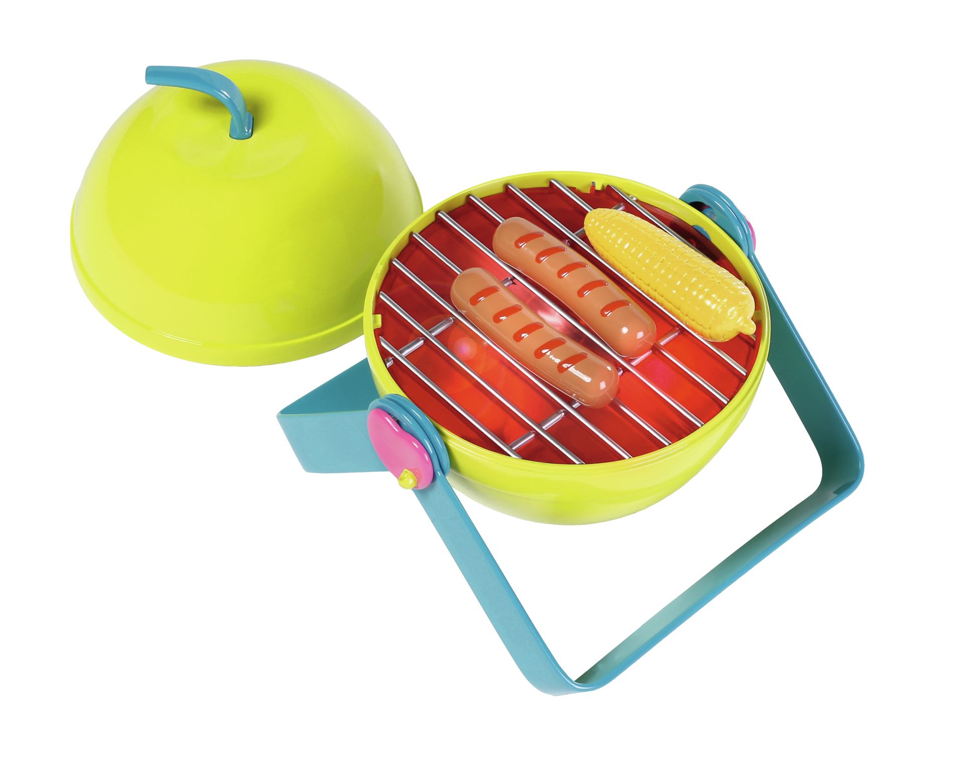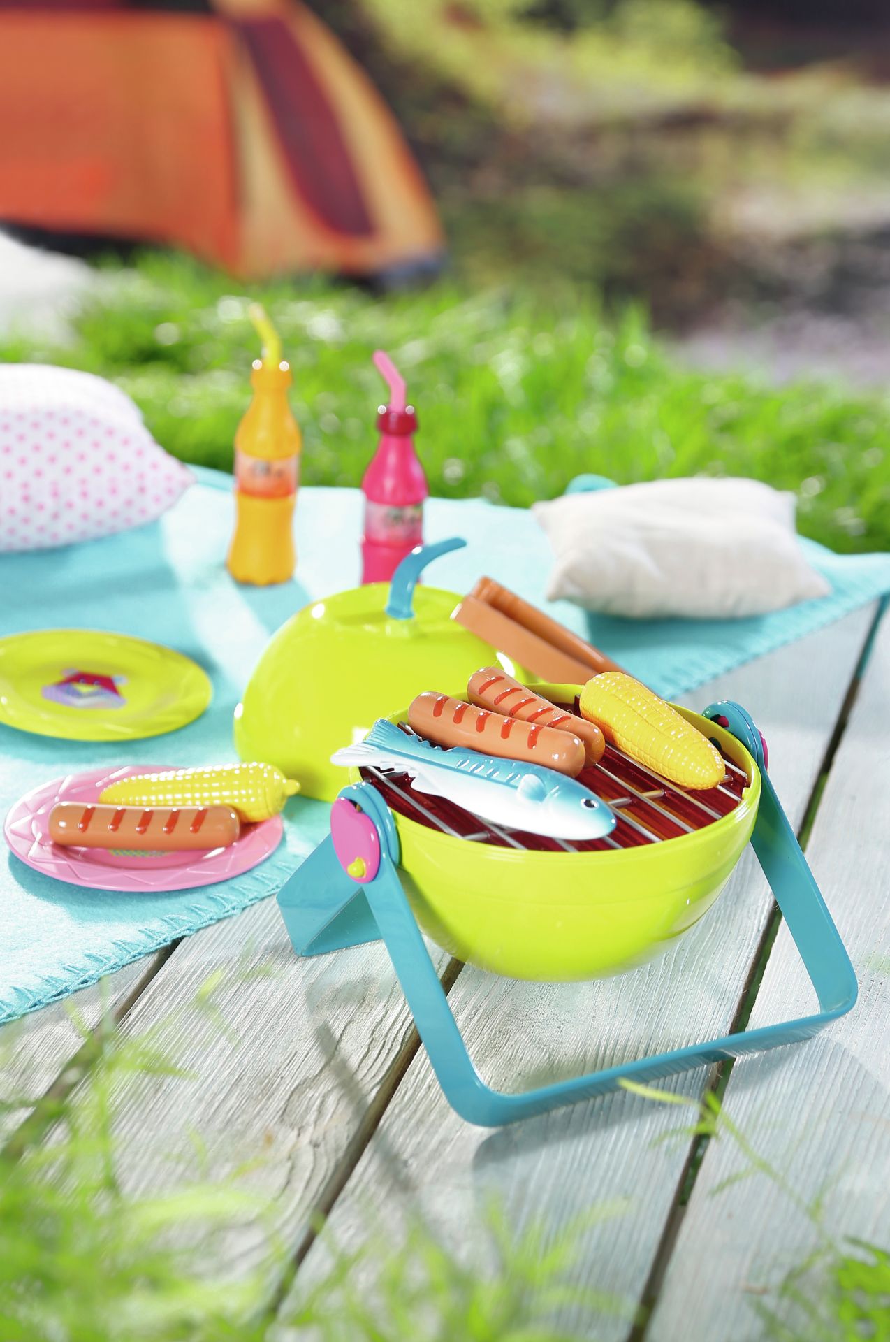 Zomer, zon, barbecueën... als BABY Born de hele dag in de tuin gespeeld heeft, is het logisch om ook buiten te eten. De worstjes, vis en maiskolven op de appelvormige grill smaken geweldig. Als je het barbecuevoedsel op de grill legt, beginnen de kooltjes te gloeien en hoor je barbecuegeluiden.