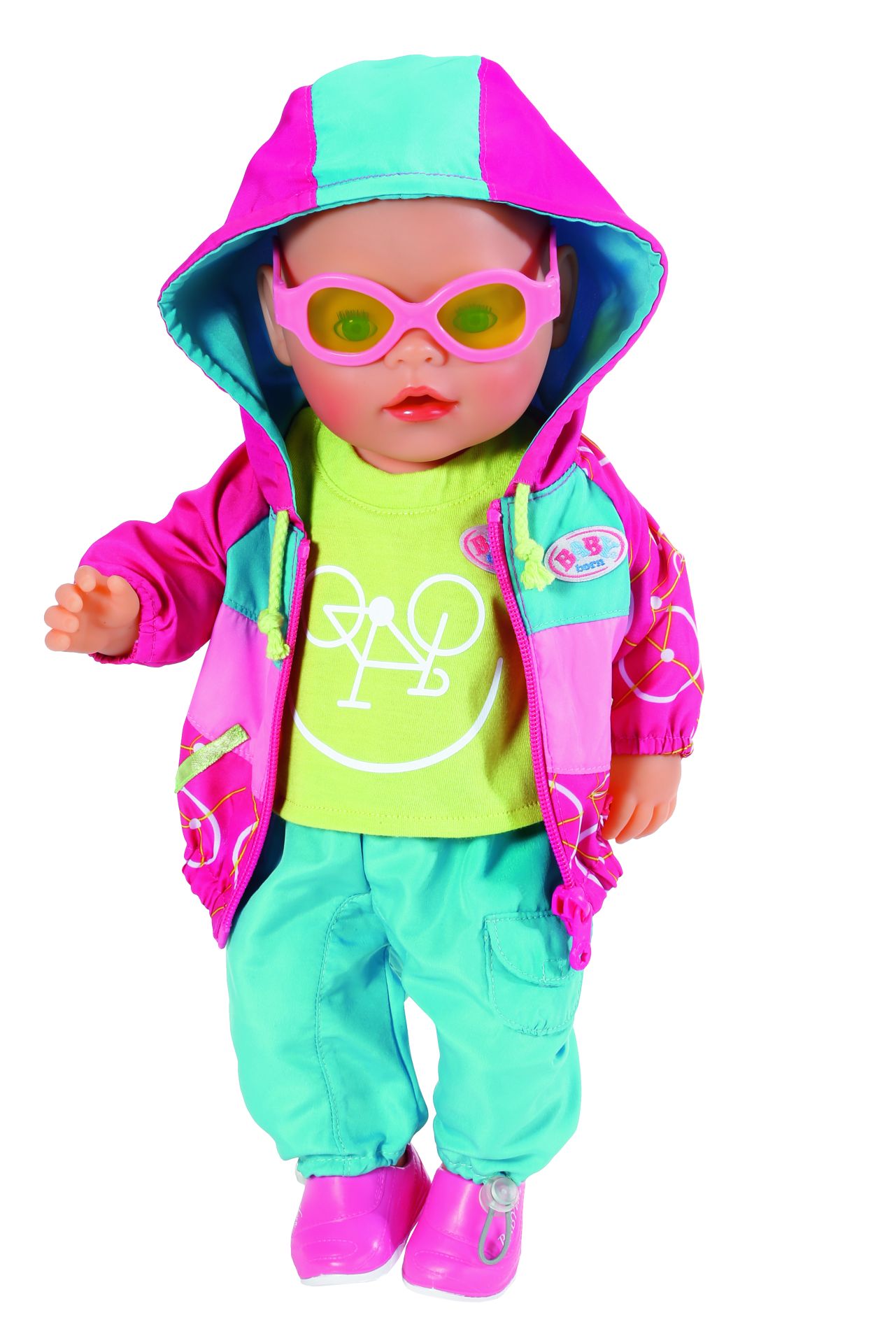 De limoengroene bril en schoenen passen perfect bij het T-shirt met de bikerssmiley. Je weet maar nooit of het weer omslaat tijdens een fietstocht, dus de roze jas met de coole print heeft ook een capuchon. BABY born® Fiets Luxe Outfit met jas, T-shirt, broek, schoenen en zonnebril.