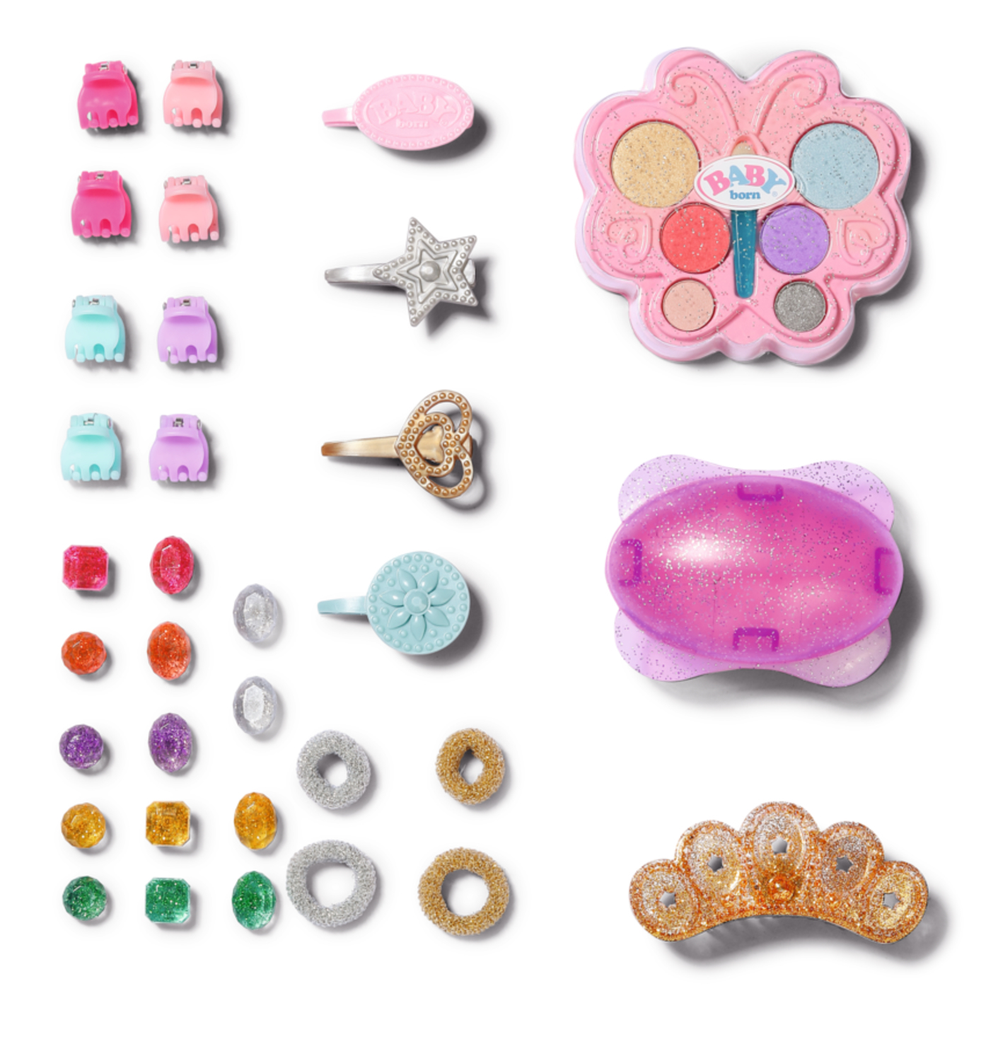 BABY born Sister Stylinghoofd Prinses met make-uppalet, haarborstel, 4 haarclips, 8 schuifspelden, 4 haarbolletjes, een tiara en 14 haarspelden met siersteentjes.