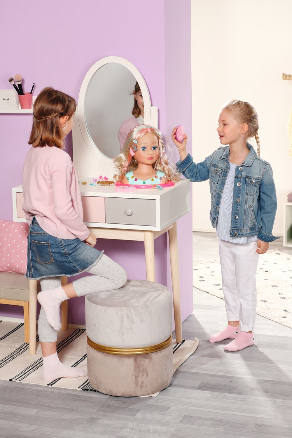 Welkom in de make-upstudio voor kleine prinsessen met een oog voor stijl! Jonge visagisten kunnen nu verbluffende looks creëren met het kleurrijke en dermatologisch geteste make-uppalet. Het stylinghoofd met het hoogwaardige, blonde haar en de subtiele, gekleurde highlights is makkelijk te stylen met de haarbolletjes, haarclips, schuifspelden en een haarborstel. Of het nou romantische krullen, elegante opgestoken kapsels of supercoole vlechten en staarten zijn, de koninklijke stilisten kunnen al hun fantasie gebruiken. Als klap op de vuurpijl zijn er de felgekleurde haarspelden met siersteentjes die je kunt gebruiken om de transparante glittertiara te laten stralen als een ster. Alles wat er nu nog mist, zijn de perfecte oorbellen en dan is jouw prinses klaar voor haar grootse entree.