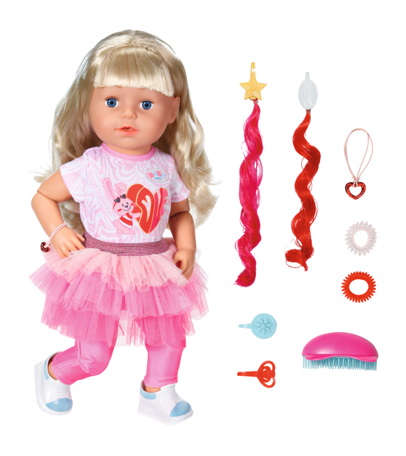 BABY born Sister Play & Style (43 cm) met onesie, rok van tule en schoenen. Inclusief haarborstel, twee spiraalvormige elastiekjes, twee haarclips, twee haarclips met haarstrengen en een vriendschapsarmband elk voor het kind en de pop.