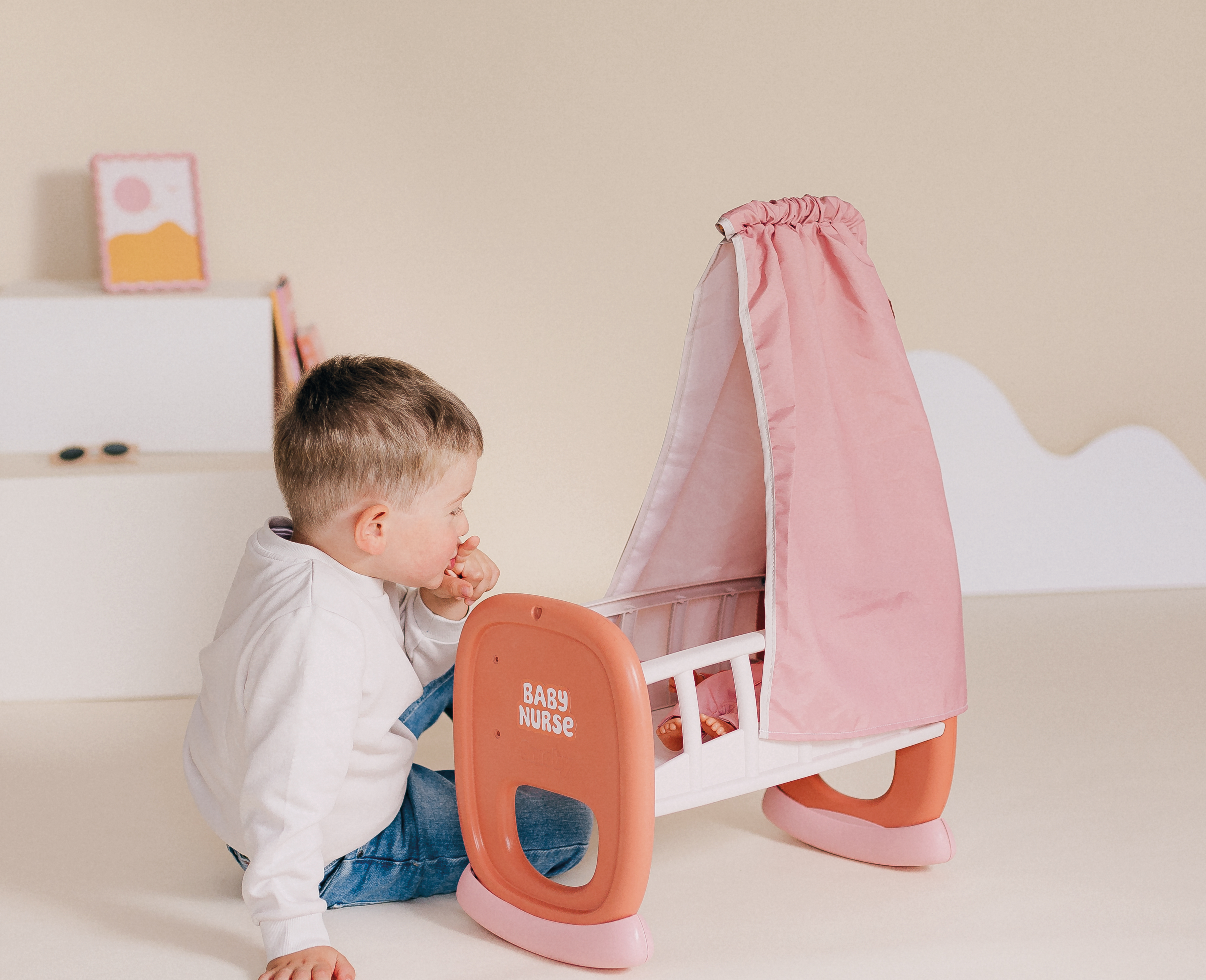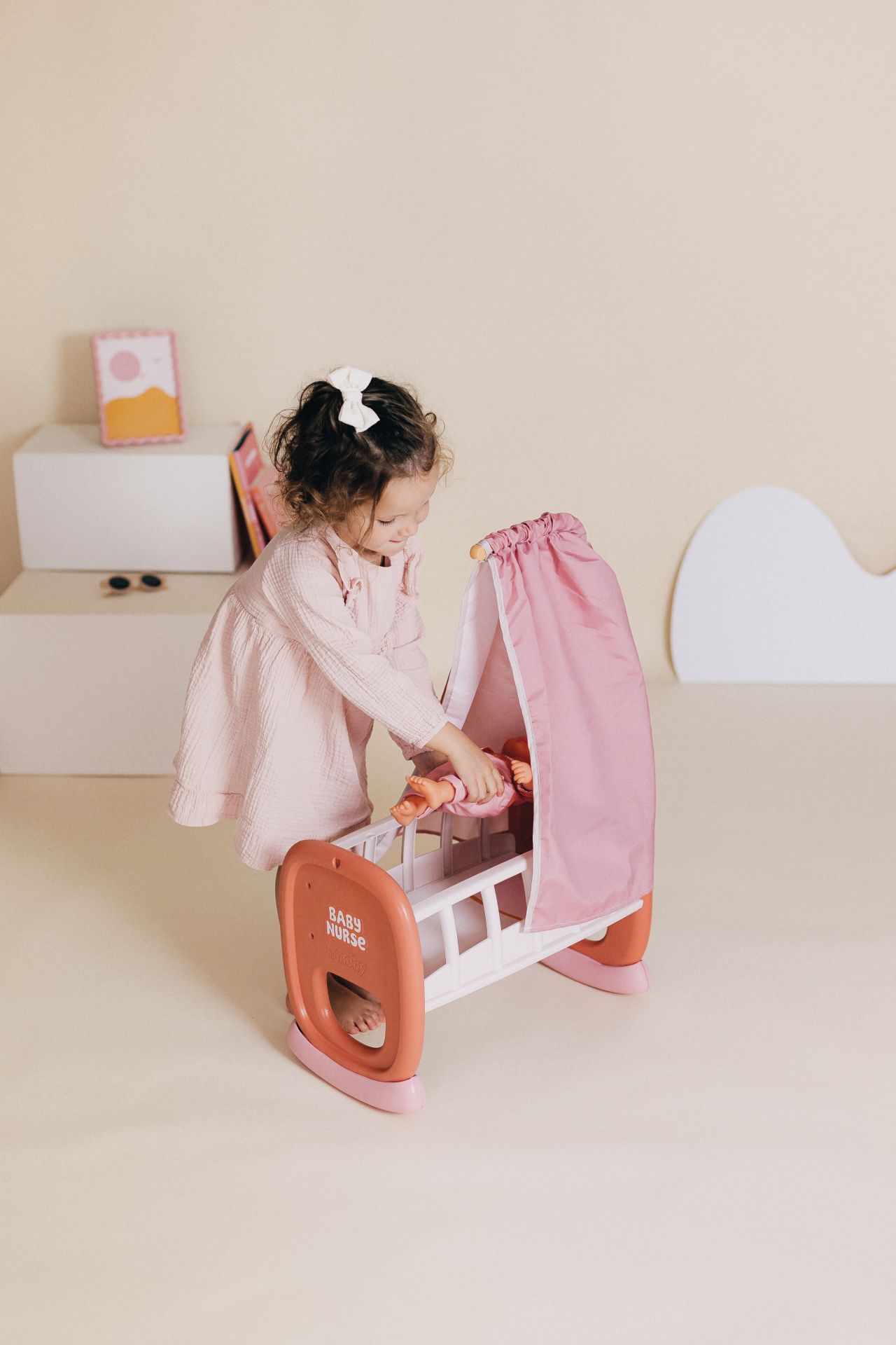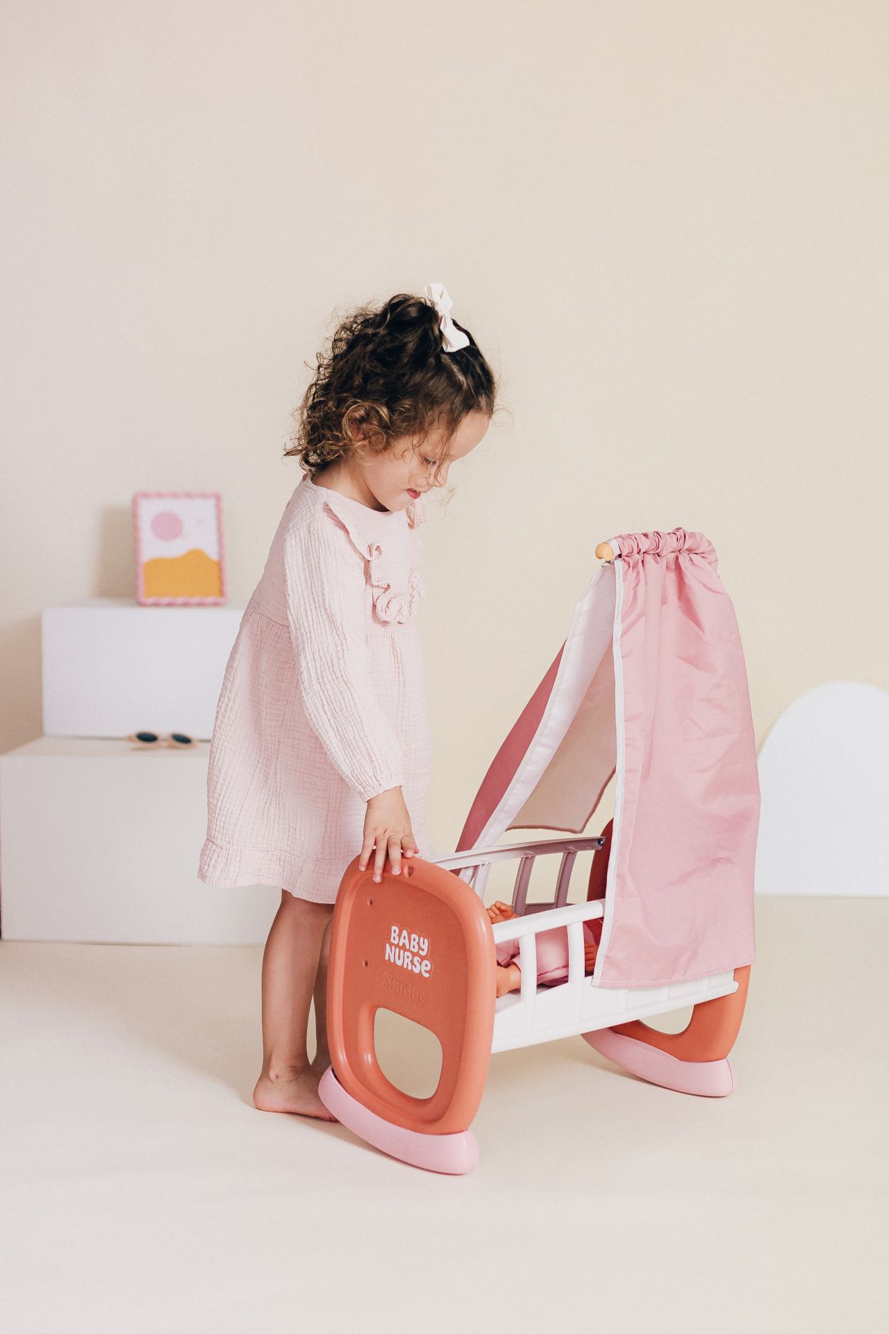 Baby Nurse Schommel Wieg met hemel zonder pop, voor poppen tot 42 cm