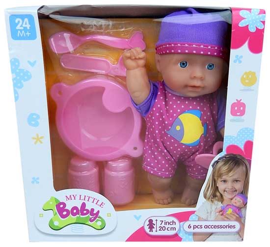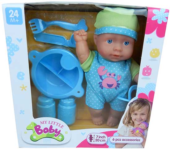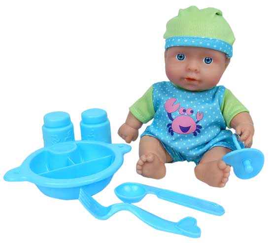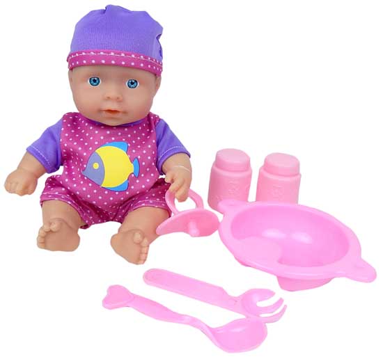 Baby Pop 21 cm met 6 delig eetsetje pop met zacht lichaam