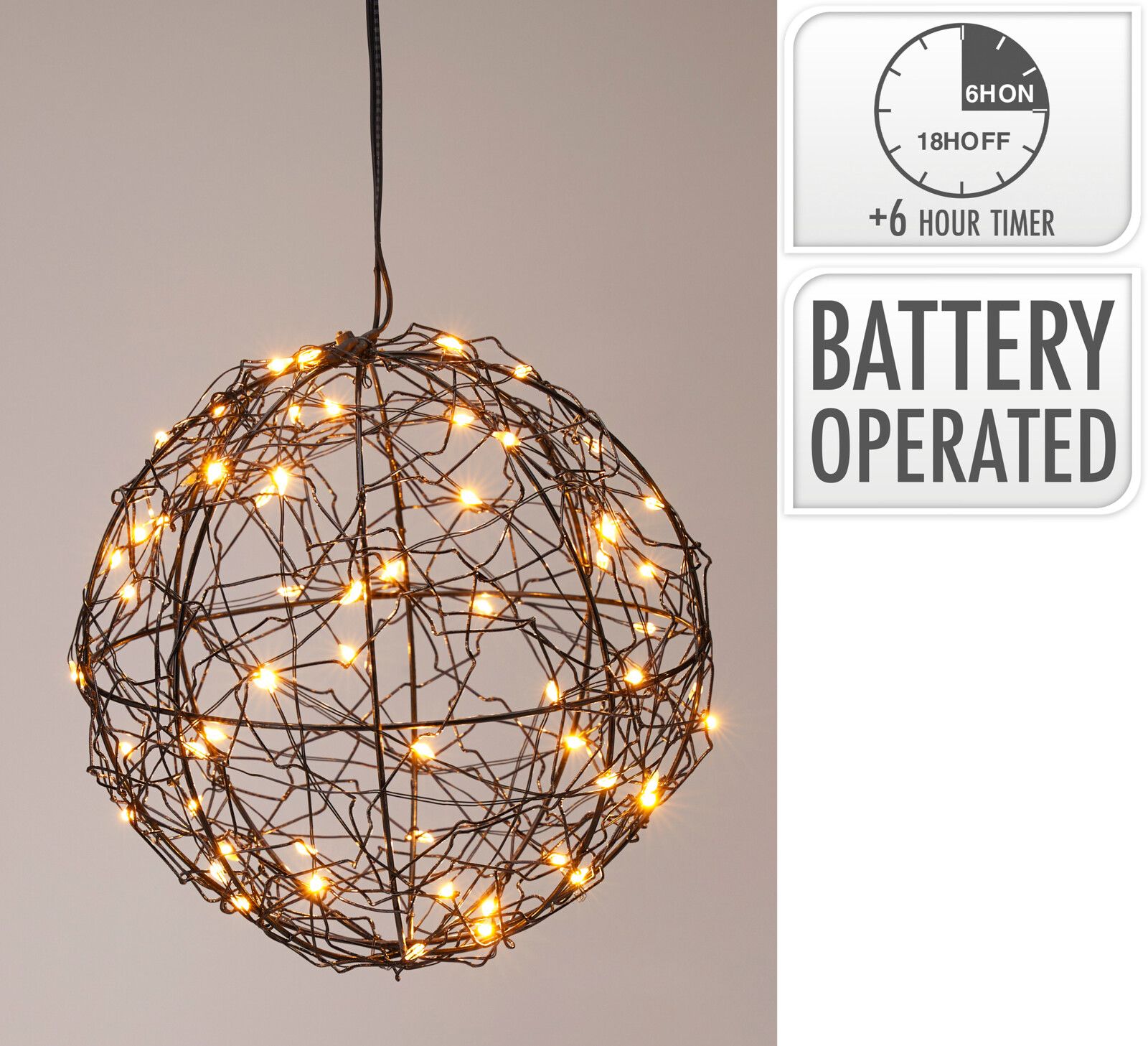 Bal LED Zwart 15cm - Metaal - 60 led - Warm Wit - met Batterijen (excl.)