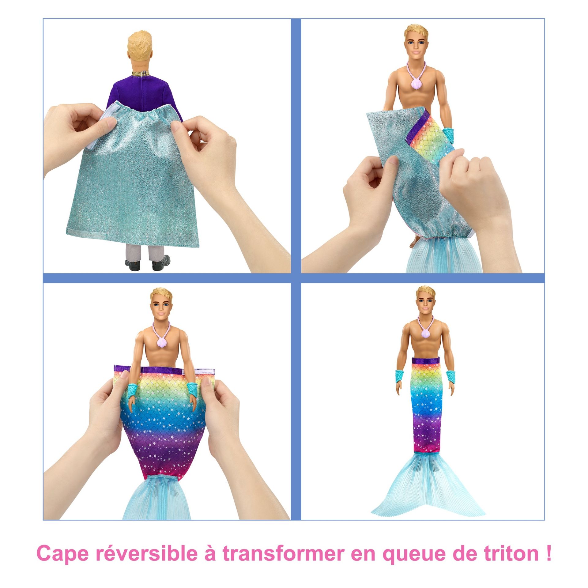 • Ken draagt een koninklijk pak met een cape die je kunt omkeren, waardoor het plotseling een zeemeermanstaart met regenboogprint wordt.