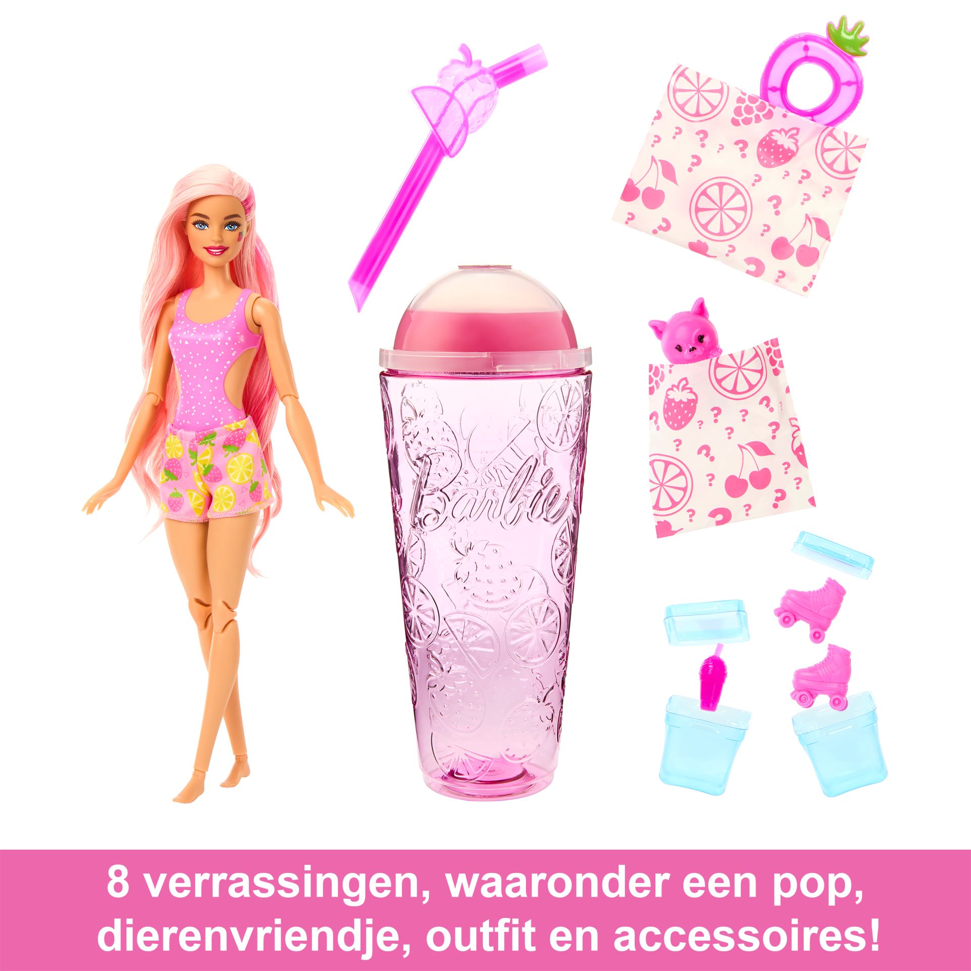 Plop de ijsblokjes open om rolschaatsen en een zacht minidrankje te vinden. Je kunt de ijsblokjes steeds weer opnieuw gebruiken! Kids blijven uitpakken! Een pop die naar fruit ruikt, een zacht, lekker ruikend dierenvriendje, een outfit en accessoires. Elke Pop Reveal Barbie pop is beweegbaar en heeft van kleur veranderend haar en make-up. Kinderen willen ze allemaal verzamelen! De poppen zijn per stuk verkrijgbaar en niet overal leverbaar. Poppen kunnen niet los staan. Kleuren en versieringen kunnen variëren.