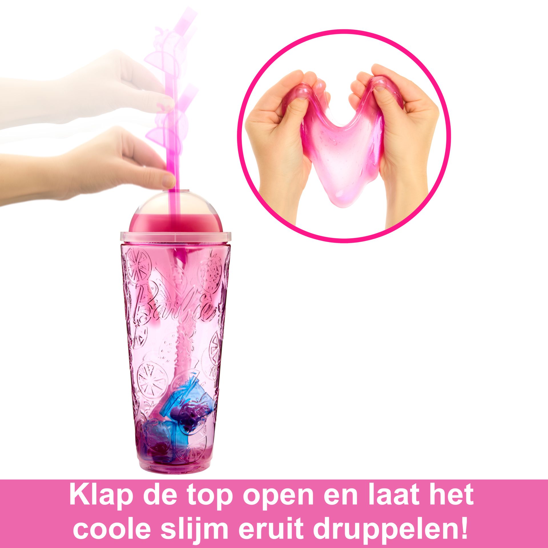 Barbie Pop Reveal poppen maken van uitpakken een feest met acht zintuiglijke verrassingen! Welke pop heb jij? Maak de verpakking die is geïnspireerd op een drinkbeker open en ontdek een van de vier smaken uit de serie Fruit: aardbeienlimonade, vruchtenbowl, watermeloensap of druivenprik. Open het deksel en haal de verrassingszakjes eruit, haal de bovenkant eraf en kijk hoe kleurig slijm over de ijsblokjes druppelt waarin de accessoires zich bevinden. Kids kunnen het zachte slijm eruit halen voor leuk zintuiglijk spel.