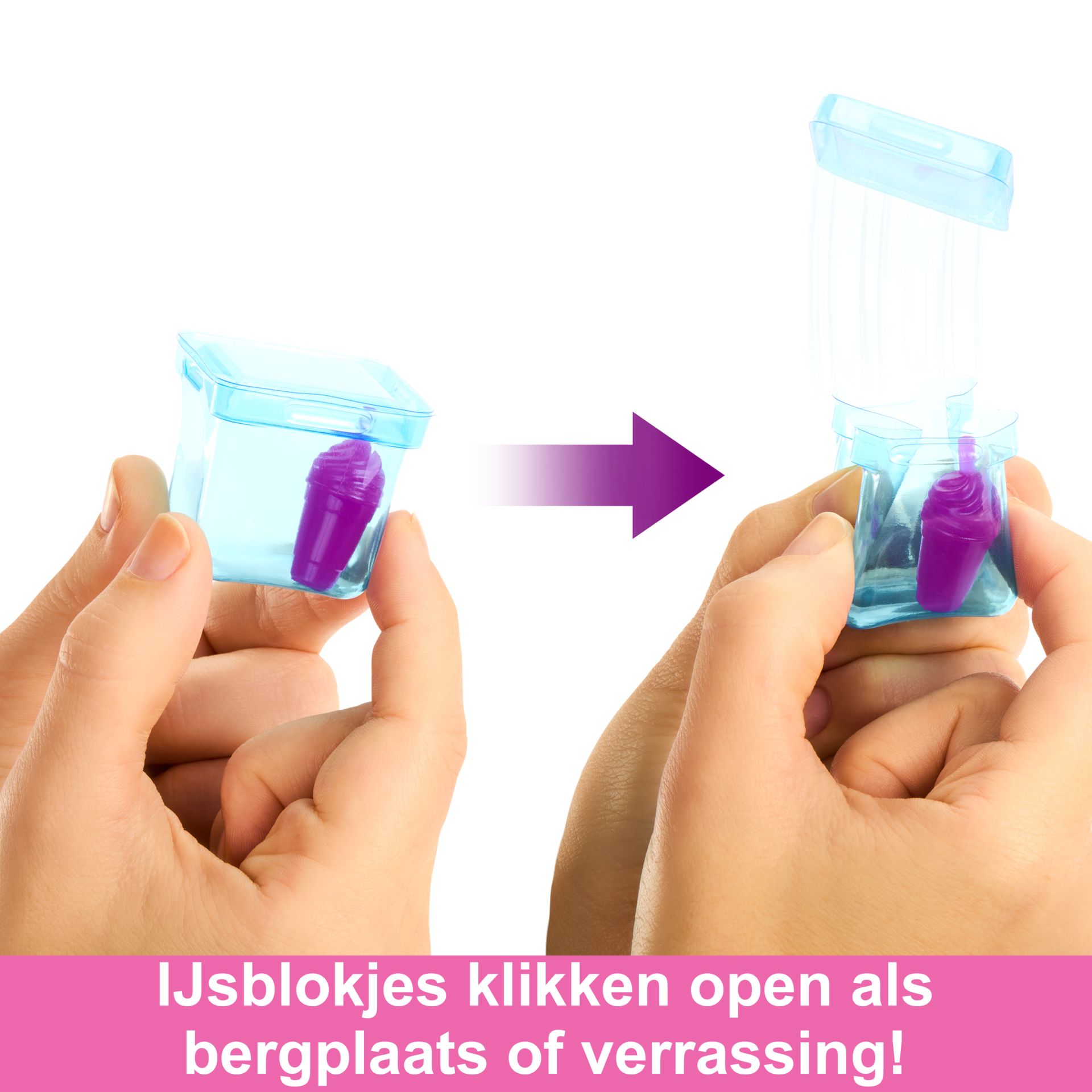 - Ontdek de extra onderdelen in de ijsblokjes die echt 'open ploppen', zoals een zachte minidrankje en rolschaatsen voor de Barbie pop. Je kunt de ijsblokjes ook als opbergruimte gebruiken en ze steeds opnieuw openen.