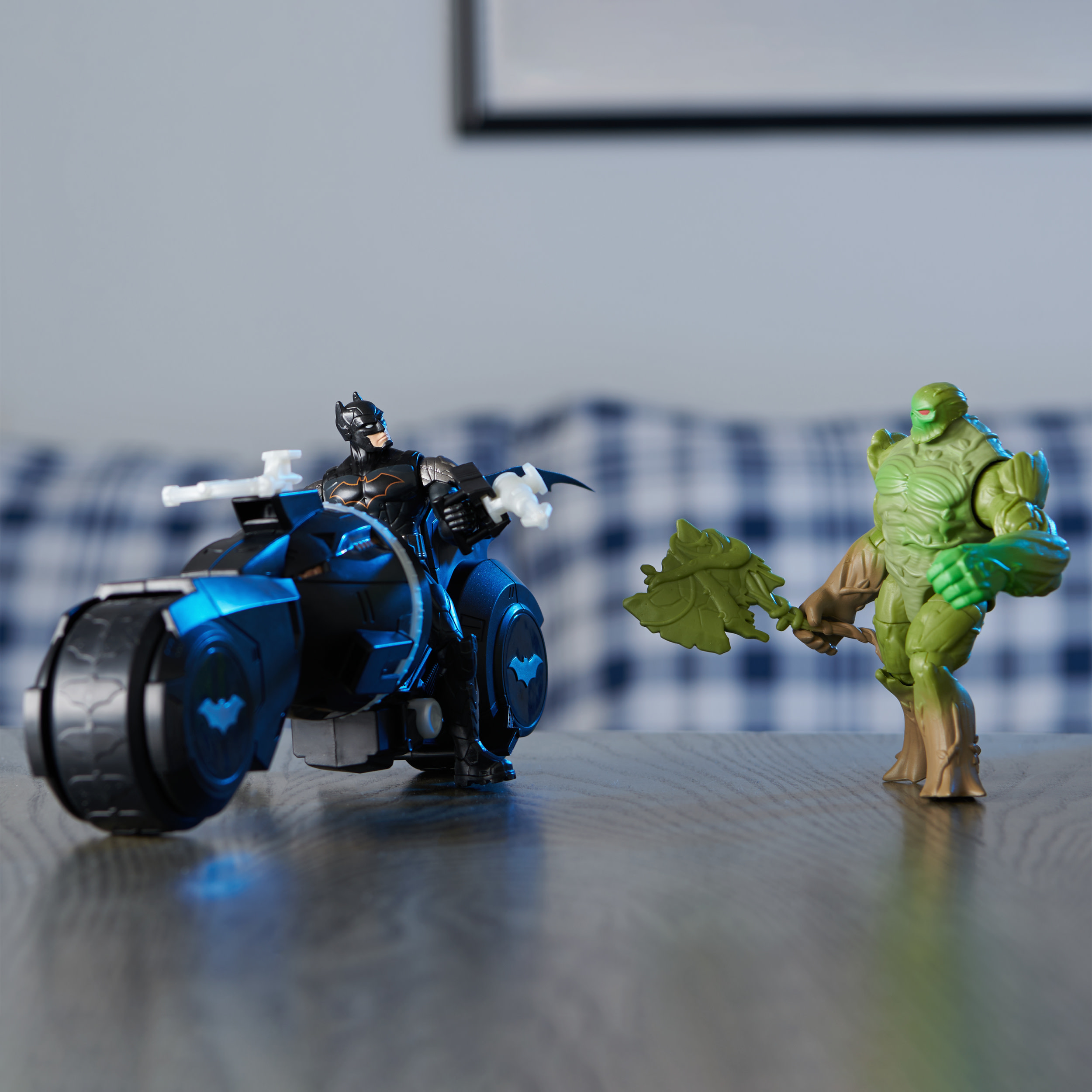 Deze set bevat een Armored Batman- en een Swamp Thing-actiefiguur van 10 cm, en een Armory Attack Batcycle met gedetailleerde vormgeving en een authentieke comic-stijl