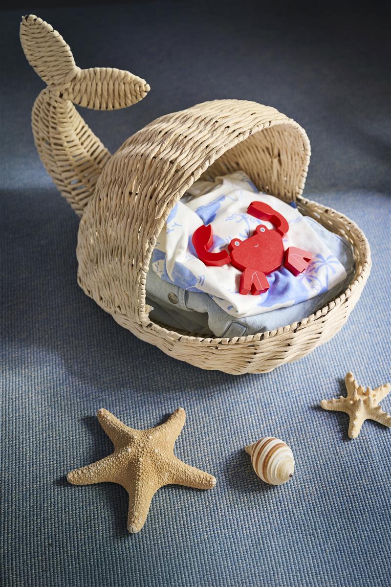 omringd door schelpjes, zeesterren en vrolijke vlaggetjes.