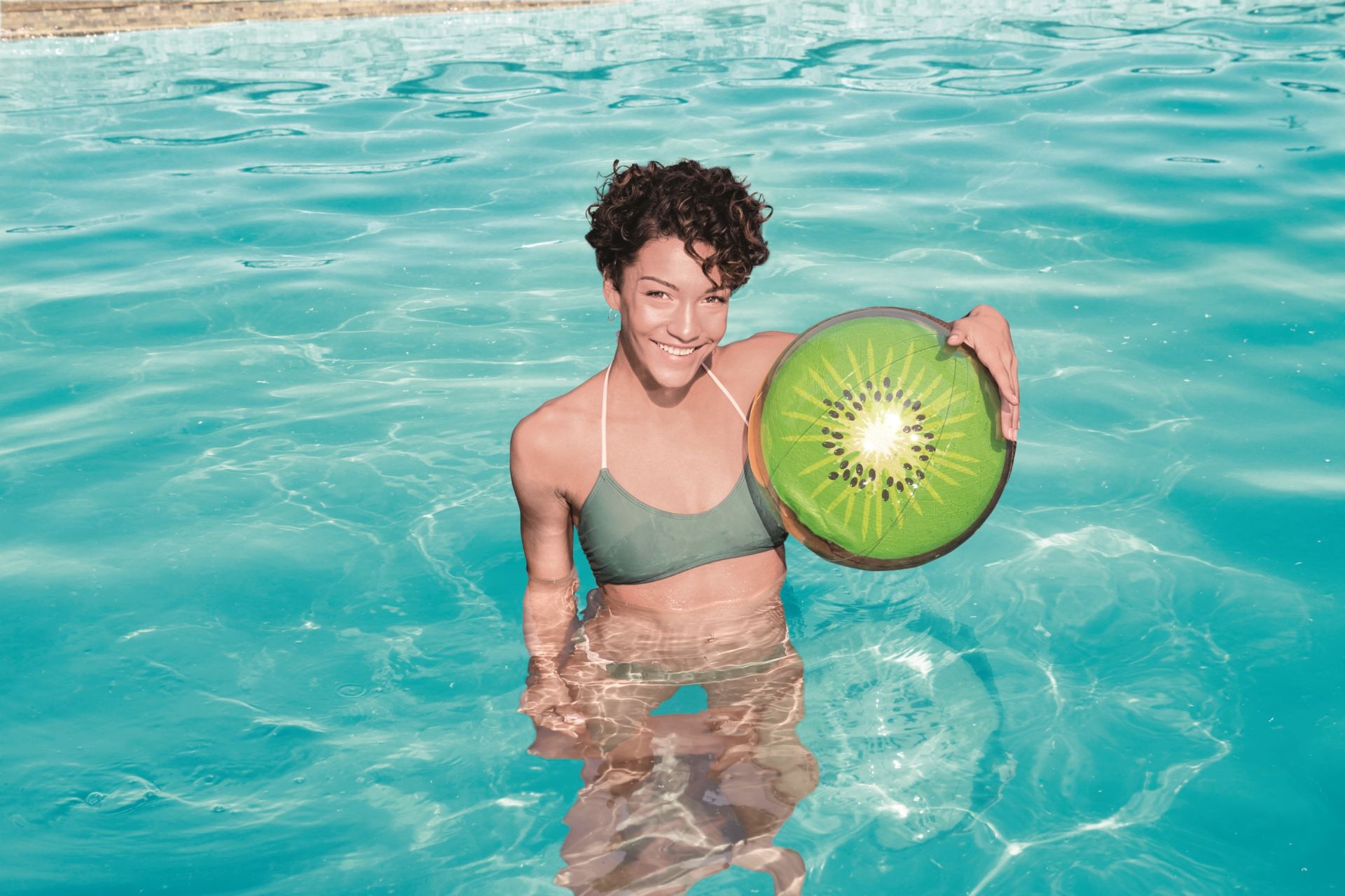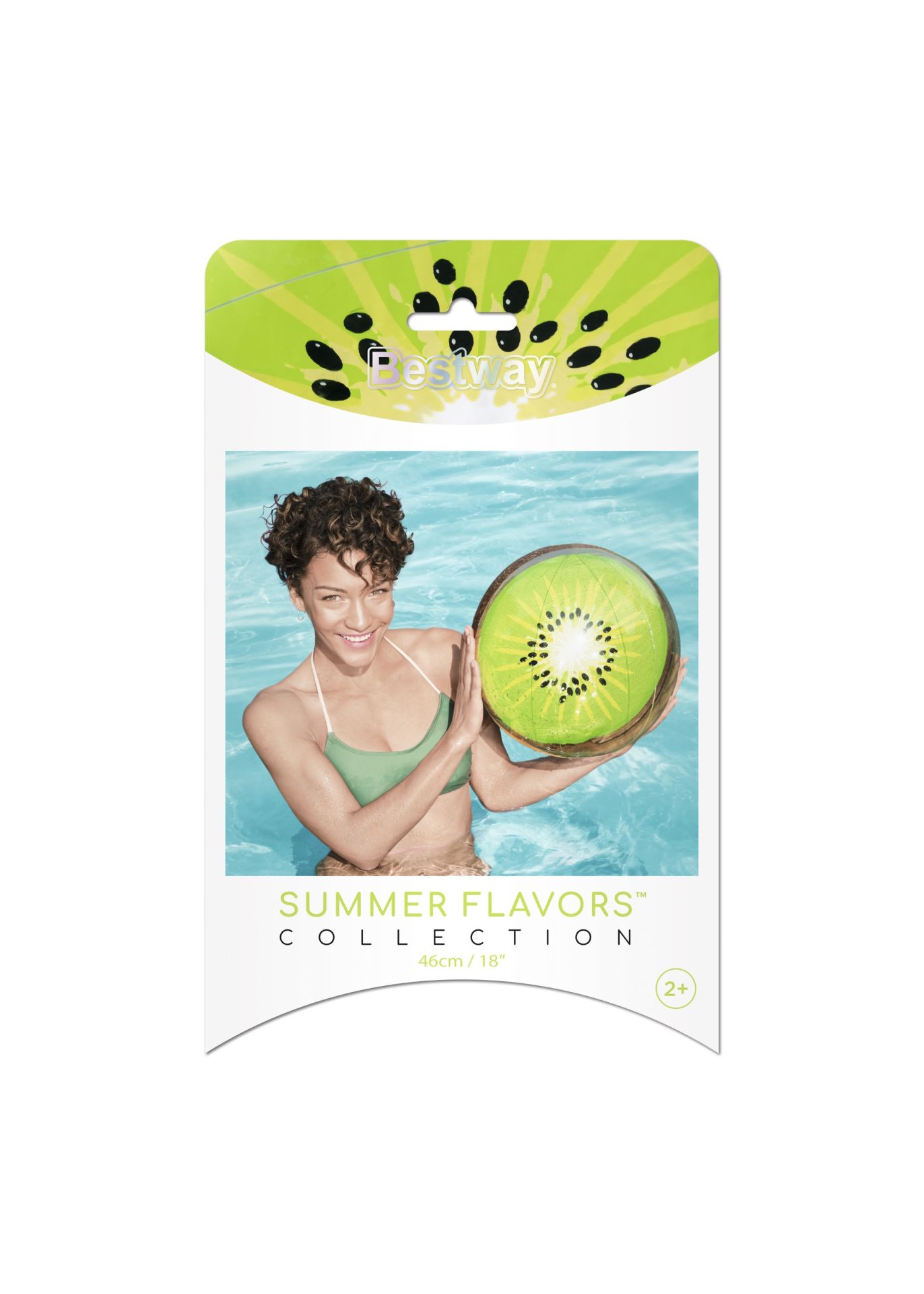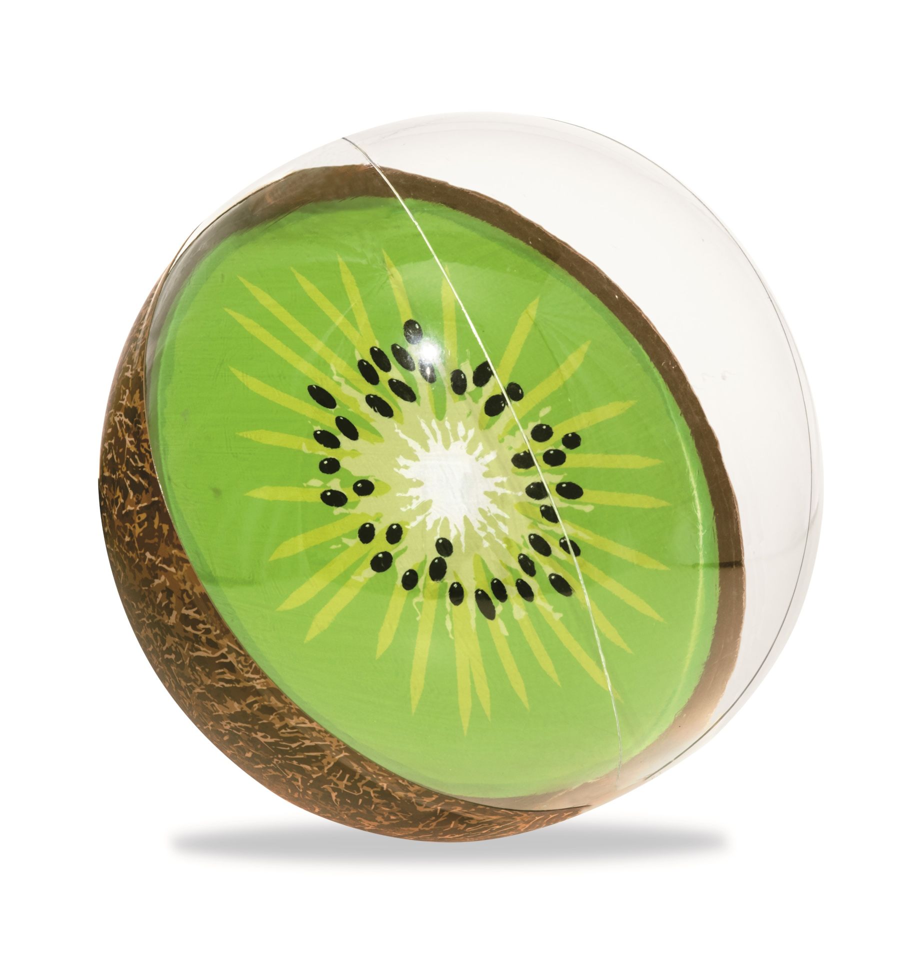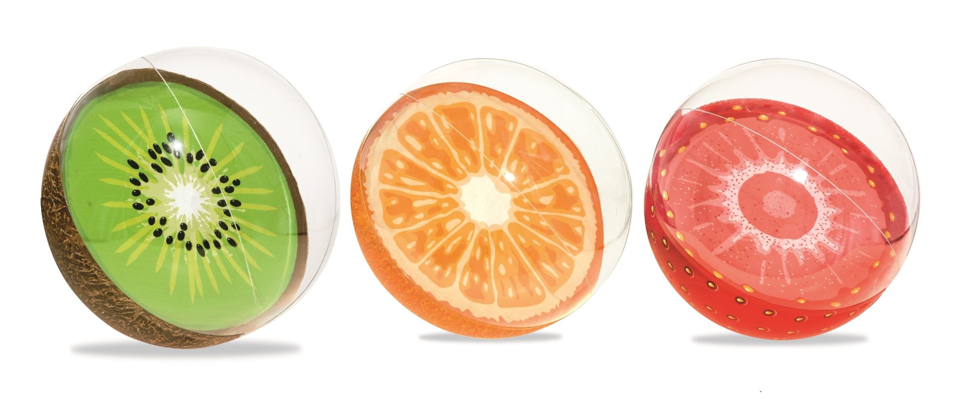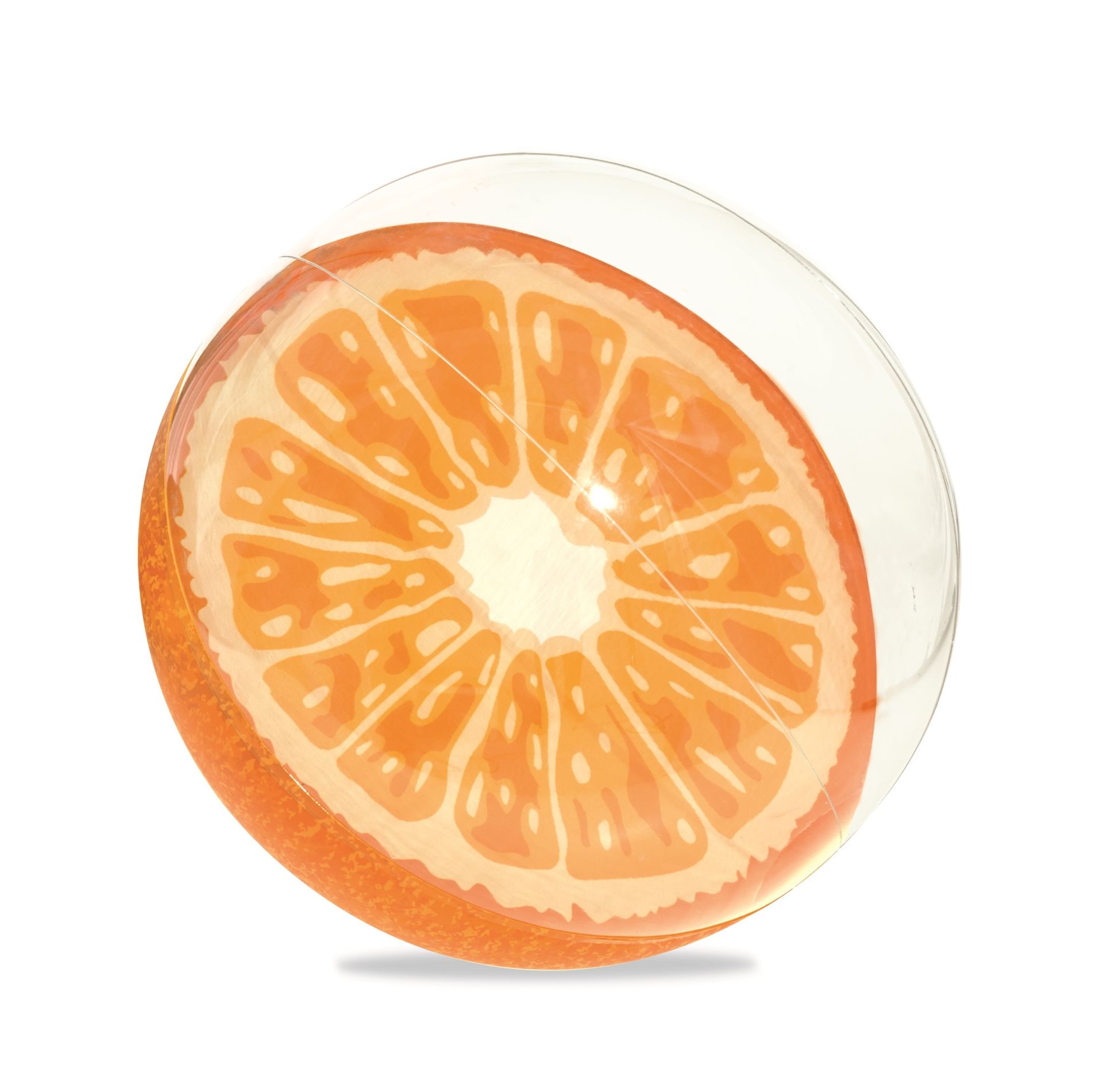 Grappige strandbal deels transparant en de andere helft als halve sinaasappel, aardbei of kiwi.