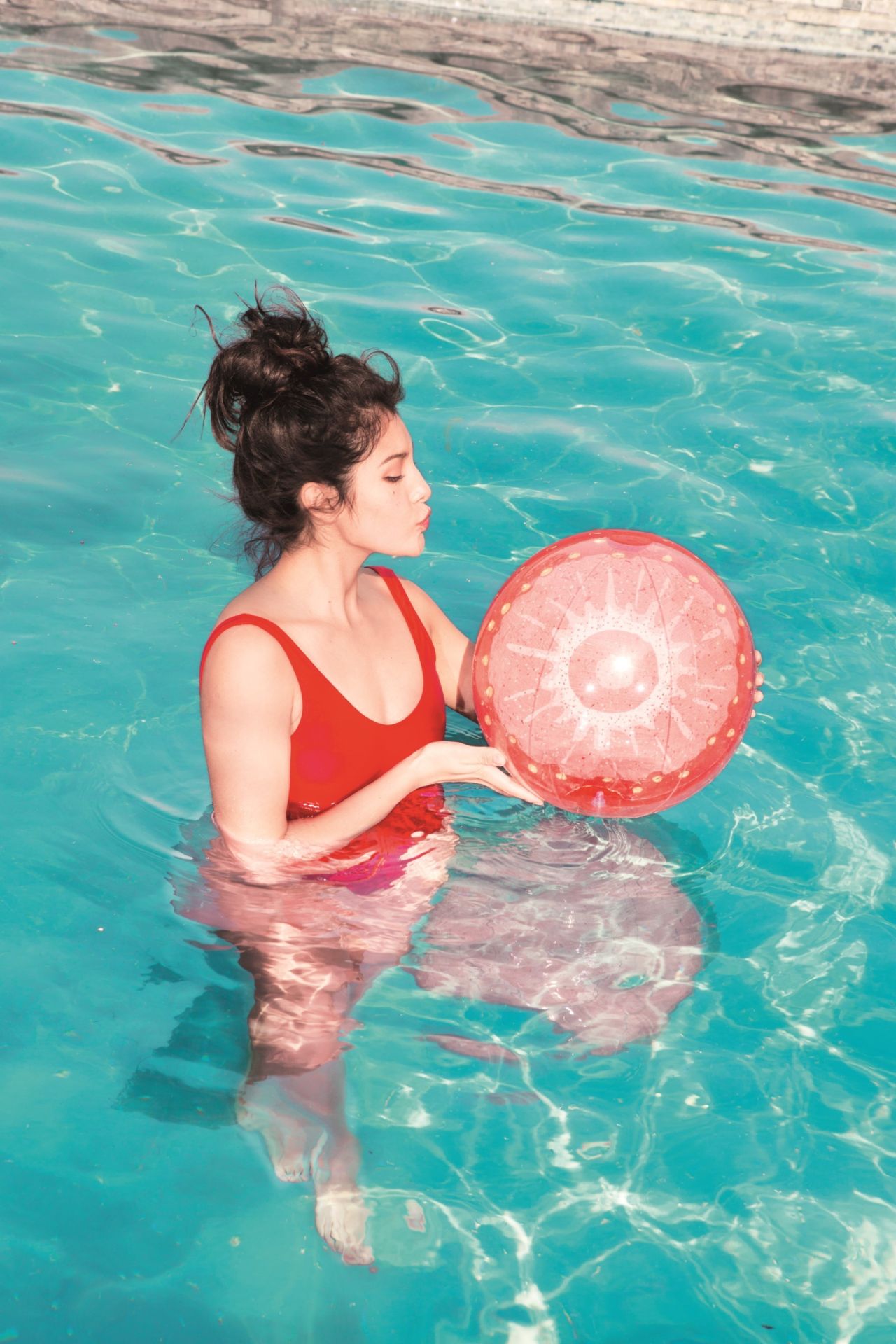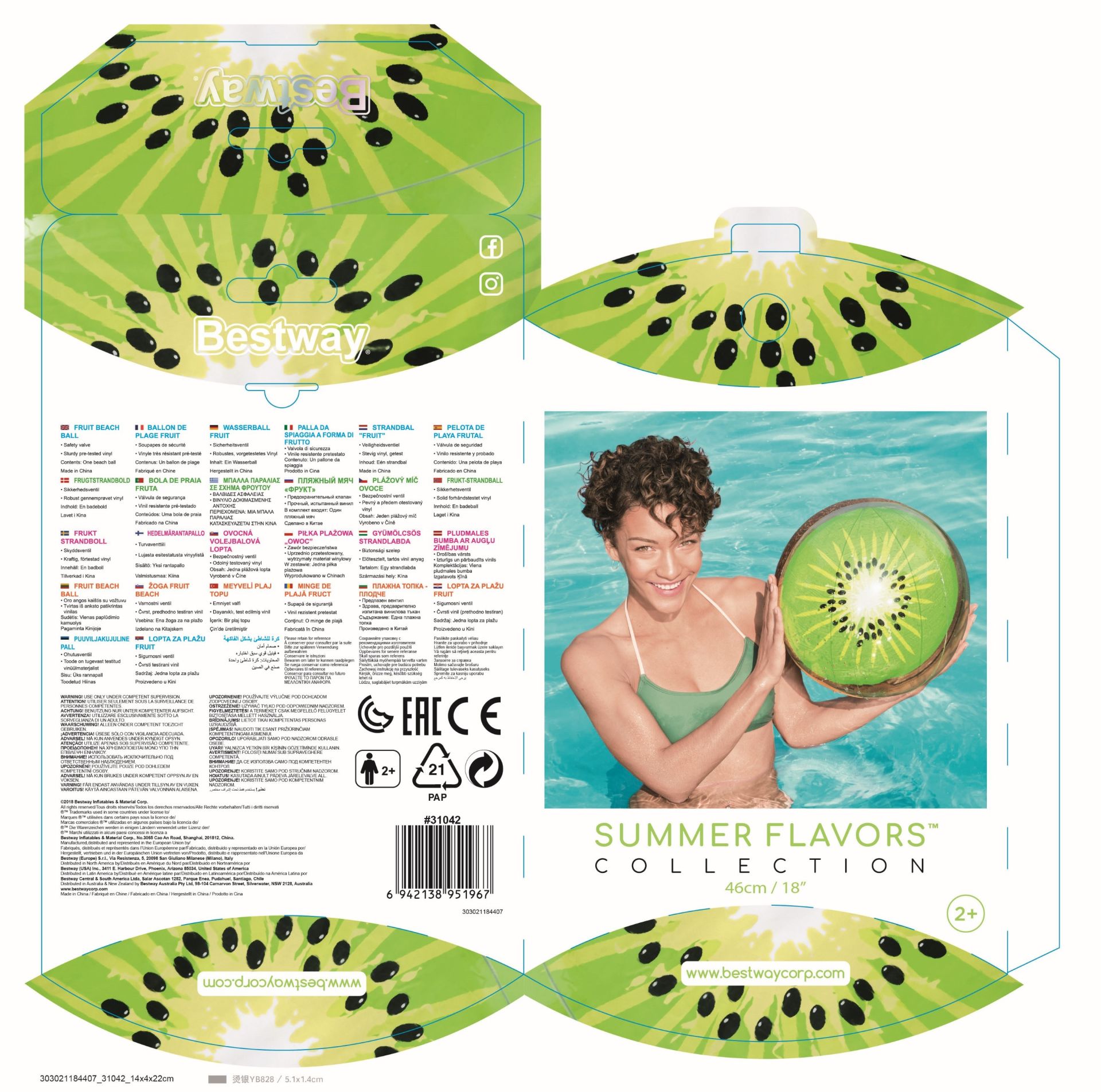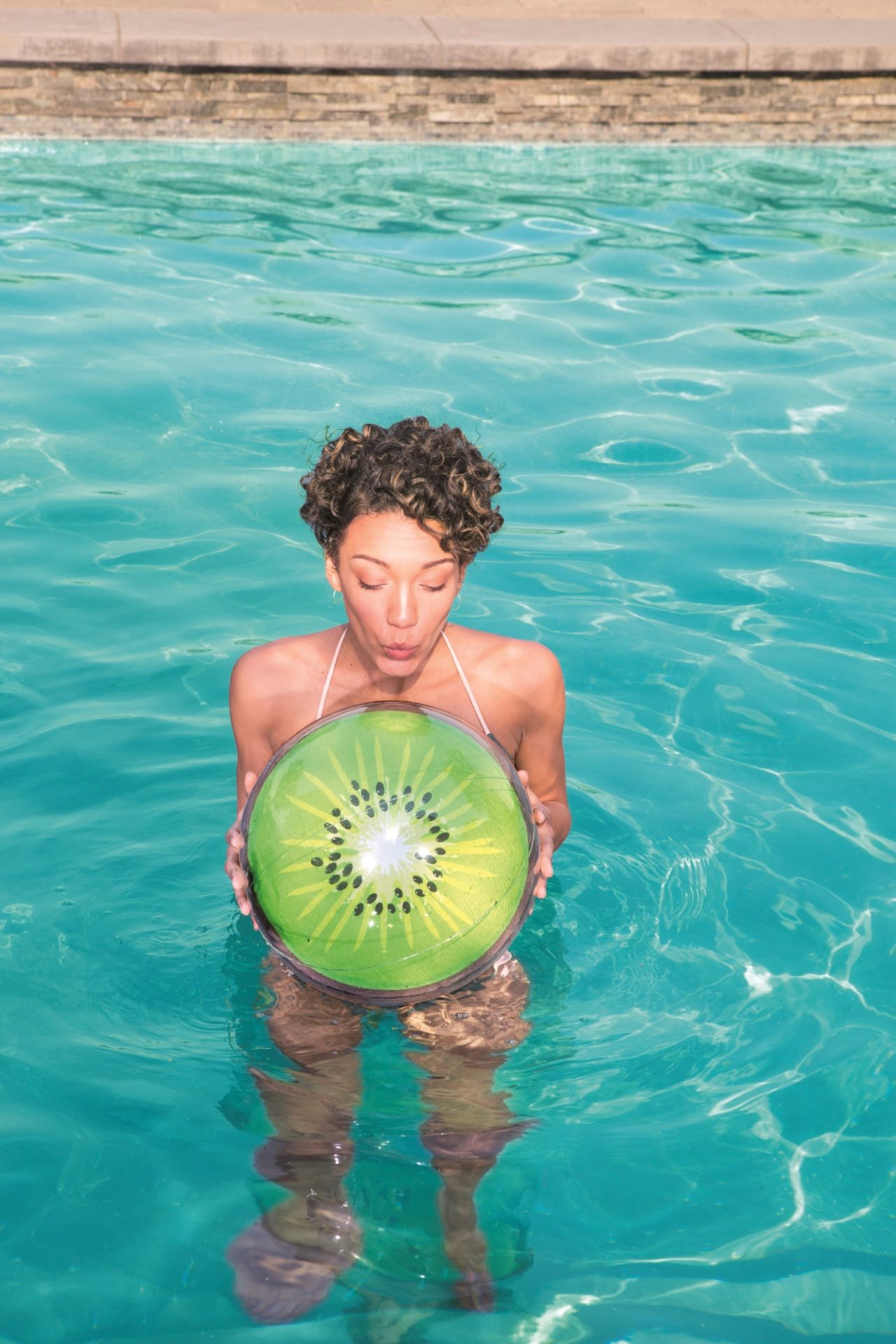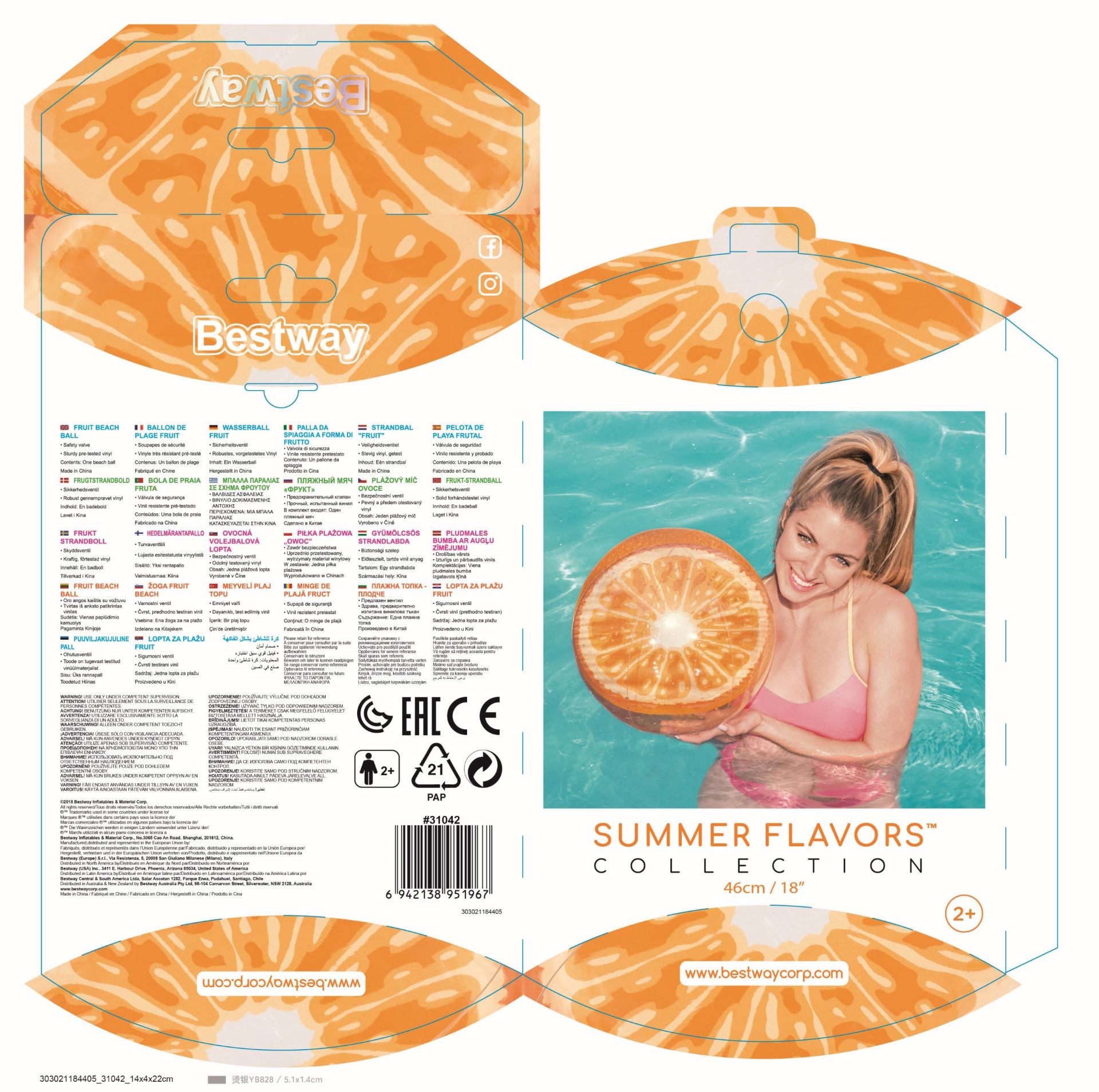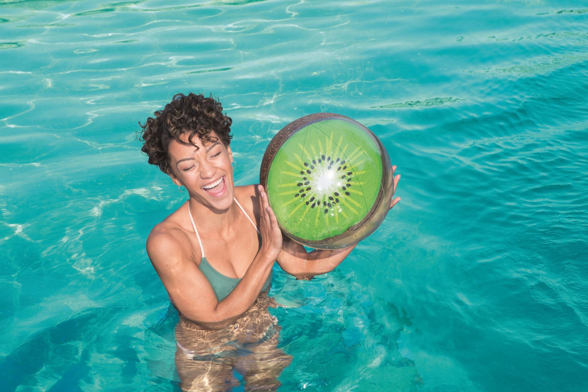 Grappige strandbal deels transparant en de andere helft als halve sinaasappel, aardbei of kiwi.