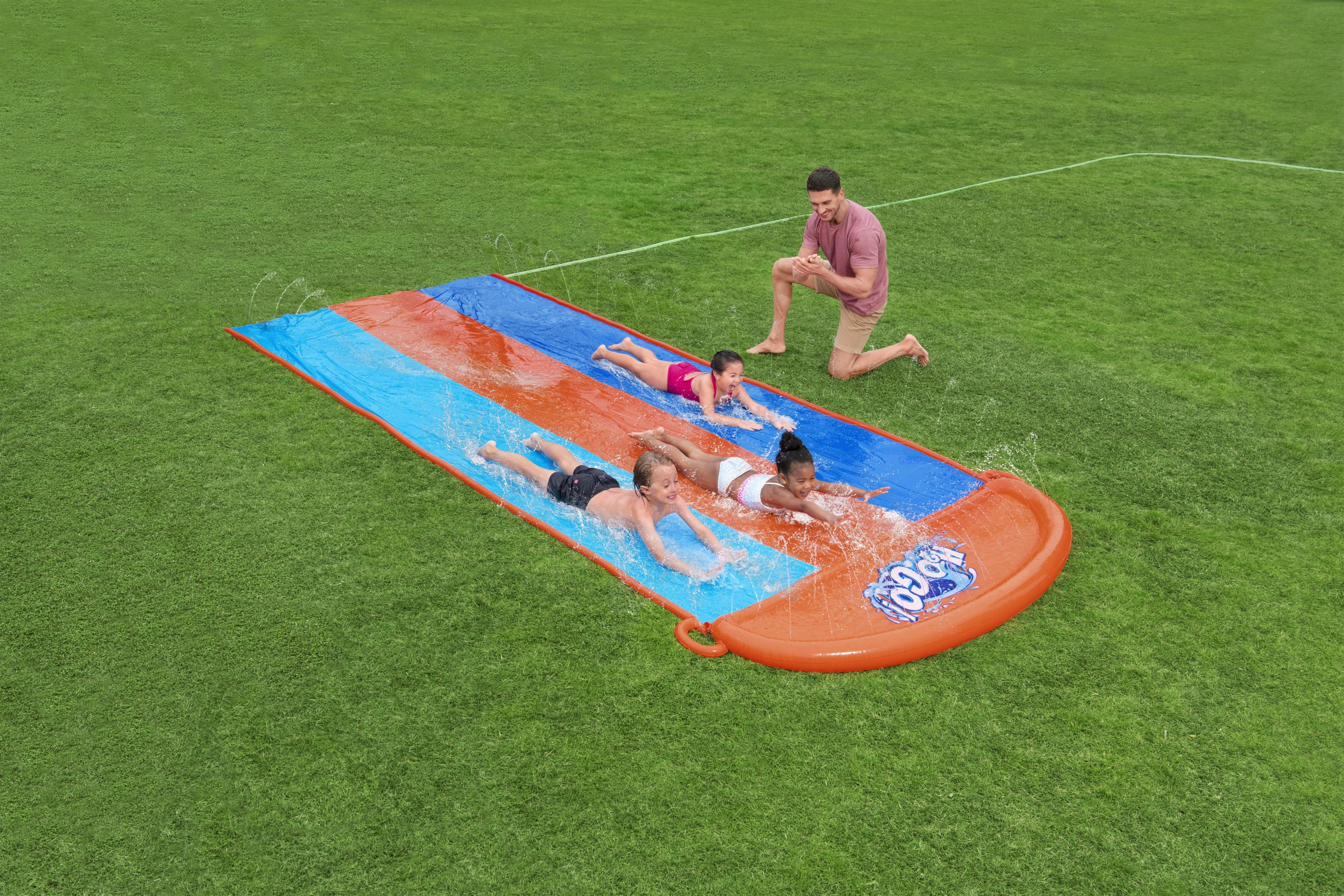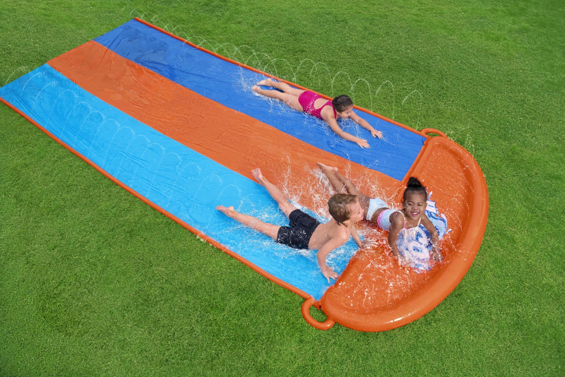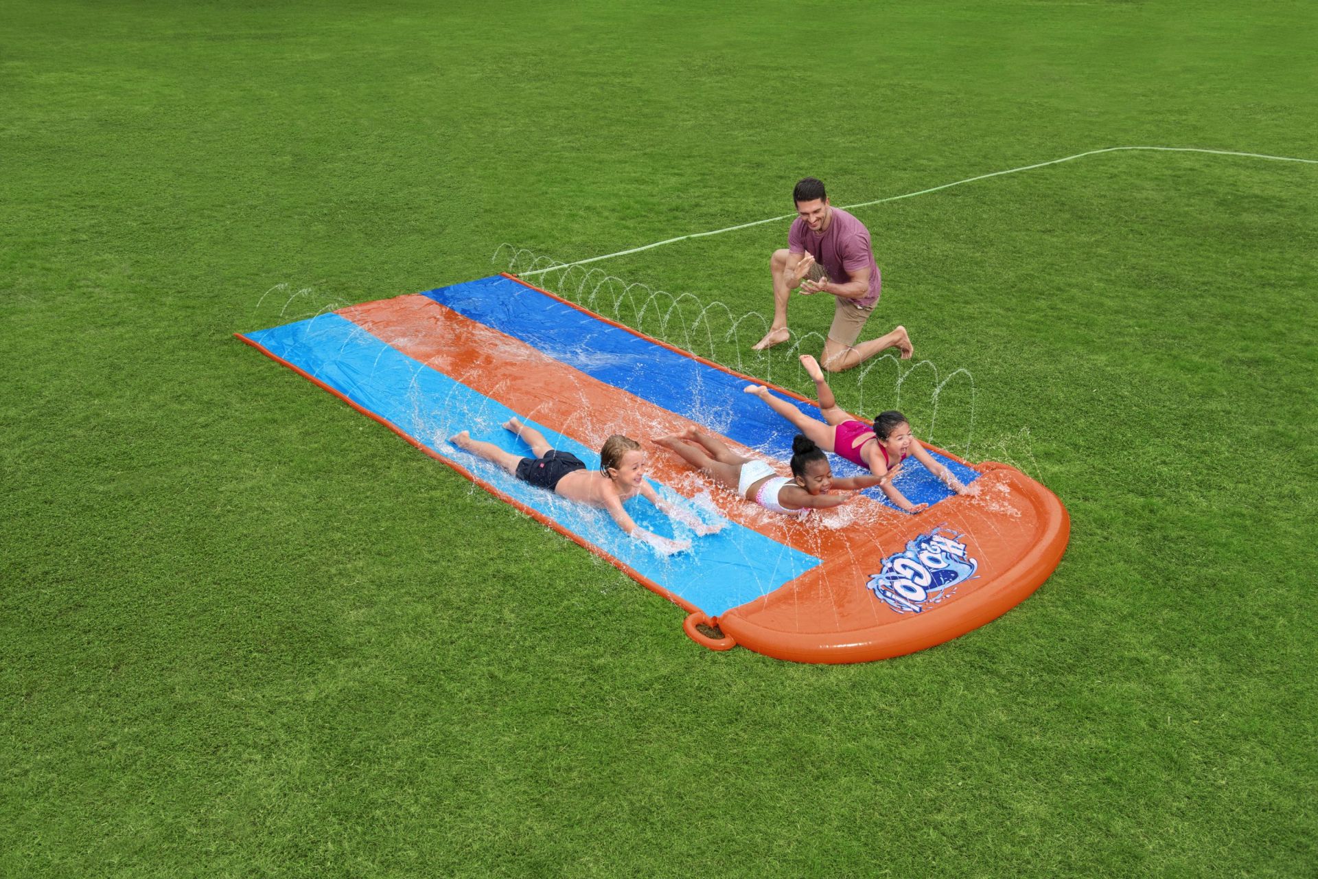 Waterglijbaan voor 3 kinderen tegelijk, met een helling en sprinklers rondom voor een zachte landing. Aansluiten op een tuinslang. Incl. reparatie patch. Leeftijd: 3+. Lengte: 549 cm.