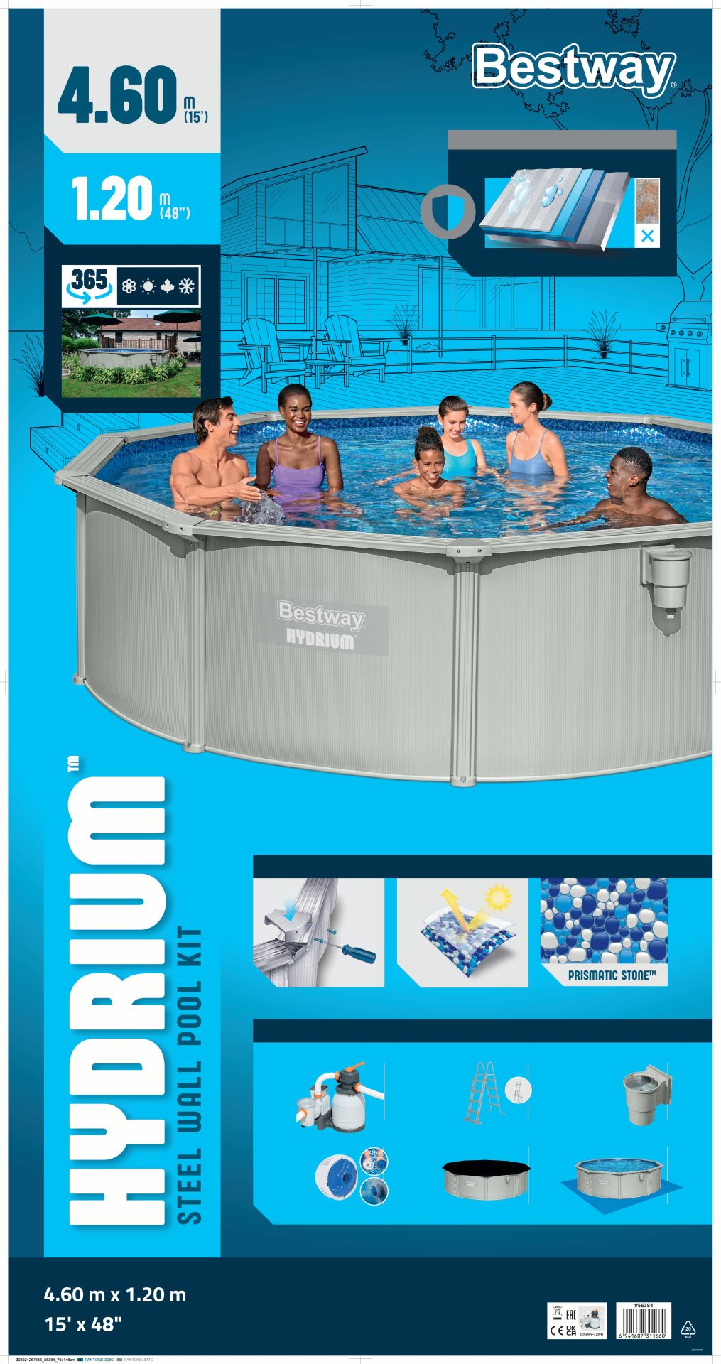 Hydrium 460 is een rond stalen wand bad met zandfilter. Wanden van versterkt staal met een liner van pvc 30/100 bieden comfort en stevigheid. Dit solide bad heeft verder nog een extra rand van 16 cm rondom ter versteviging. Geïntegreerde skimmer. Het bad kan het hele jaar door blijven staan, mits de voorschriften goed worden nagevolgd.