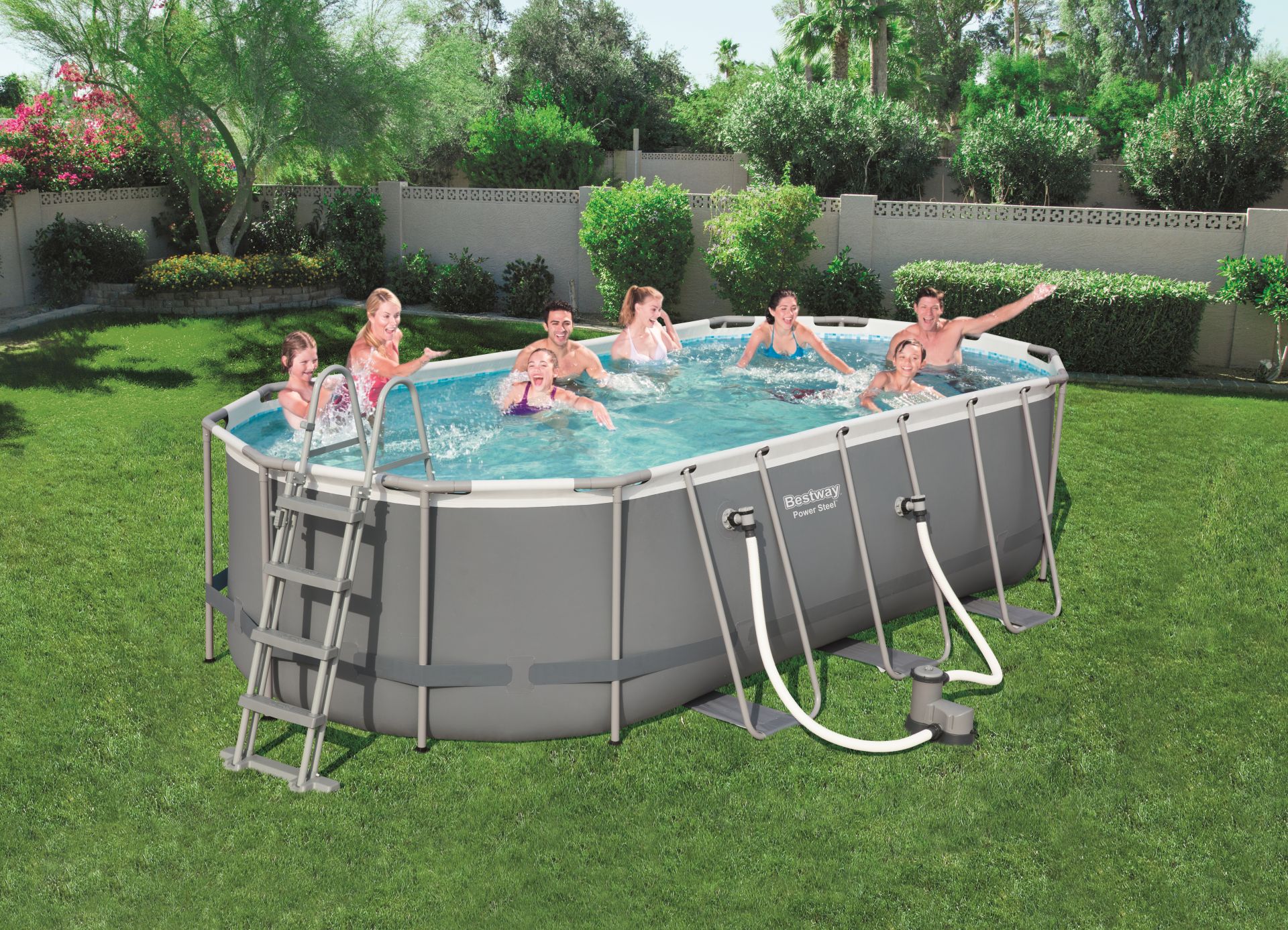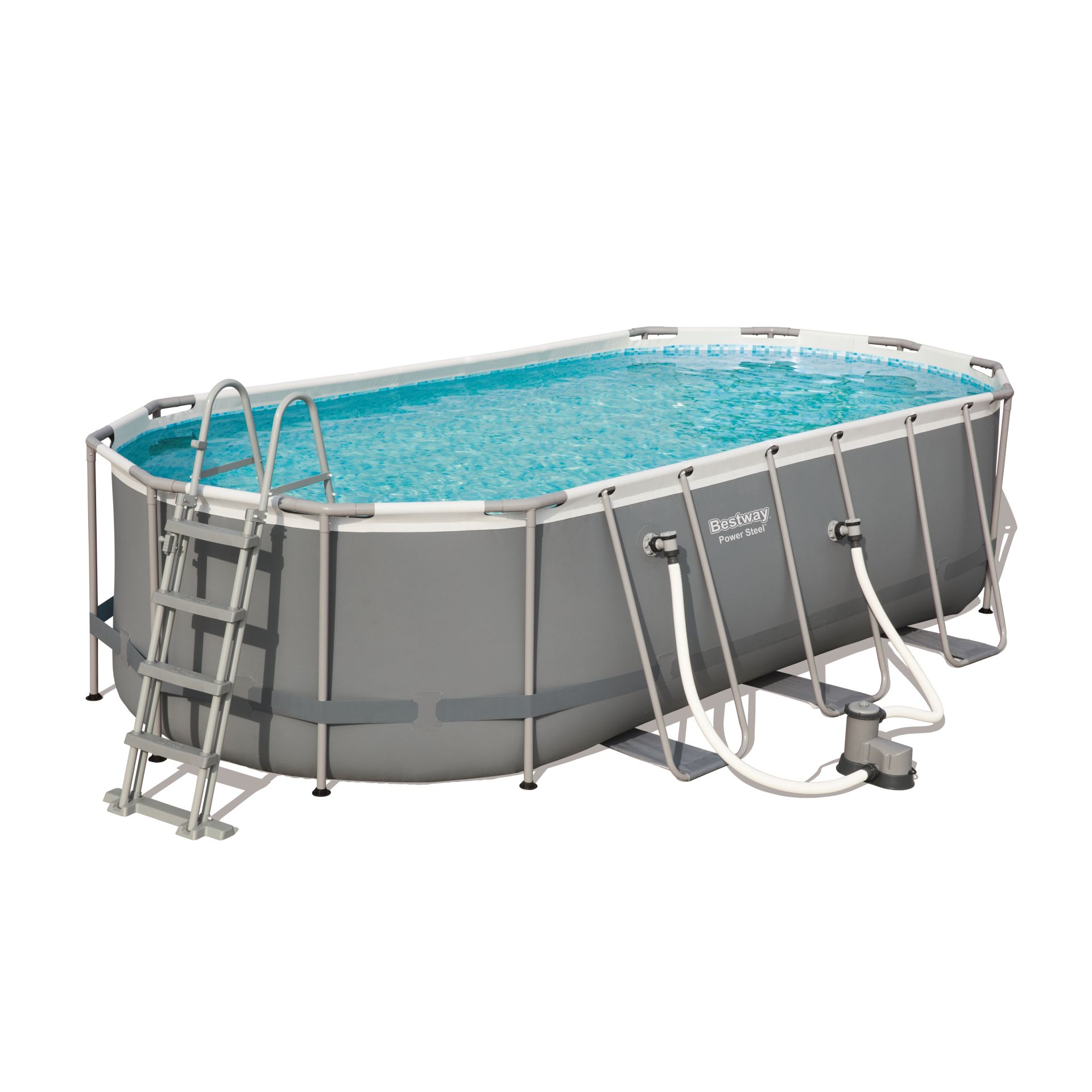 Het Bestway Power Steel Zwembad is een prima keus voor een familie zwembad. Dit ovaal bad is gemaakt van TriTech materiaal met een corrosiebestendig stalen frame. Het bad is eenvoudig te installeren, zonder verder gereedschap. Voor extra versteviging is er een 3-laags PVC band onder aangebracht. De neutraal grijze liner heeft een mozaïek print aan de binnenzijde. Deze complete set bestaat uit: zwembad, cartridgefilter 5,7m³/u, zwembadladder en afdekhoes. De cartridge dient u gemiddeld eens per 14 dagen te vervangen, cartridgetype III. Inclusief afvoerplug.