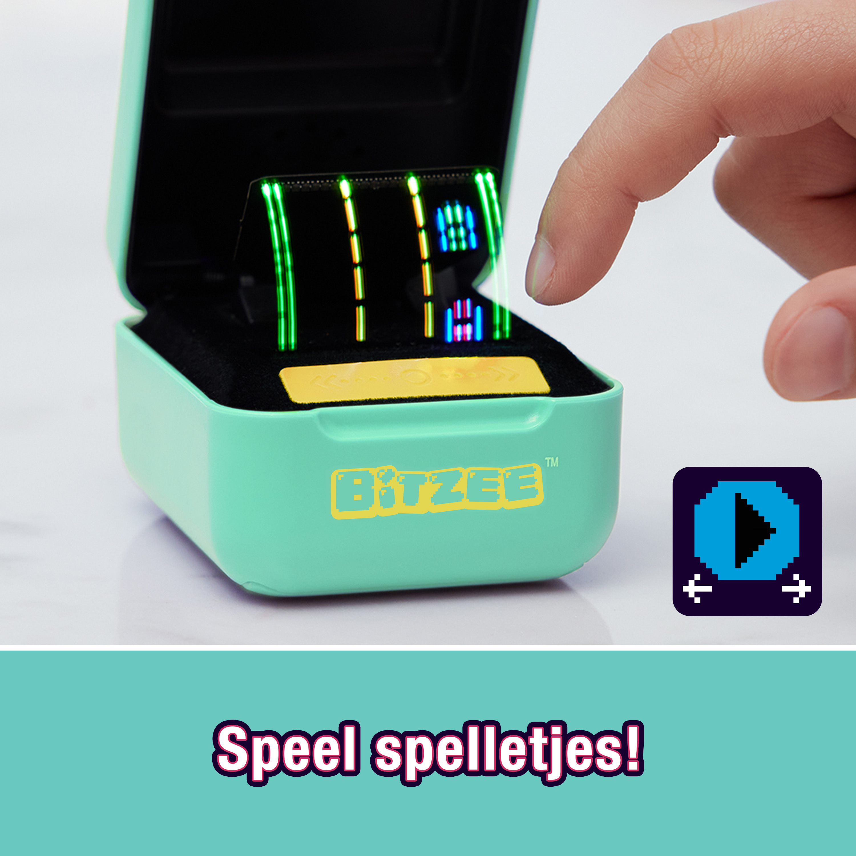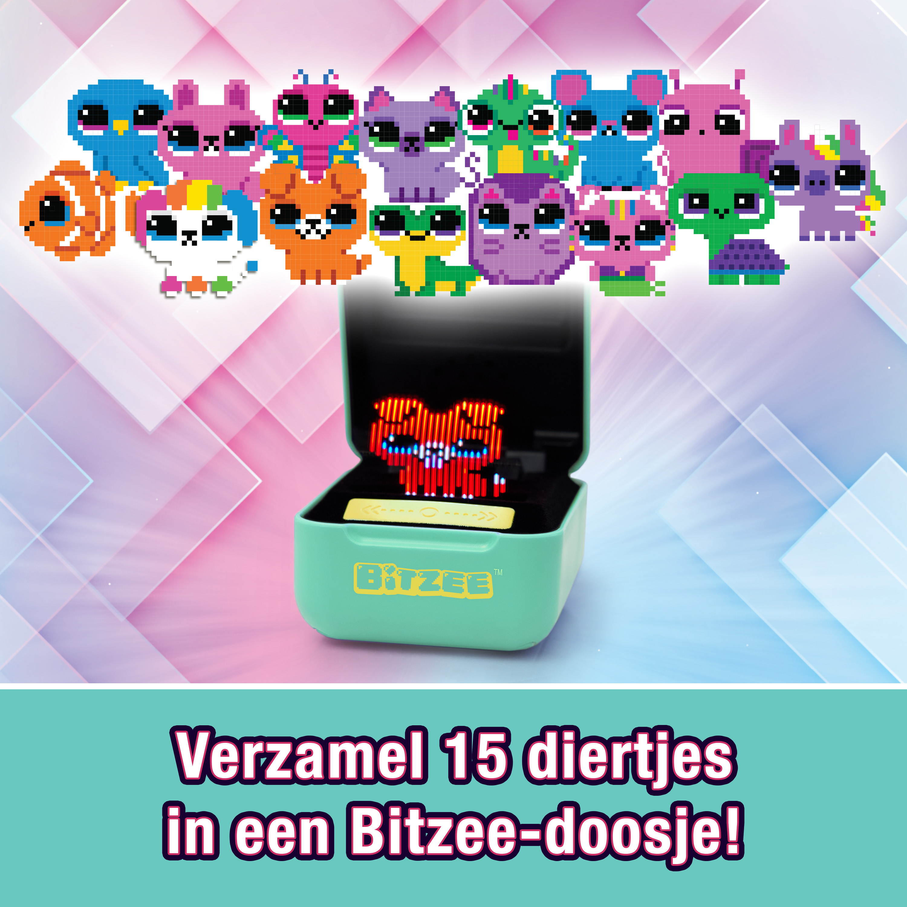 Bitzee: het ultieme digitale huisdier! Een doosje met 15 virtuele diertjes die je echt kunt aanraken en verzorgen. Aaien, eten geven, optillen en schudden maar, en Bitzee reageert met fascinerende geluiden en reacties. Begin met een schattige baby puppy en geef hem alle liefde en zorg die hij nodig heeft om te groeien. Hoe meer je speelt, hoe meer huisdieren je verzamelt! Voer ze, speel met ze, wieg ze in slaap, ruim hun rommel op en geef ze alle liefde die ze verdienen. Hij groeit van baby naar uiteindelijk een Super Bitzee! Ontgrendel elk uniek Super Bitzee huisdiertje en ontdek bijzondere outfits en spelletjes. Gebruik traktaties om nieuwe virtuele diertjes te verzamelen tot wel 15 verschillende huisdiertjes in jouw doosje. Inclusief 3 AA-batterijen. Bitzee, het robot speelgoed is perfect voor kinderen die gek zijn op animatie, elektronisch speelgoed, verrassingsspeelgoed, dierenspeelgoed en STEM-speelgoed. Maar ook volwassenen zullen betoverd worden door Bitzee's innovatieve en schermvrije benadering van speelgoed en spelletjes uit de jaren 90! Maak een statement en verleg de grenzen met Bitzee, het robot speelgoed! Perfect als verjaardagscadeau, sinterklaascadeau, kerstcadeau of voor elke andere gelegenheid.