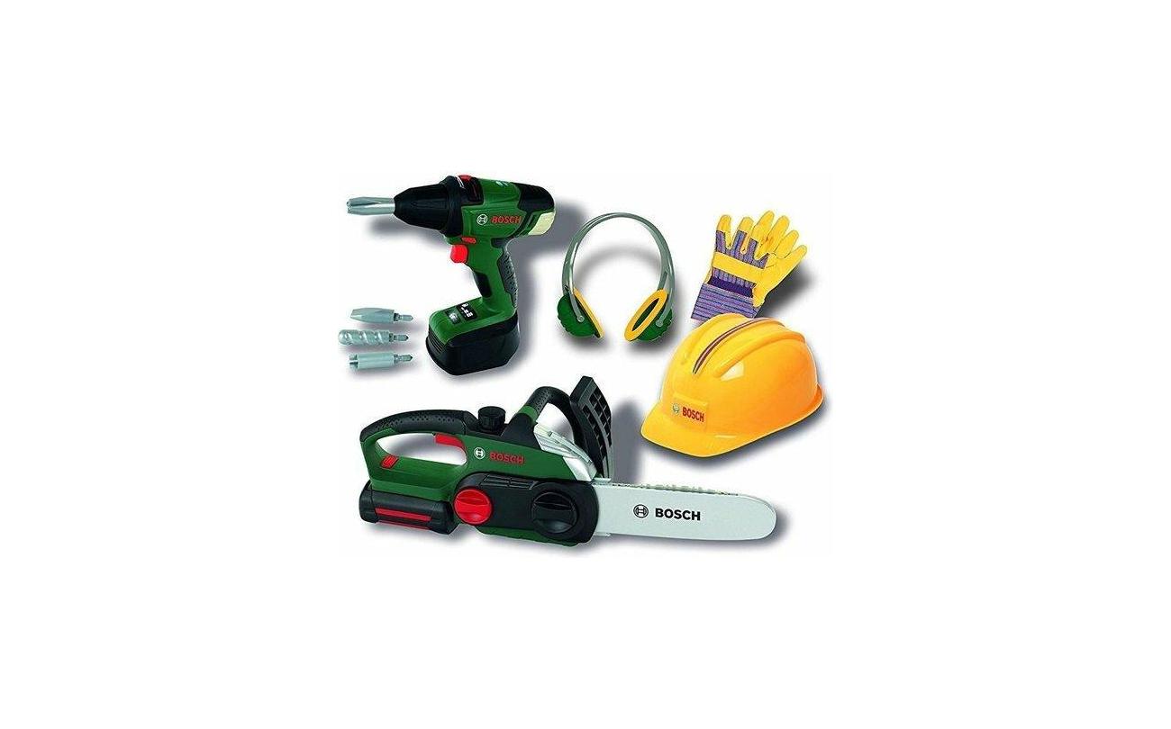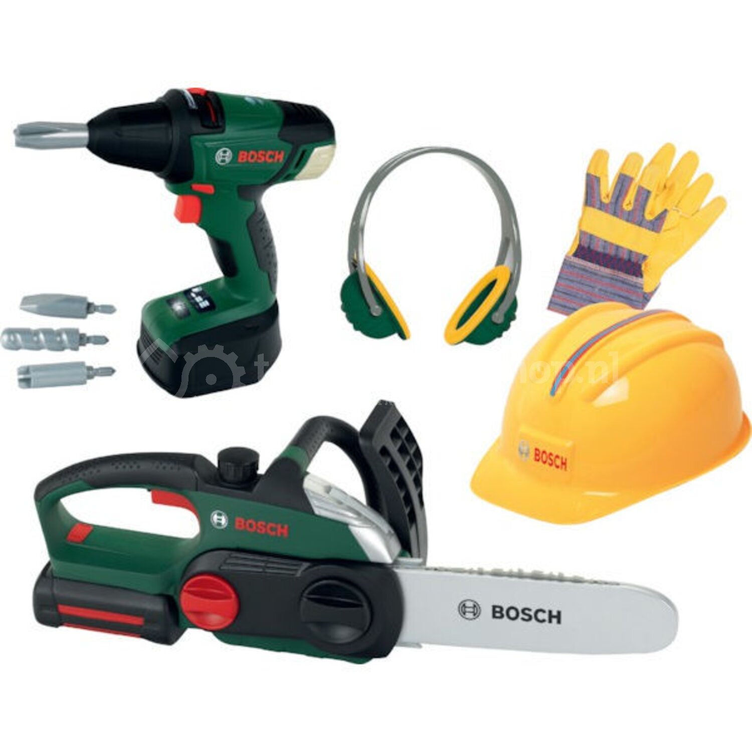 Bosch Werktuigenset, kettingzaag, boormachine, helm, hoofdtelefoon en handschoenen