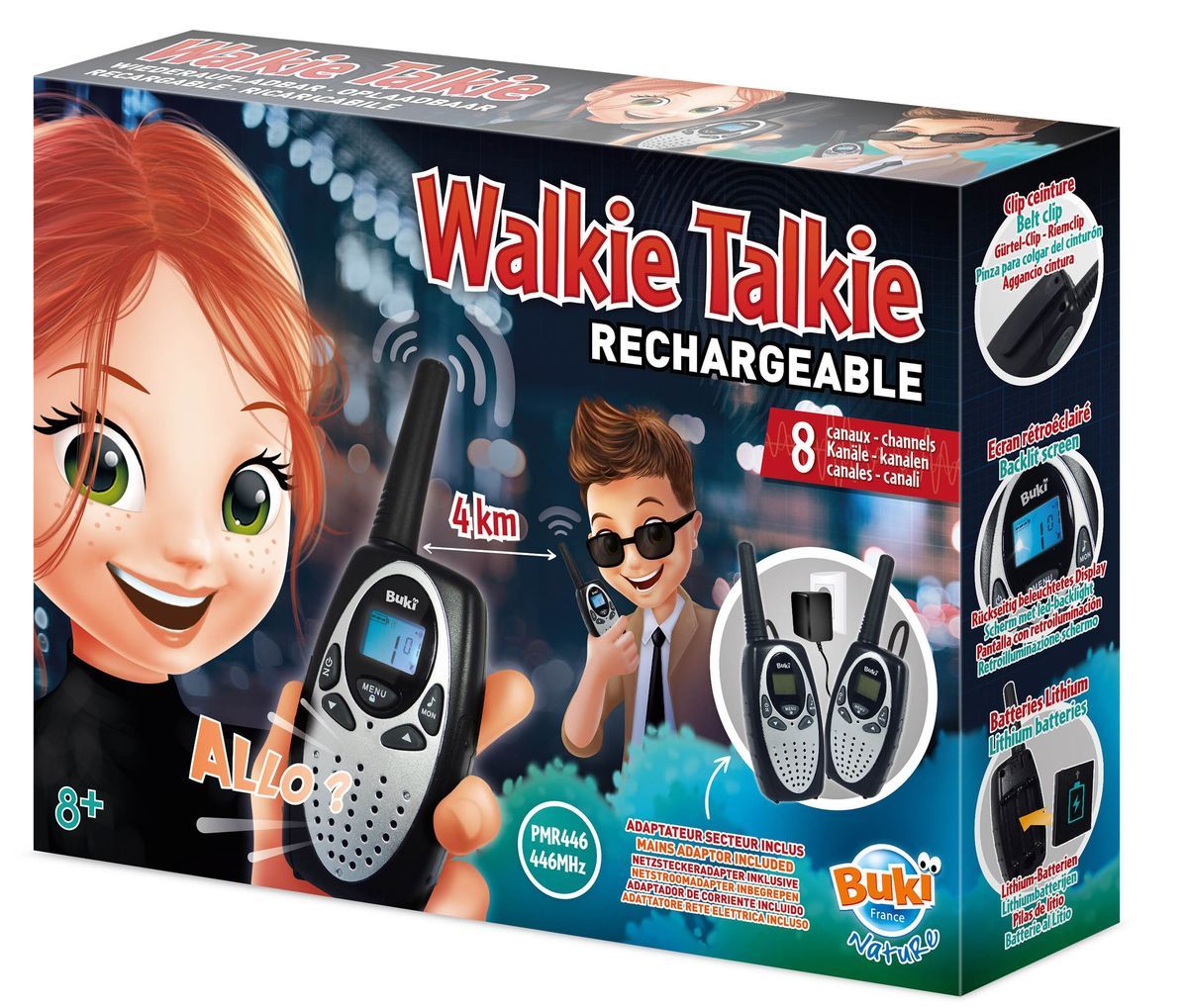 Buki Walkie Talkie, 8 kanalen, bereik max. 4 Km, oplaadbaar lithium-ion batt.