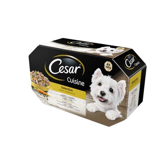 Cesar Cuisine Multipack bevat 4 x 150 g met de smaken kalkoen-rund, gevogelte, rund en lam.