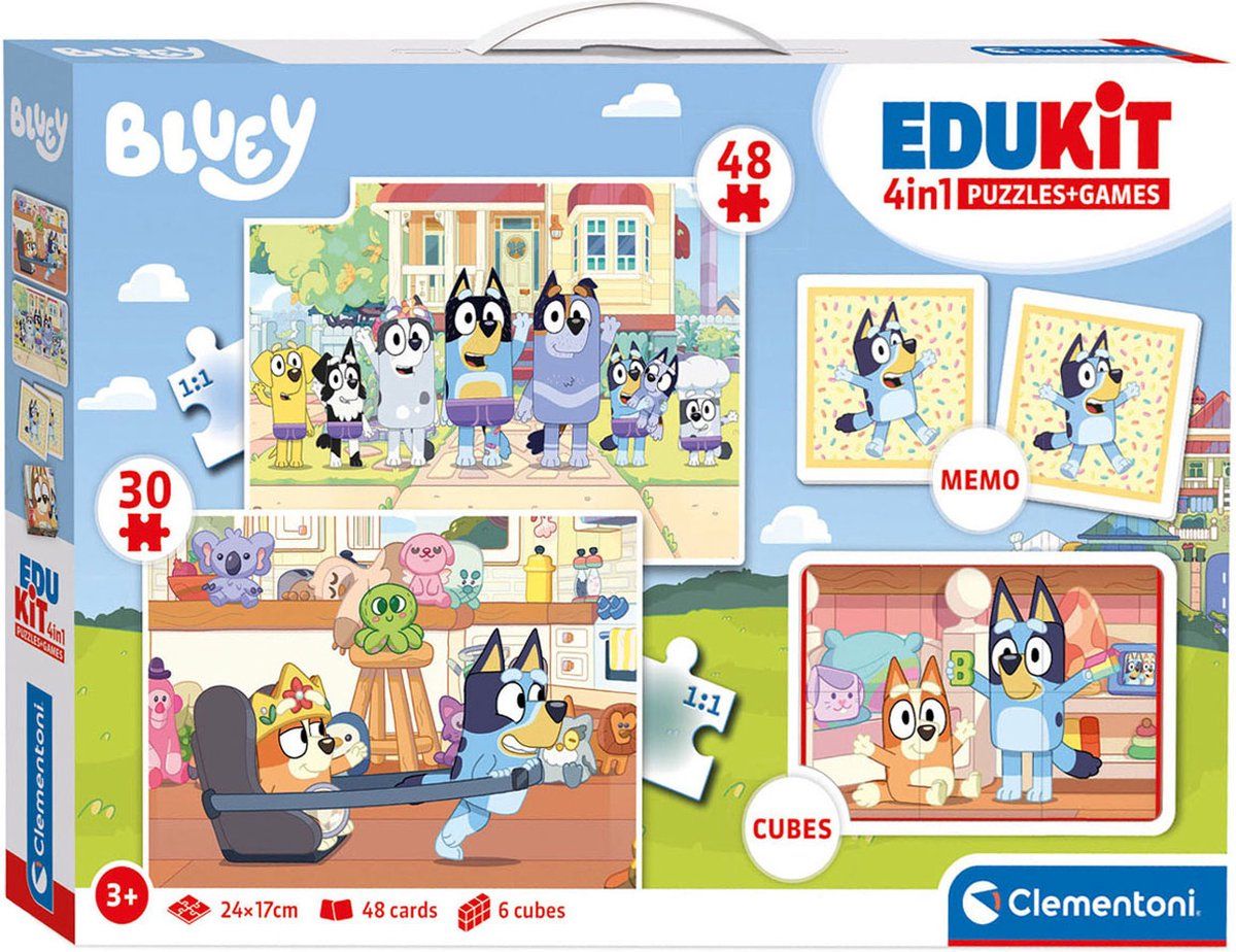 Clementoni Edukit 4 in 1 Bluey 2 Memo, Cubus puzzel, 2 Puzzels