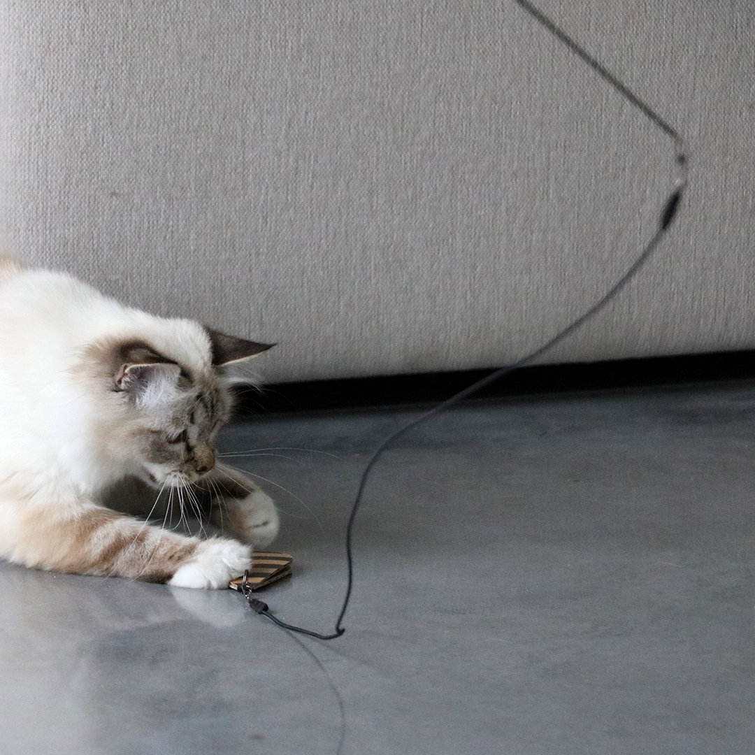 De CONNOR van D&D Home | I LOVE Happy Cats is ontworpen in samenwerking met kattengedragstherapeut Anneleen Bru en is het ultieme jachtspeeltje voor Happy Cats. De 97cm lange telescopische en flexibele hengel is voorzien van een 90cm lange koord en een kartonnen vliegende prooi. Die prooi vliegt en klinkt net als een echte vogel! Dit spel houdt de kat fit en verlaagt stress. Dit CONNOR-speeltje wordt gebruikt voor de eerste van drie jachtfases: een prooi achternazitten! De tweede fase is het 'doden' van de prooi, de derde fase is het opeten ervan. Wat is het geheim om succes te hebben? Je kat mag de prooi niet vangen. Je kan de prooi in de lucht laten vliegen of over de vloer bewegen. Doe dit ongeveer 5 tot 7 keer per dag gedurende 2 tot 5 minuten. Zorg ervoor dat je kat niet begint te hijgen, want dan moet je langzamer tewerk gaan! Je kunt ook ander speeltjes aan de CONNOR hengel bevestigen. Happy Tip! Als het spelletje gedaan is, houd je de speeltjes veilig door ze ver weg in een gesloten doos of kast op te bergen.