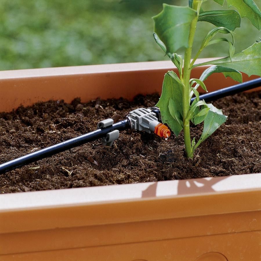 Met de Gardena Inline Druppelkop als onderdeel van het Gardena Micro-Drip-System kunnen plantrijen met vergelijkbare waterbehoefte, bijv. Balkonplanten, worden besproeid. De meegeleverde reinigingsnaald dient om een vuile druppelkop gemakkelijk schoon te maken.