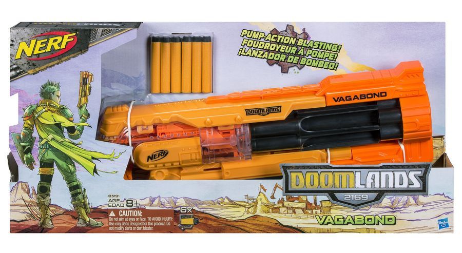 Met de NERF Doomlands Vagabond, heb je de nieuwe post-apocalyptische blaster in huis. De Vagabond is, samen met de Lawbringer (apart verkrijgbaar) 1 van de eerste blasters uit deze lijn. Met een super cool design met stukken waarbij de plastic doorzichtig is zodat je de binnenkant kan zien en een handig handvat
