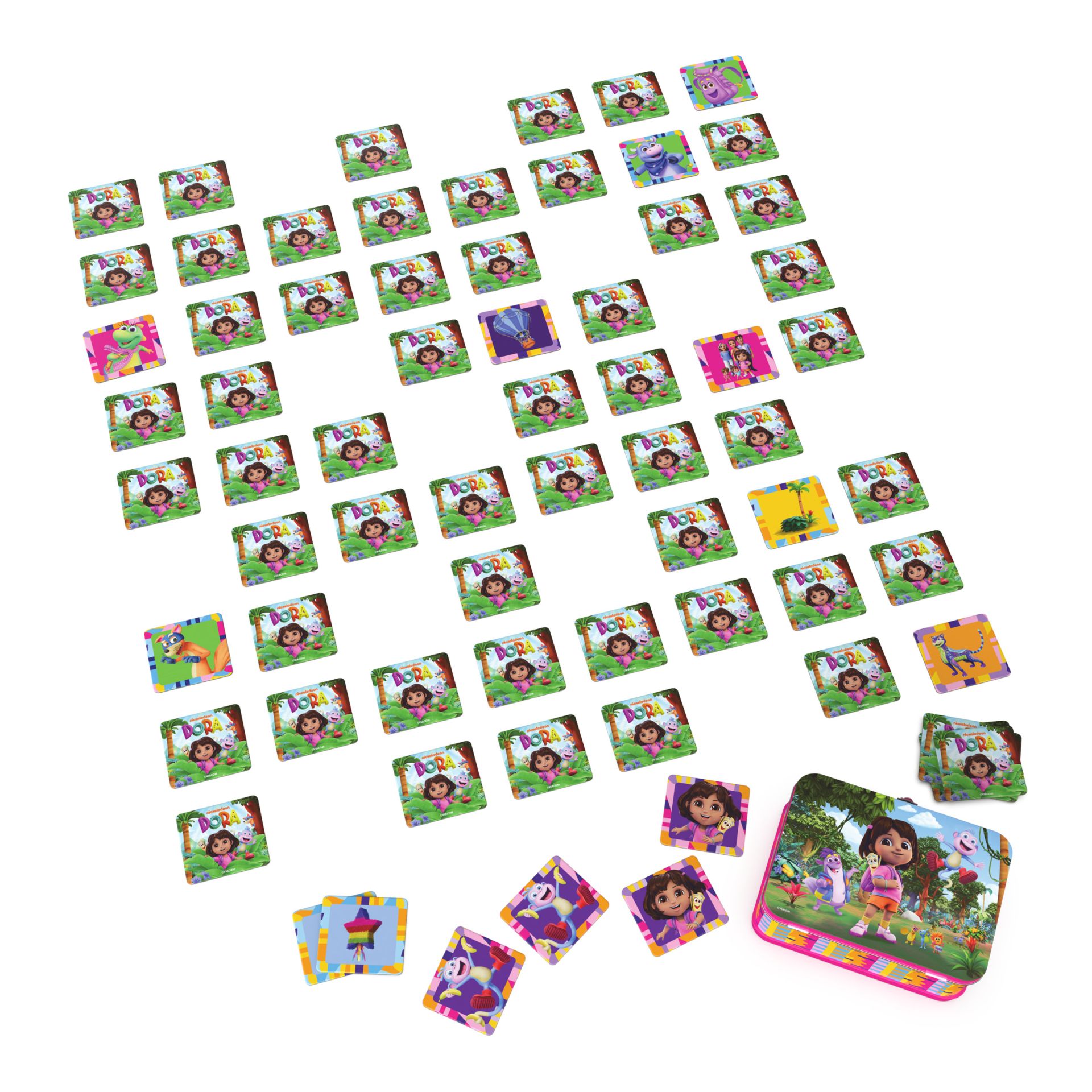 Test je geheugen met de favoriete personages van Dora. Om te winnen, moet je de speler zijn met de meeste paren nadat alle kaarten zijn omgedraaid. Dit is een eenvoudig te spelen en leerzaam spel voor 2-4 spelers van 4 tot 8 jaar. Dit bordspel voor kinderen bevat kaarten met illustraties uit de serie, een gebruiksaanwijzing en een klein handig draagbaar koffertje om het in mee te nemen. Het is ook een perfect familiespel voor een spelletjesavond.