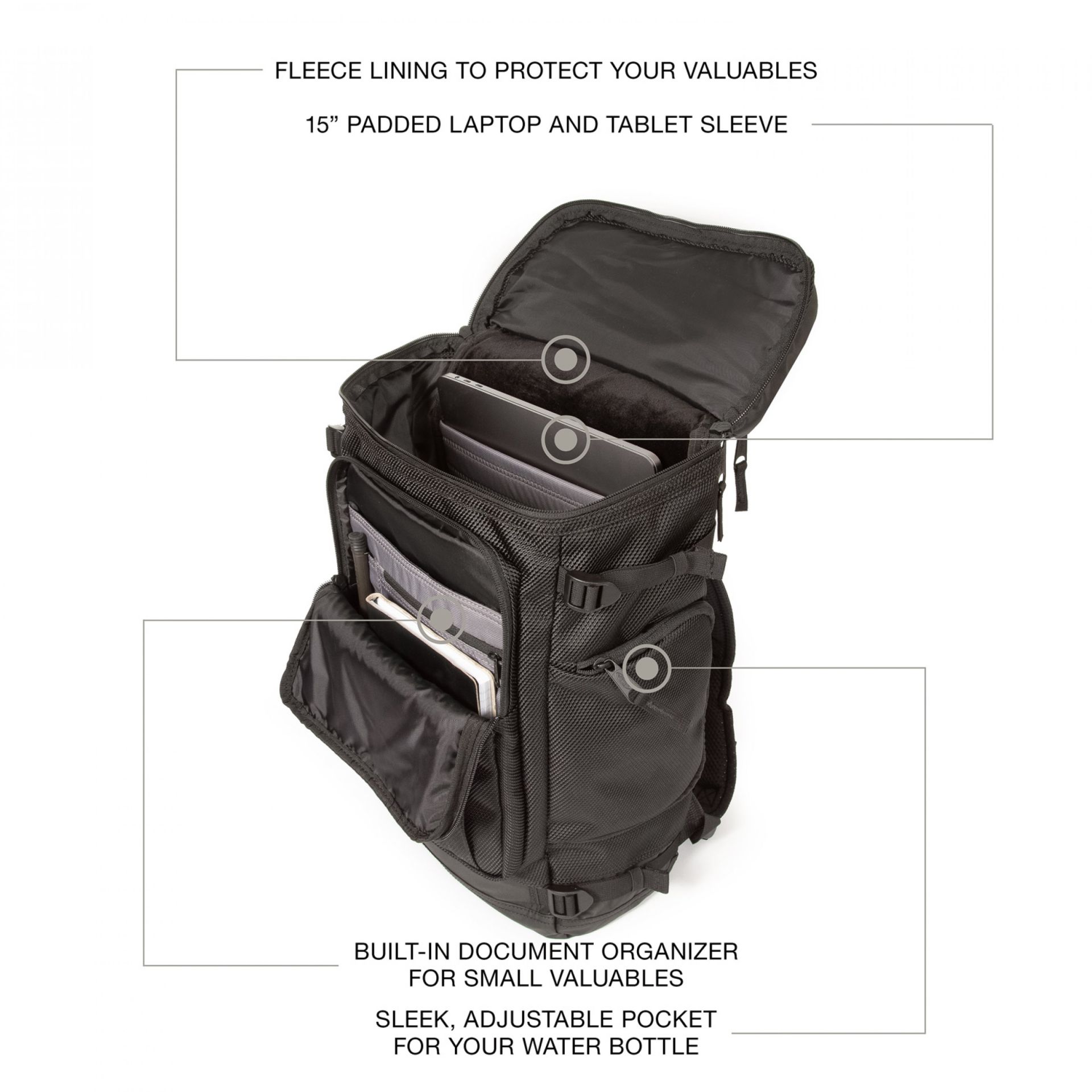 • Groot hoofdvak aan de bovenkant met aparte sloten om je tech veilig op te bergen