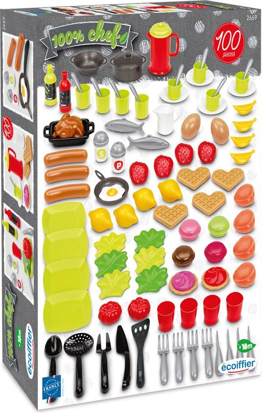 Ecoiffier 100% Chef Doos met eten en servies, 100 delig