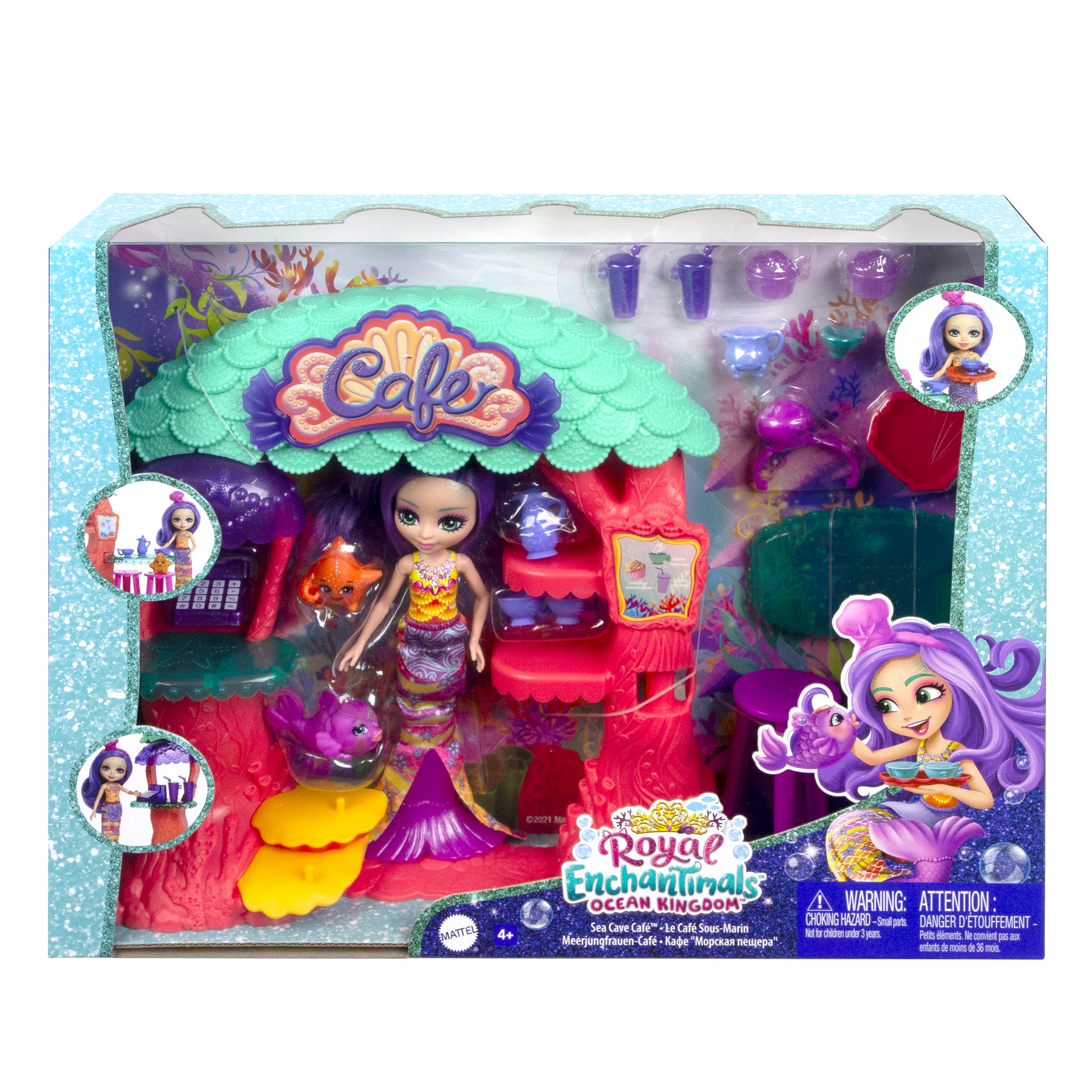 Kom naar het Enchantimals Zeegrotcafé voor een verfrissende traktatie! Met deze speelset met meer dan 15 onderdelen kunnen kinderen Martina de Zeemeermin helpen in het populairste café van het onderwaterrijk. Deze café-set (22,4 cm) bestaat uit een keuken, een toonbank, krukken en een betaalgedeelte. Accessoires zoals kommen, drankjes, een schelpenblad en een kassa prikkelen de fantasie. Kinderen kunnen Martina de Zeemeermin helpen bij het serveren van lekkere snacks voor haar vissen- en zeesterrenvriendjes. En wat zie als je de staart van Martina de Zeemeermin verwijdert? Haar voeten! Kleuren en versieringen kunnen afwijken.