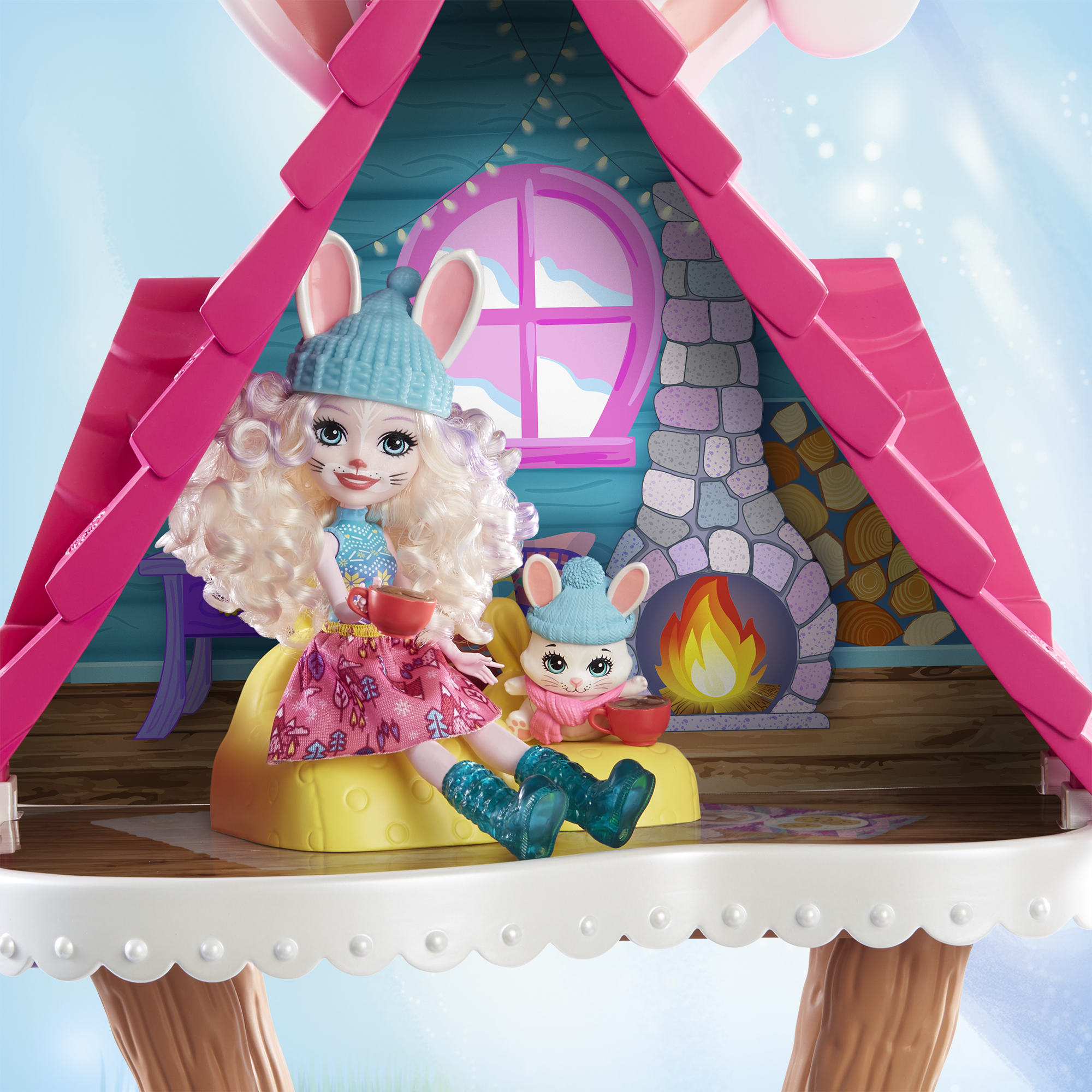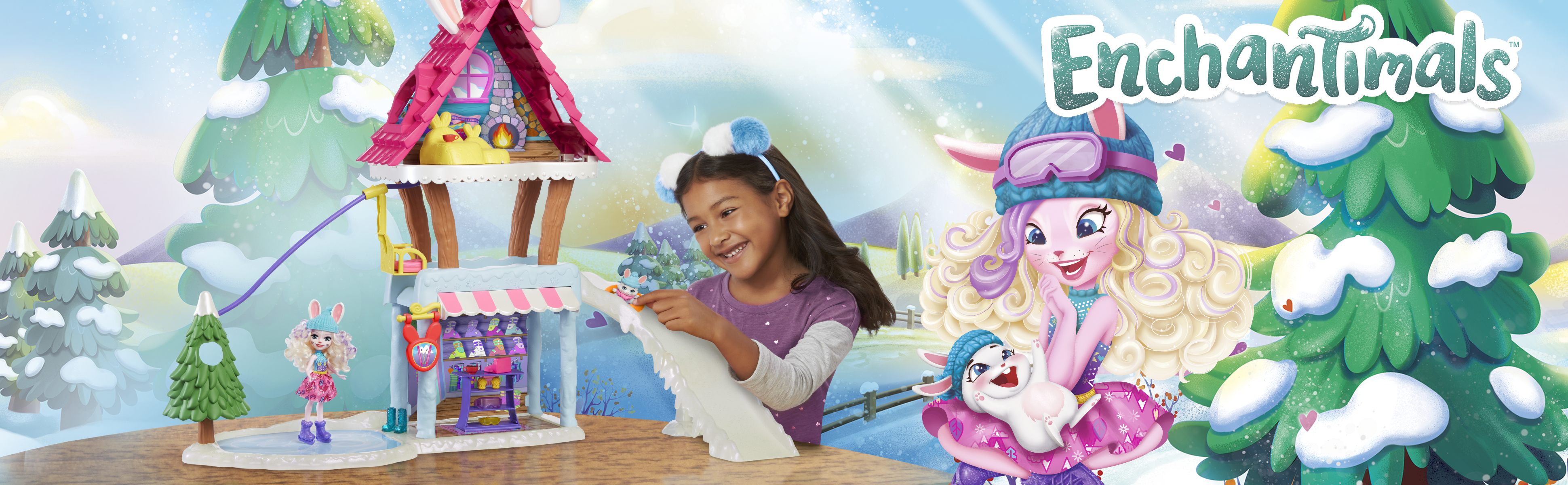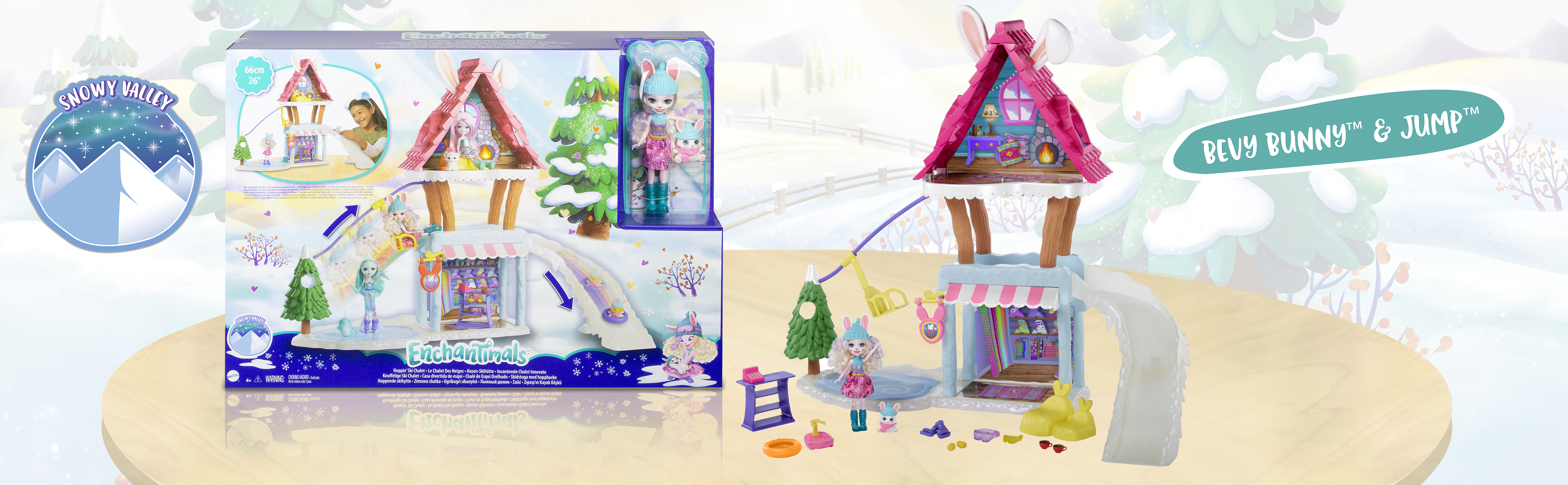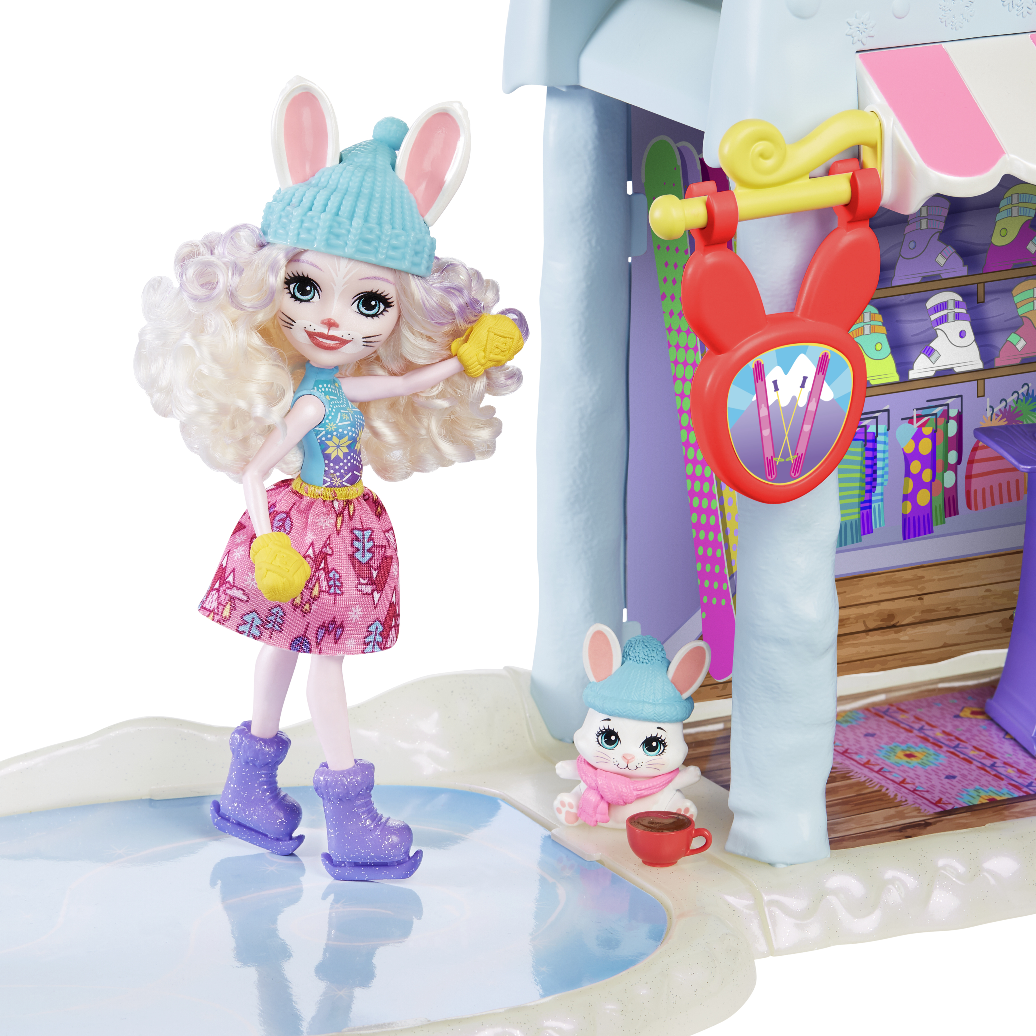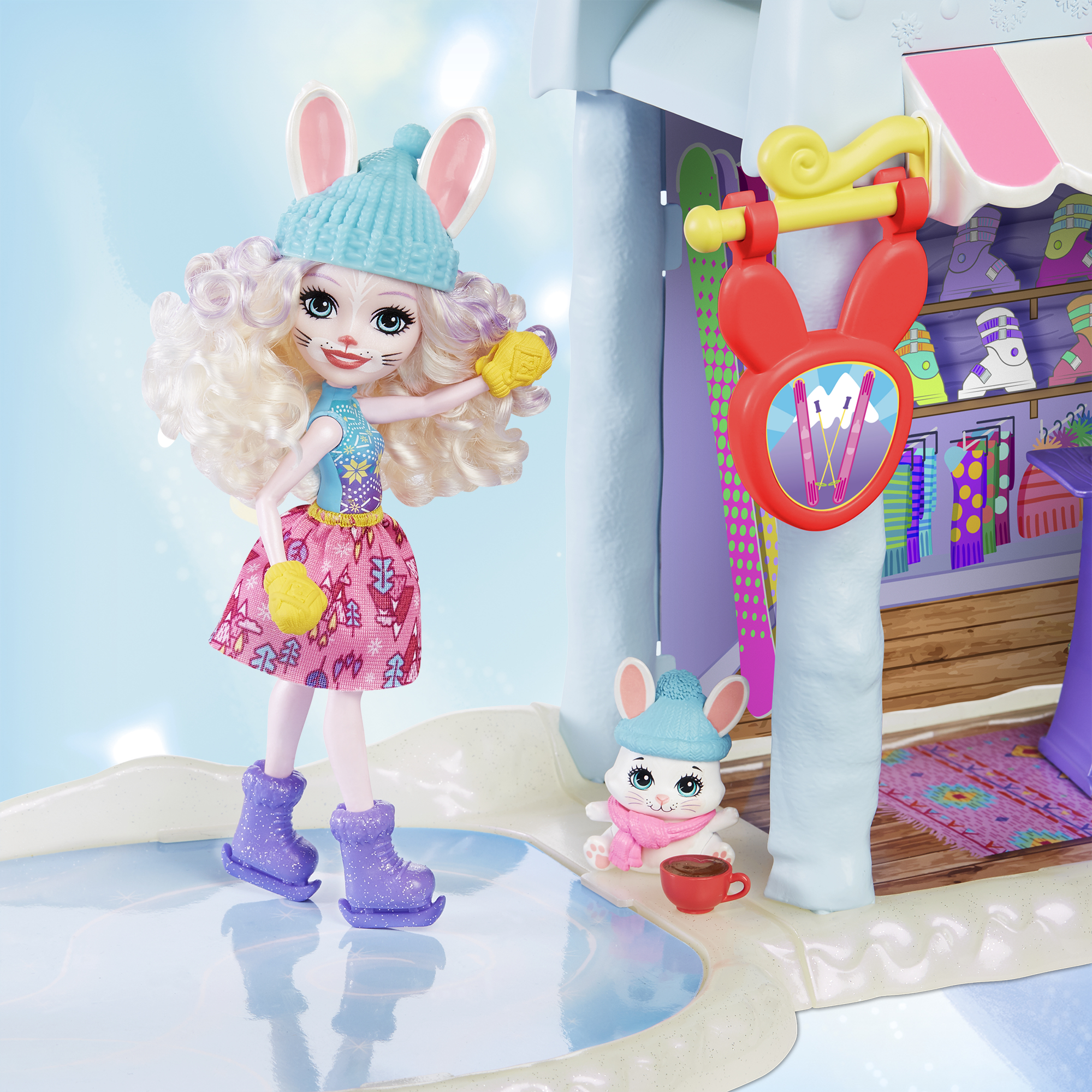Ga naar de helling en de ijsbaan met je Bevy Bunny-pop en Bunny Jump Bunny - de Winter Hut geïnspireerd door de Enchantimals-filmavonturen zullen je helpen!