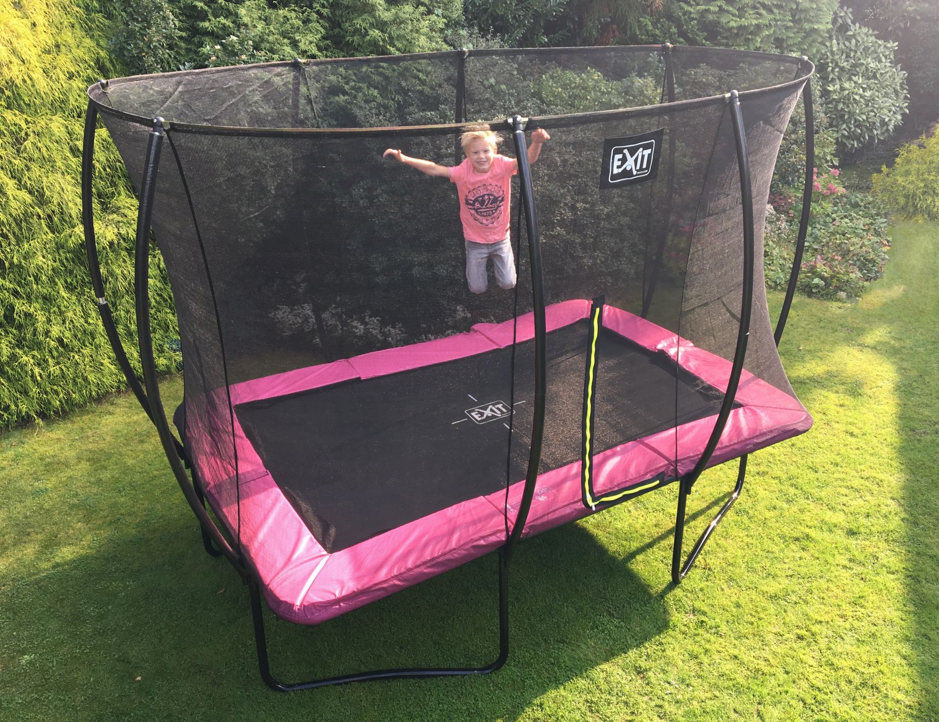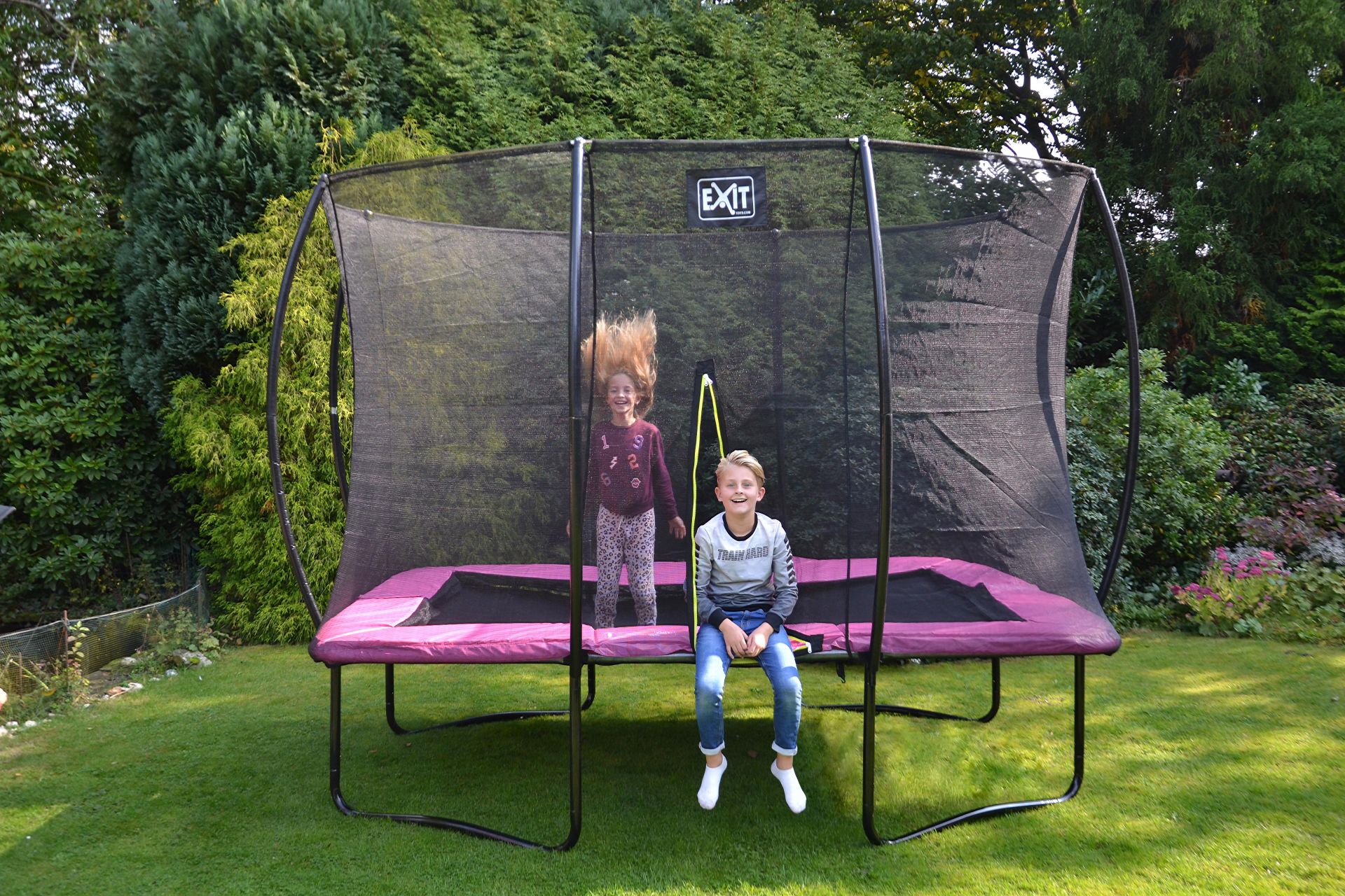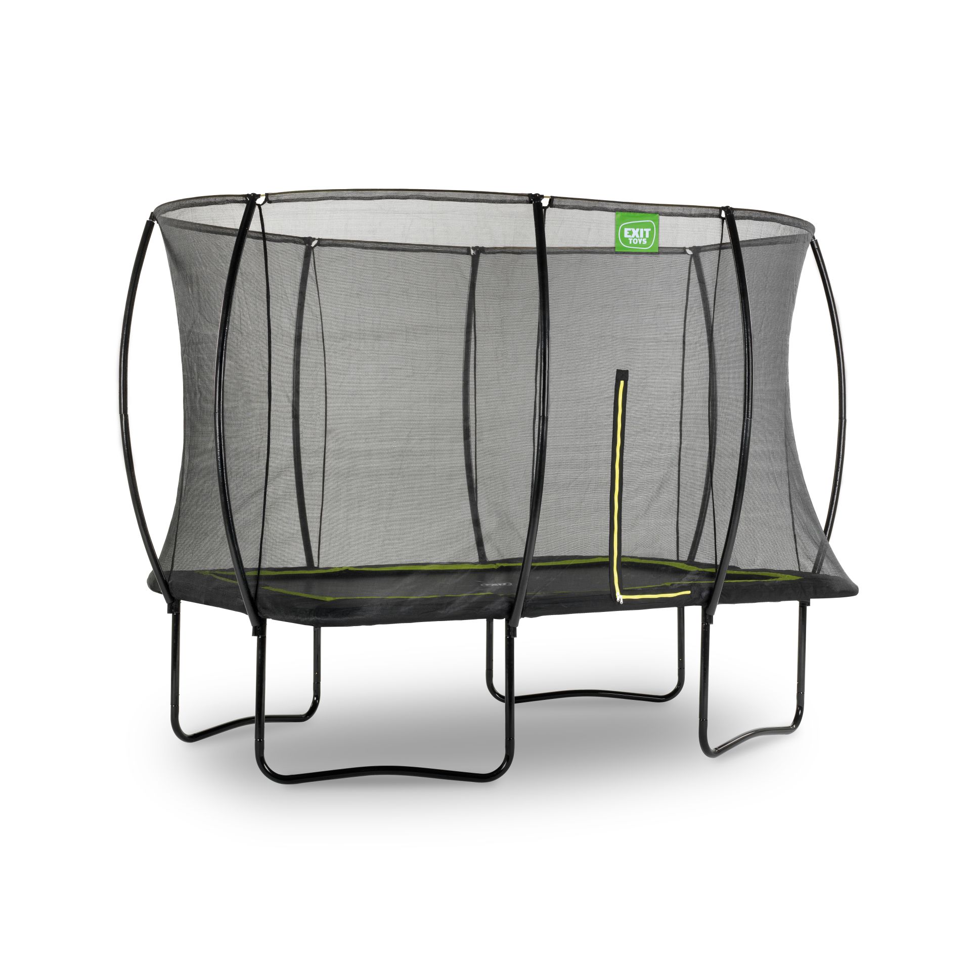 In deze zwarte EXIT Silhouette trampoline (3,66 x 2,44 m) met veiligheidsnet kunnen kinderen op een veilige manier springplezier beleven!