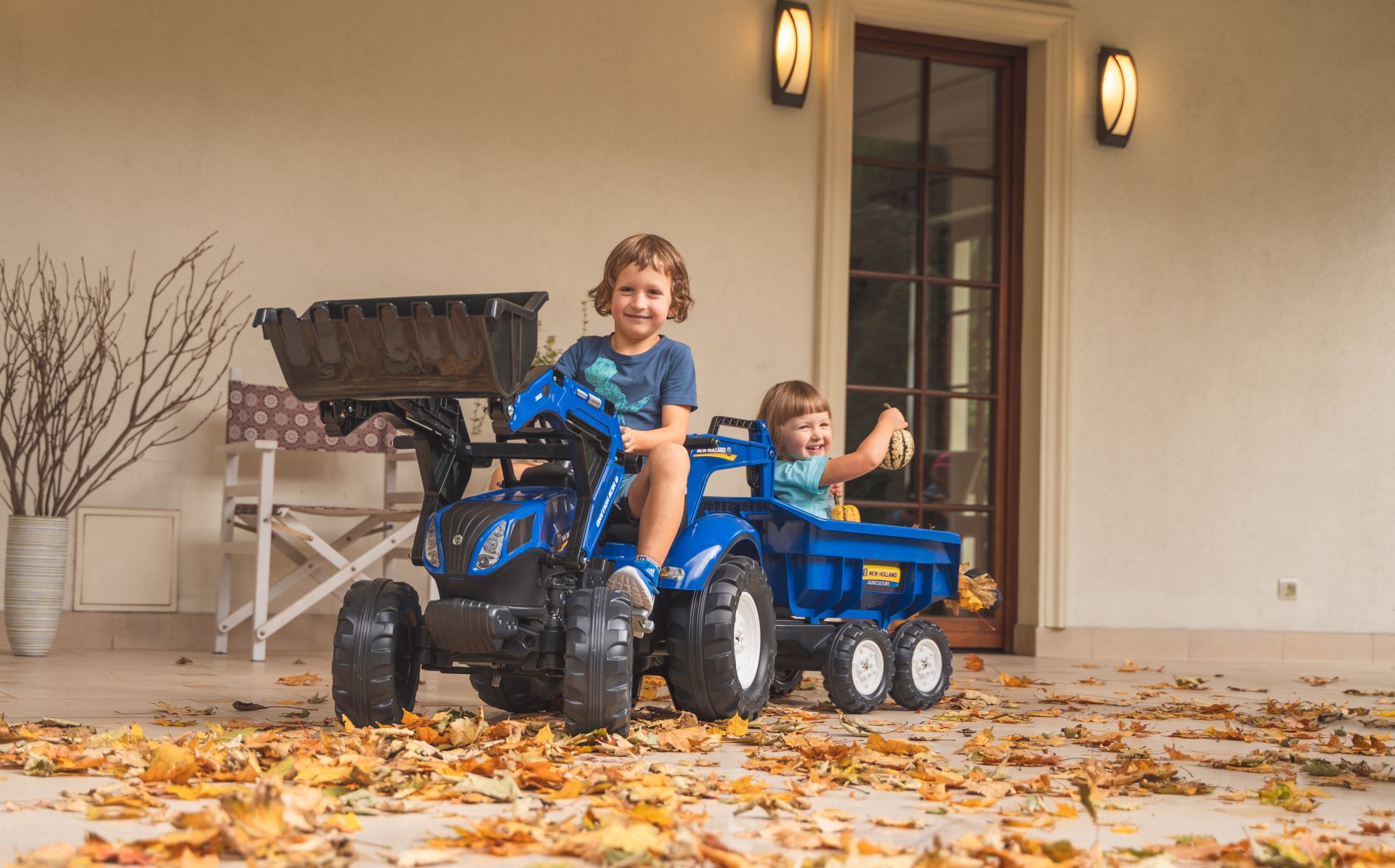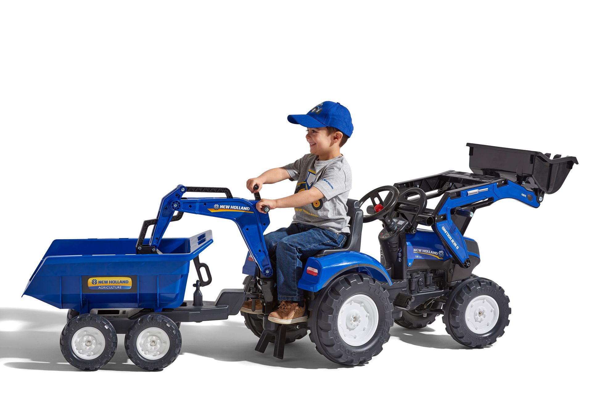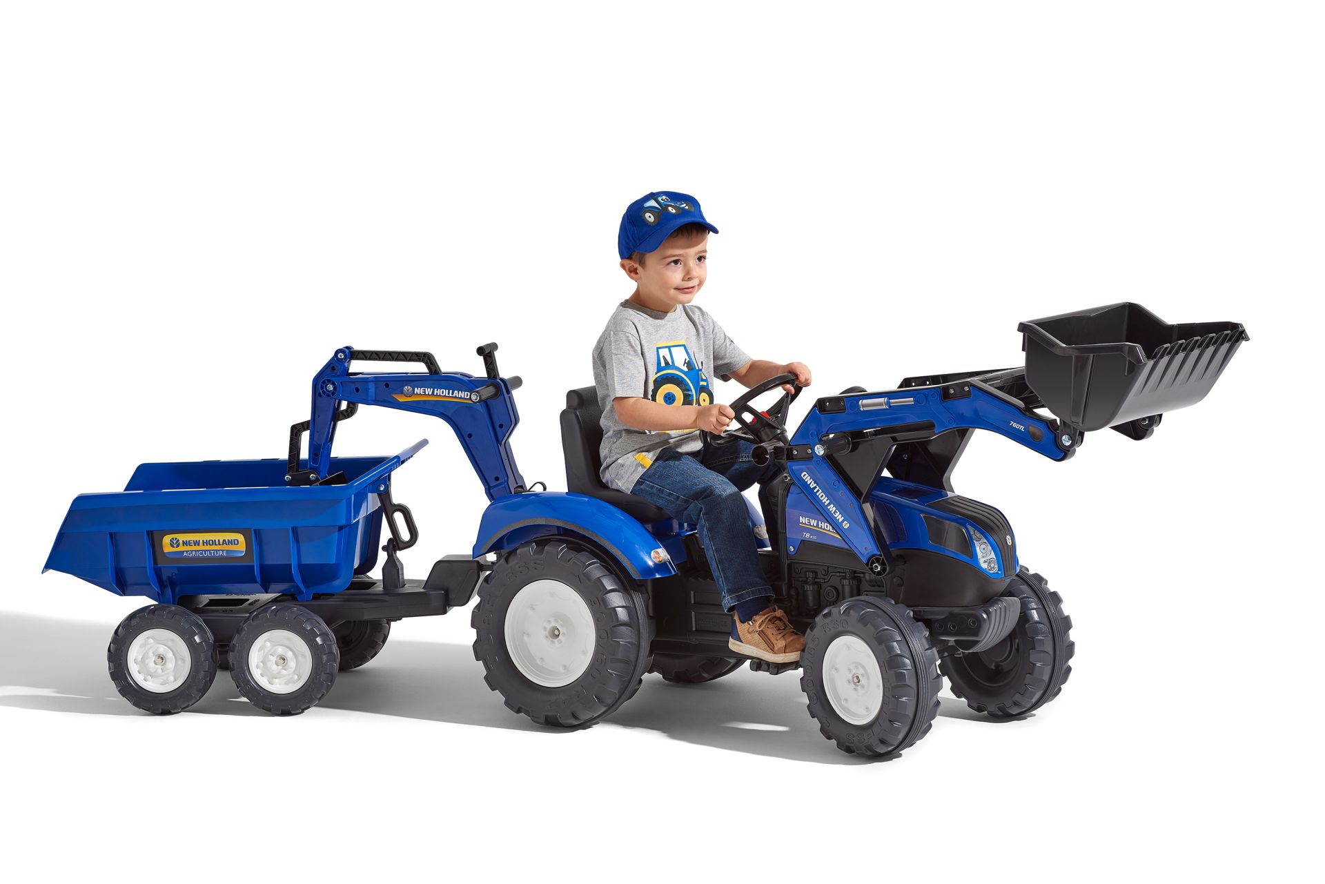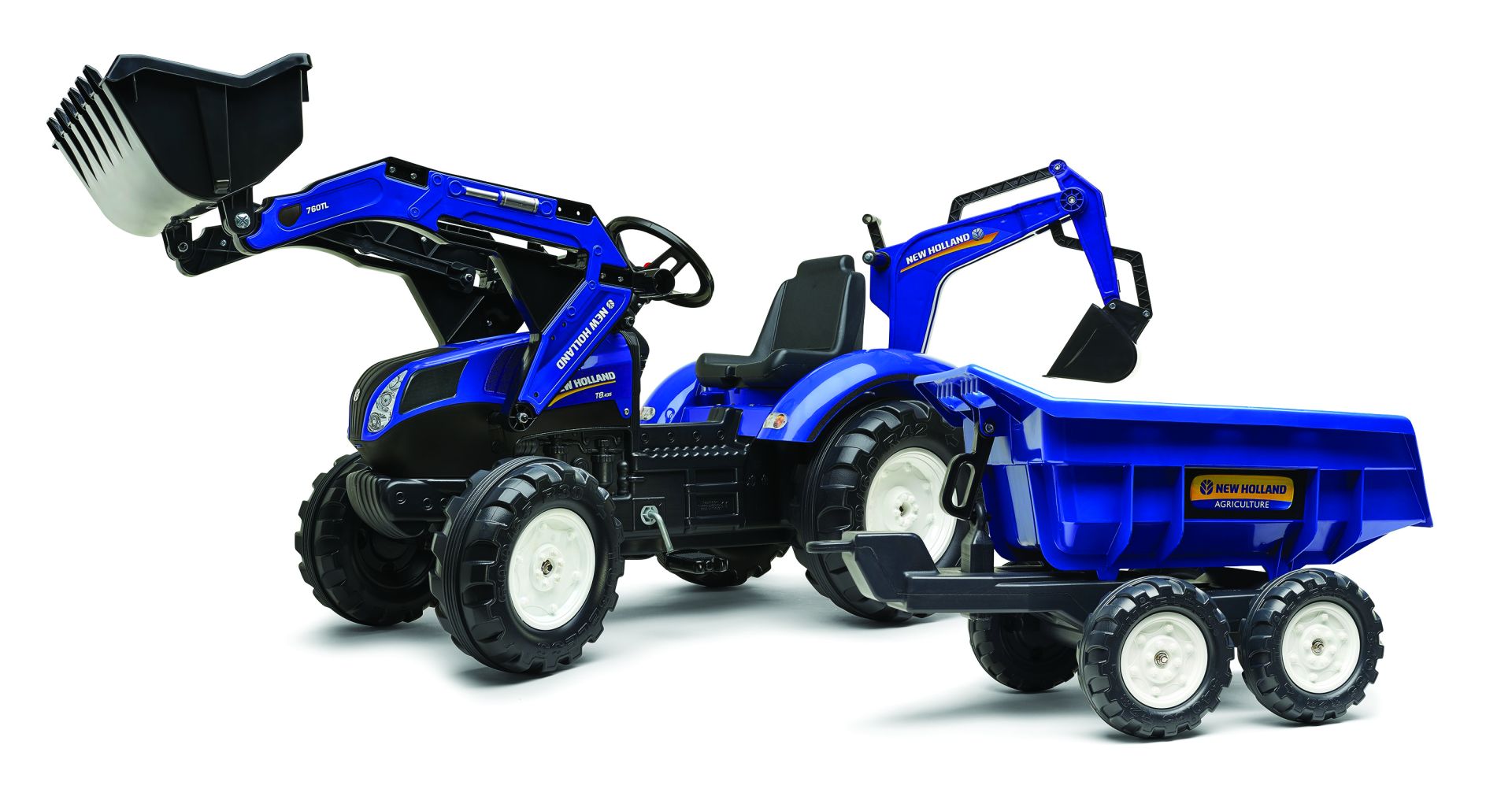 Falk New Holland T8 Pedaaltractor Blauw met Voorlader, Graafarm en Aanhangwagen